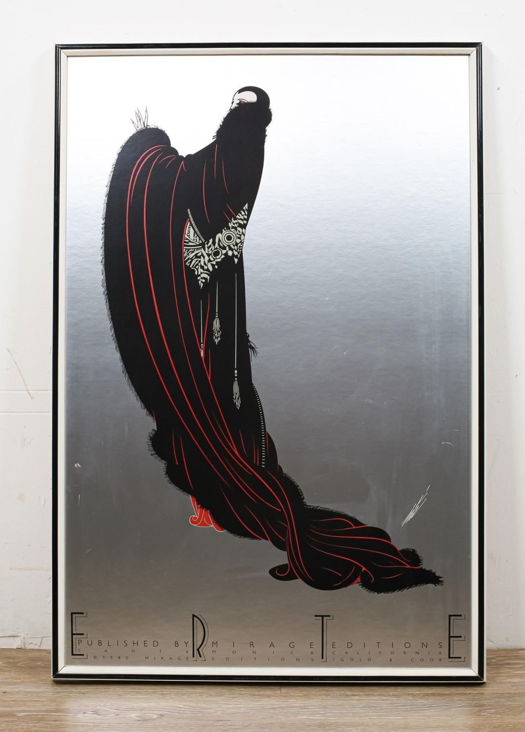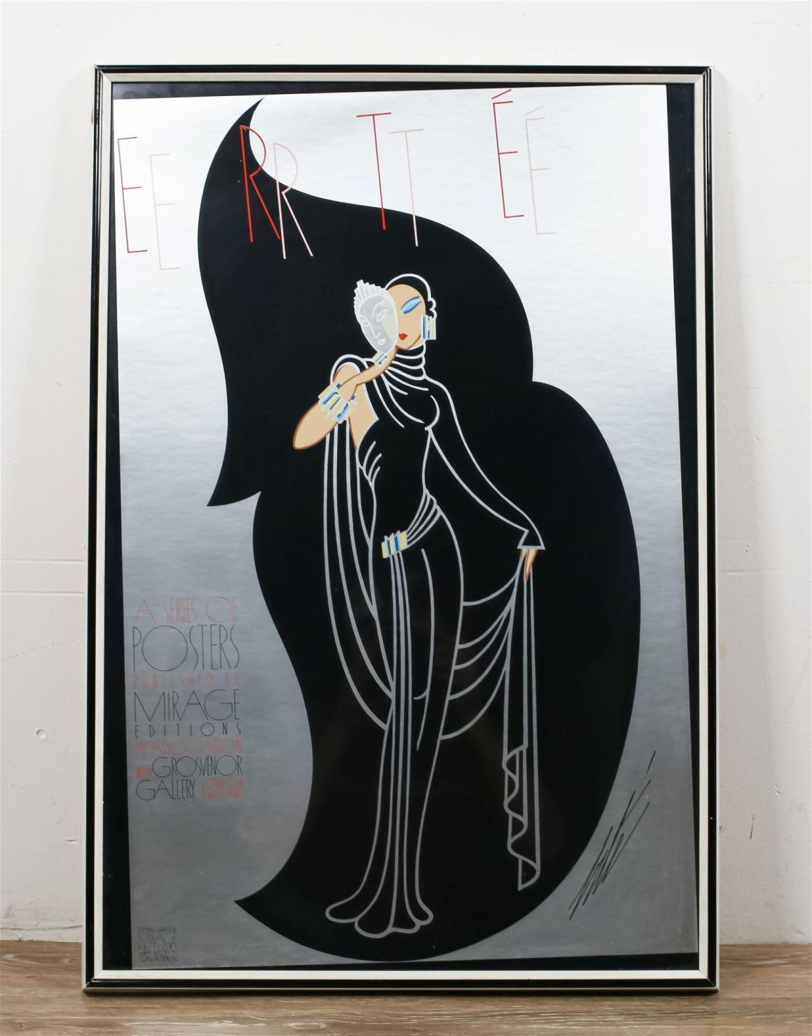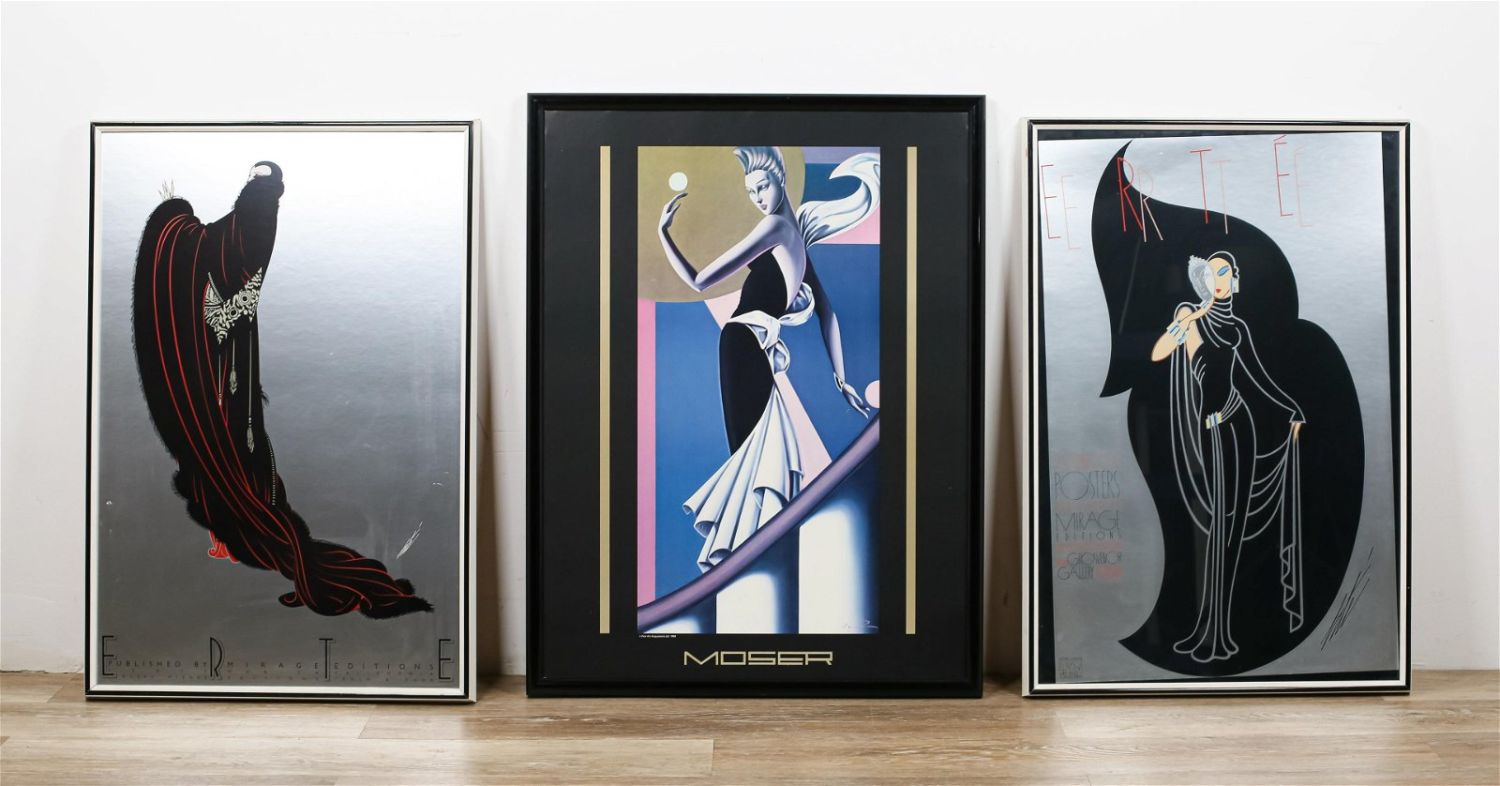 2 Erte framed posters, published by Mirage Editions – 1980. 1 with glass. 1 Moser framed poster "New Heroicism" published by Fine Art Acquisitions Ltd. 1984 with no glass.