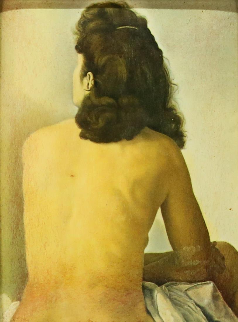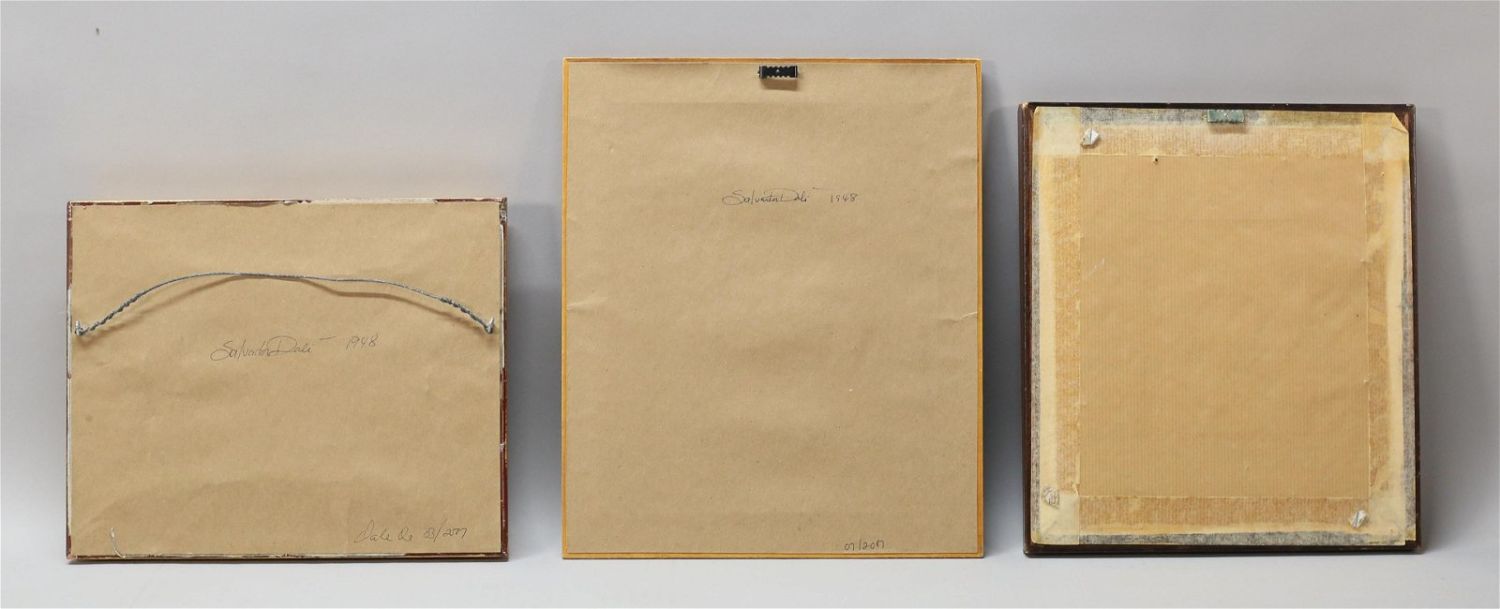 After Salvador Dali (Spain, 1904-1989). 3 prints. Cover illustration from The Autobiography of Benvenuto Cellini on red cloth, 2 1/2" x 4 1/2" (with frame 8 3/4" x 10 3/4"); Nude of Gala plaque, 4 3/4" x 3 5/8" (with frame 11 1/8" x 9 7/8"); The New World, signed and dated in the plate, 7 1/2" x 4 7/8" (with frame 12 1/4" x 10 1/4"). Scratches and losses to frame on plaque.