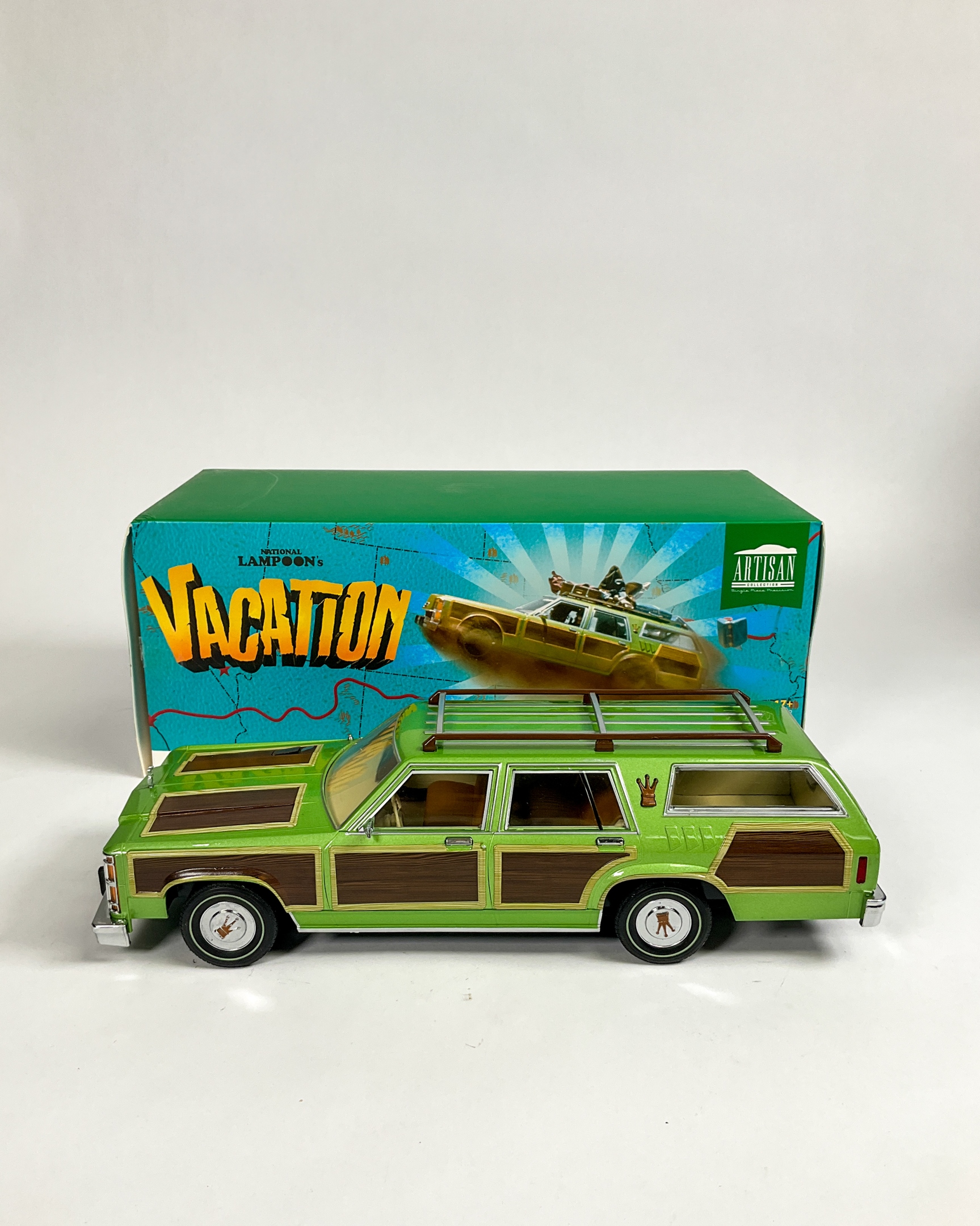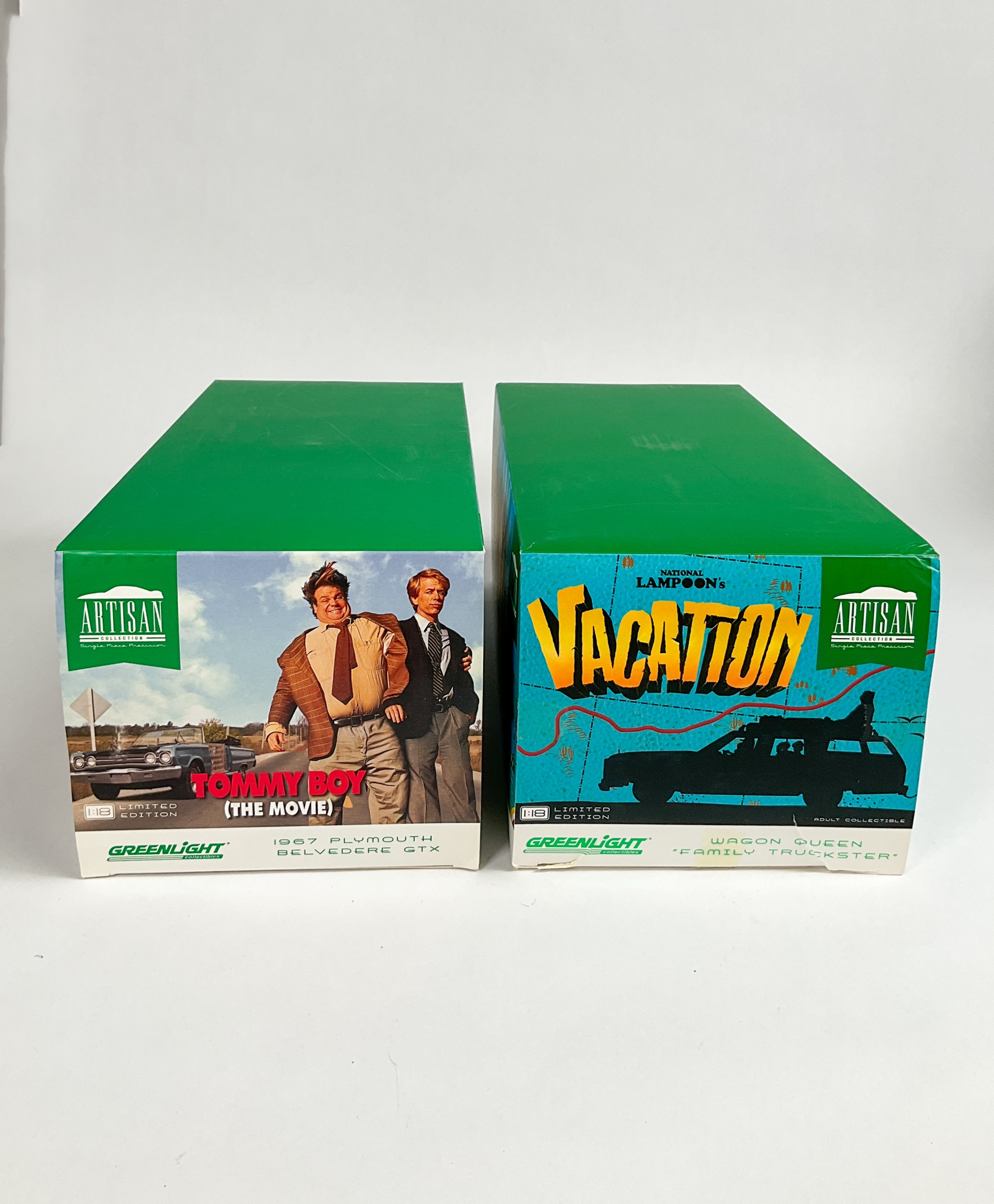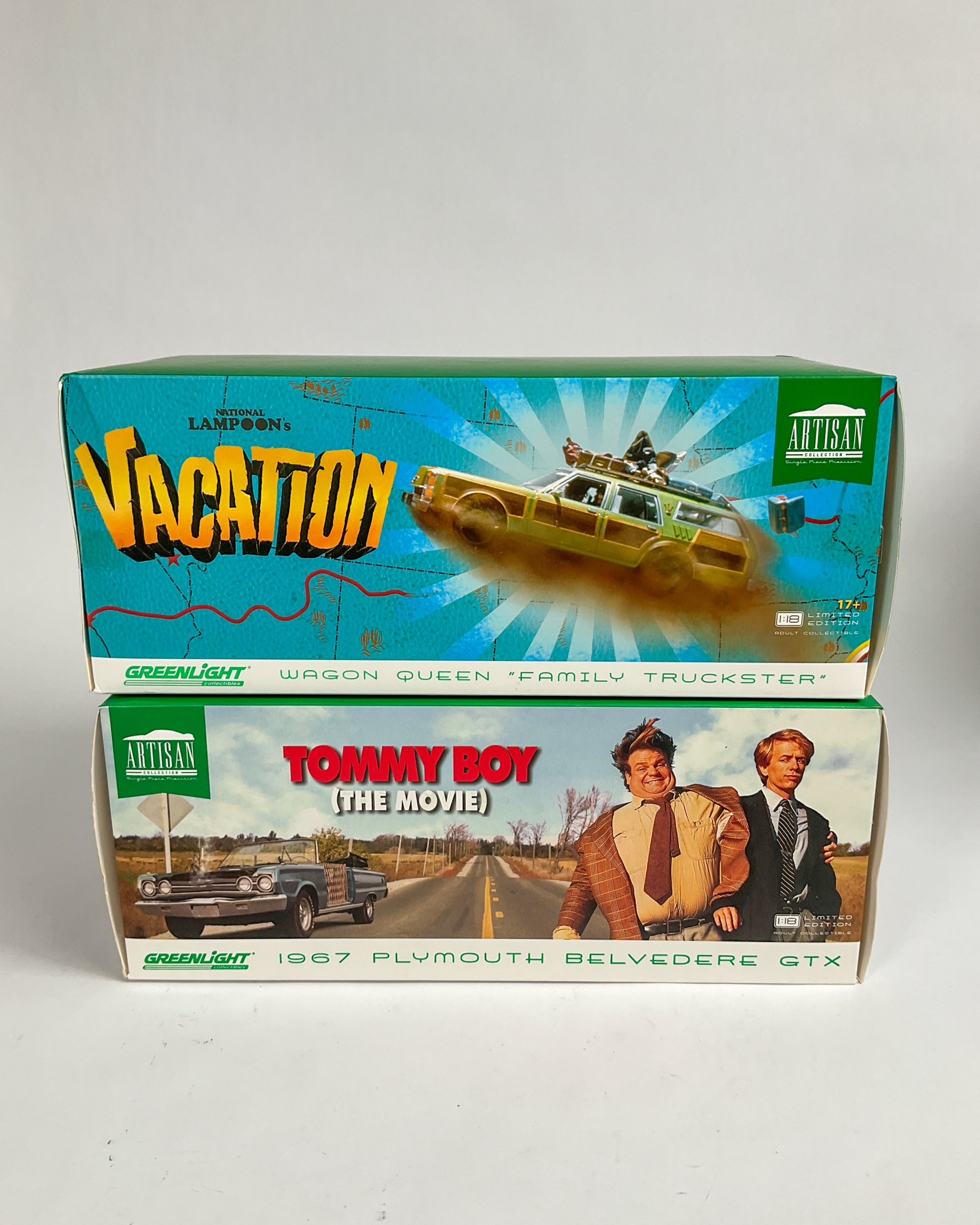 Two Greenlight Collectibles 1:18 scale vehicle replicas including Tommy Boy 1967 Plymouth Belvedere GTX and National Lampoon’s Vacation Wagon Queen Family Truckster. Tommy Boy GTX factory-sealed in original packaging. 5 1/2" H x 13 1/2" W x 6 1/2" D. Some creasing to original boxes.