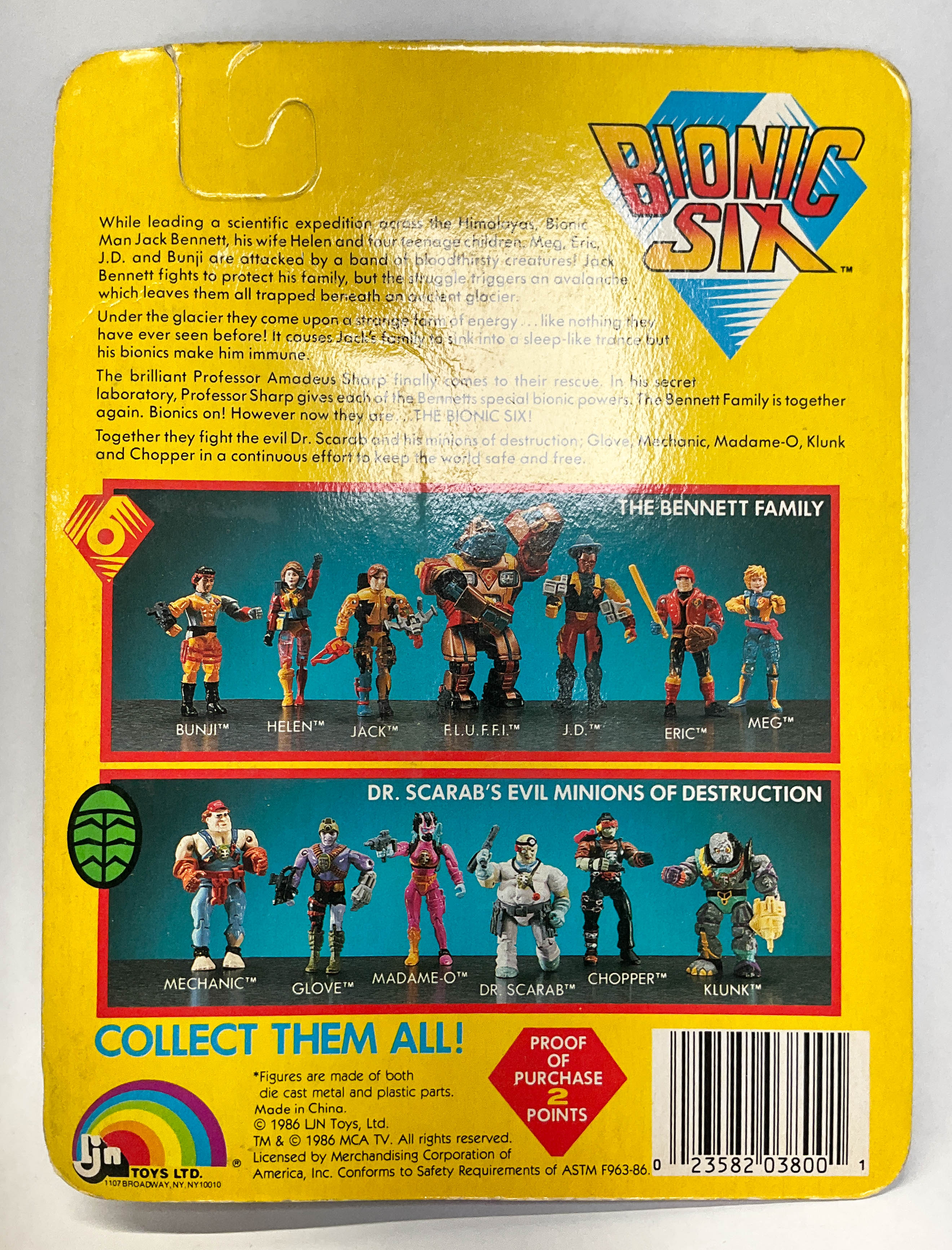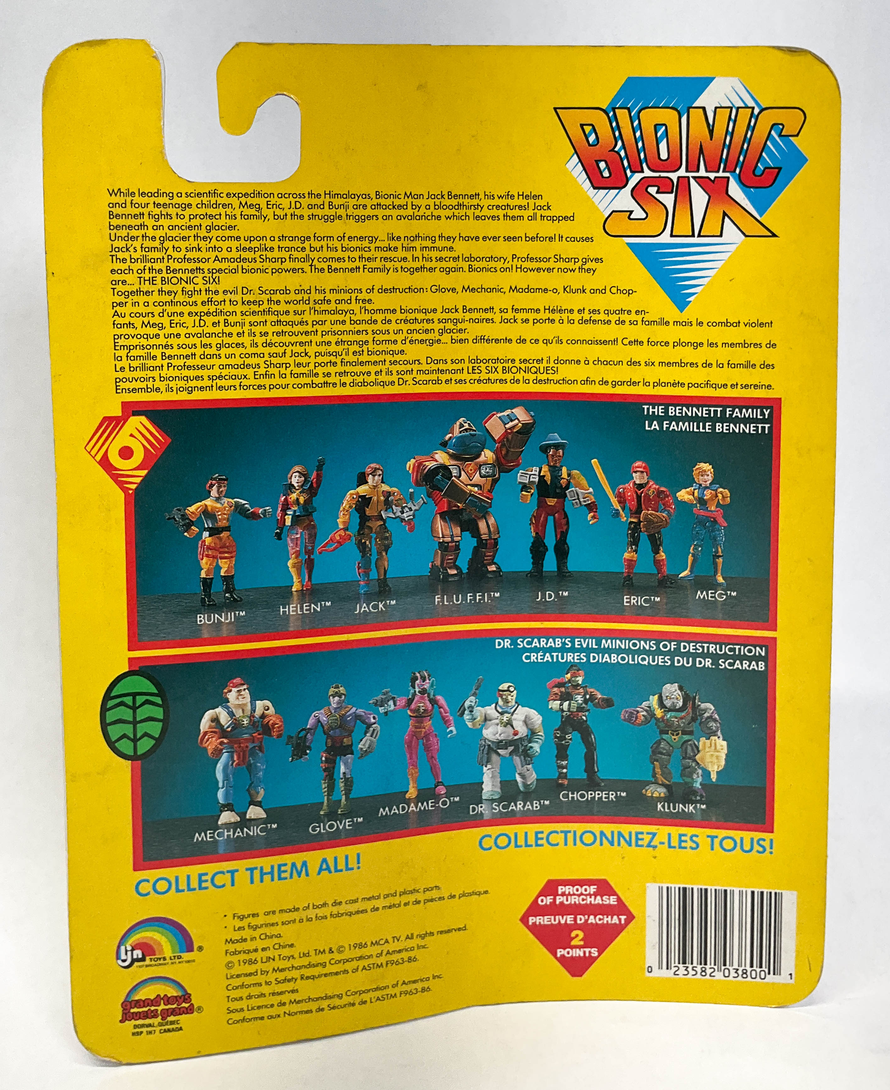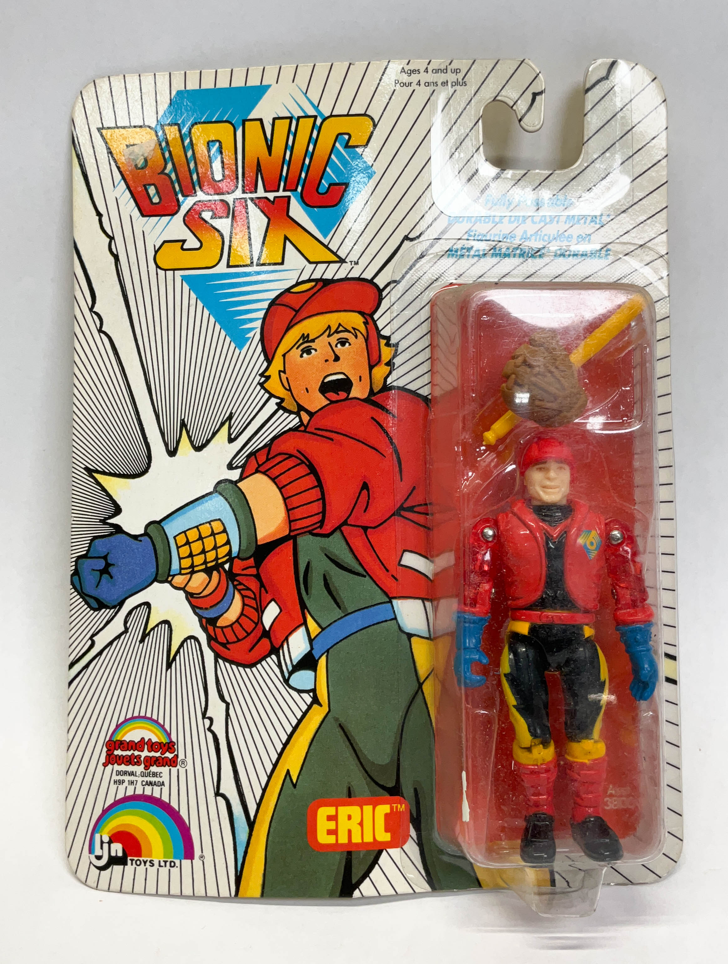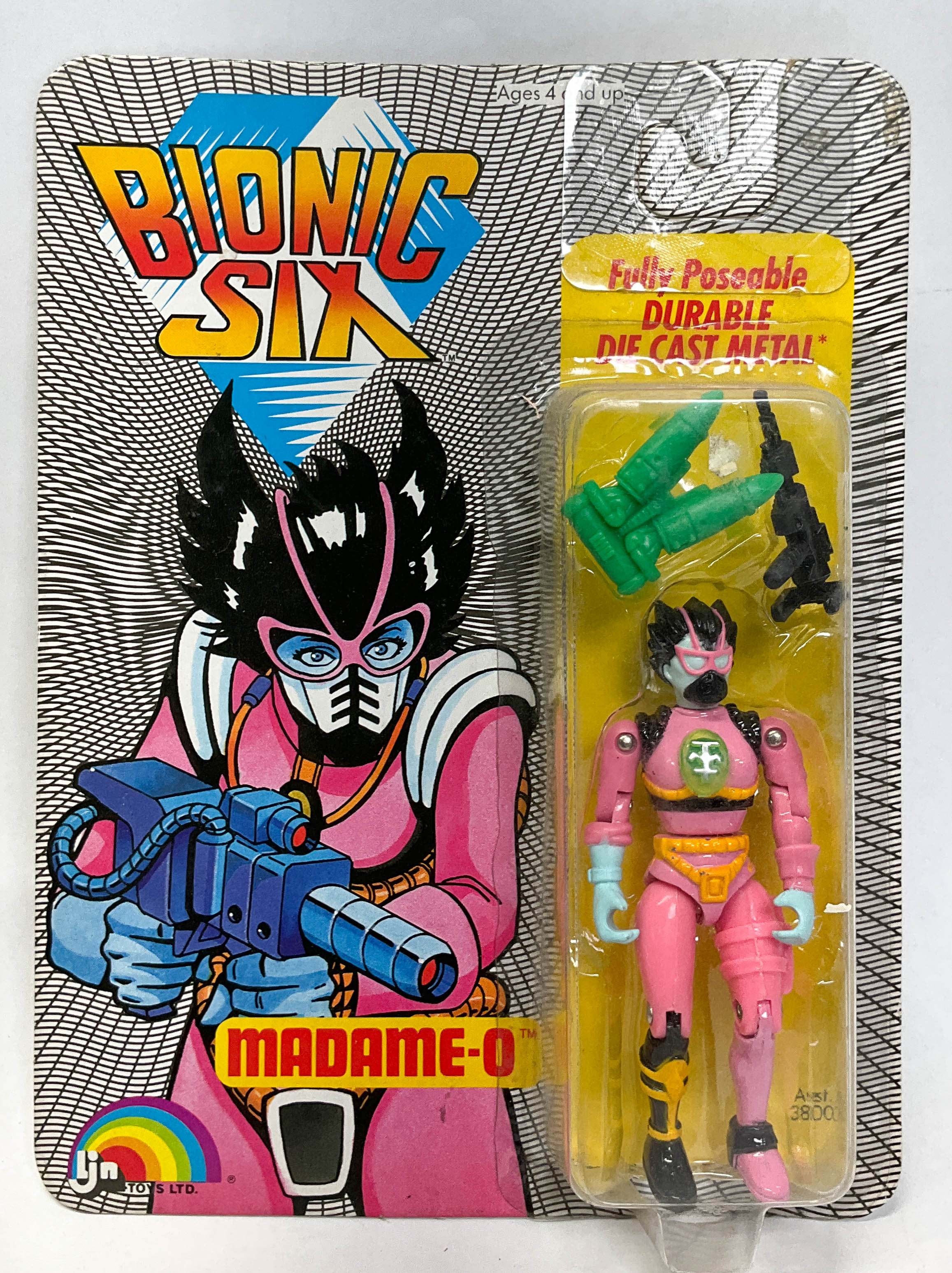 A collection of two vintage 1986 Bionic Six poseable action figures manufactured by LJN Toys Ltd. This lot features the characters Eric (The Bennett Family) and Madame-O (Dr. Scarab’s Evil Minions of Destruction). Both figures are constructed using the series’ signature combination of durable die-cast metal and plastic components. The Eric figure is presented on a bilingual English and French card back indicating distribution by Grand Toys of Canada and includes his character-specific baseball glove and bat. The Madame-O figure is on a standard US market card with an LJN New York address and includes her original green and black weaponry. Both items carry a 1986 copyright for MCA TV and were manufactured in China. These figures are highly sought after by collectors for their unique metallic weight and association with the popular 1980s animated series. Each card measures approximately 9 by 7 inches.