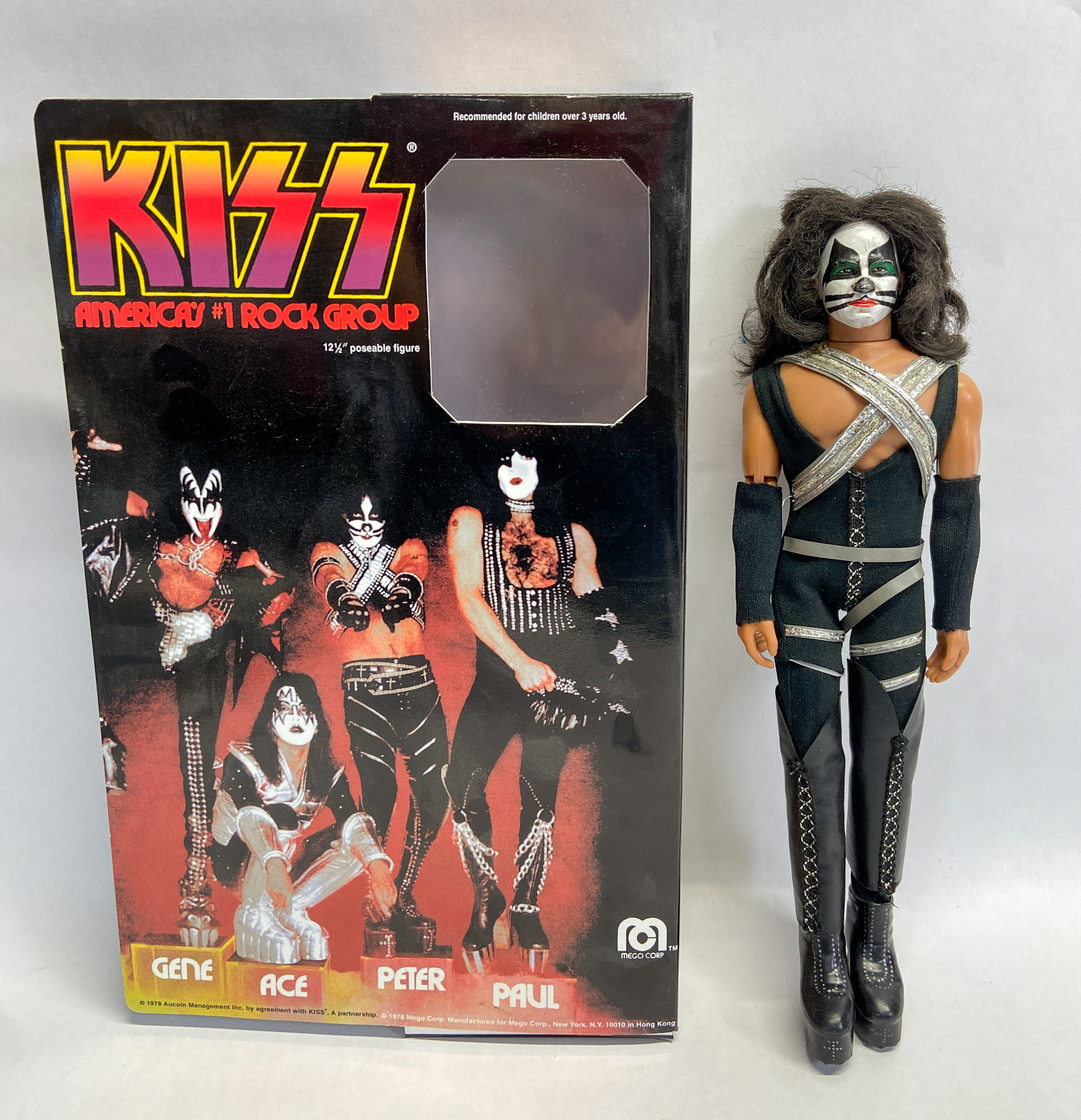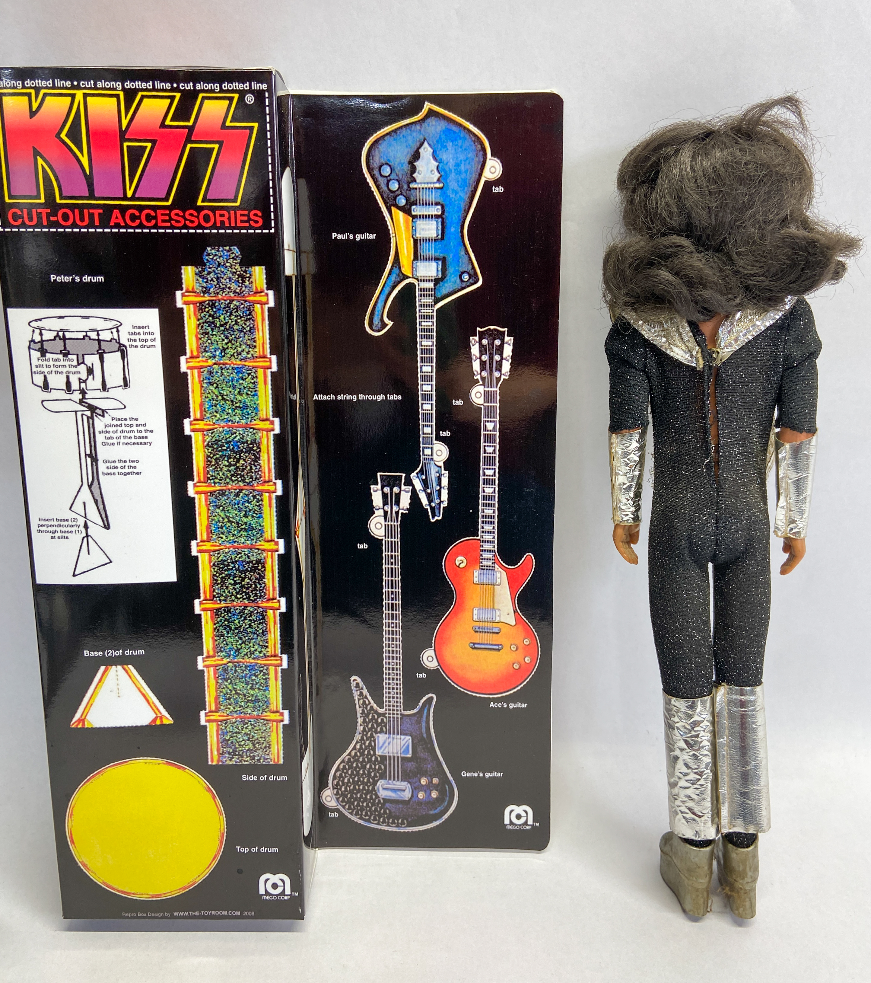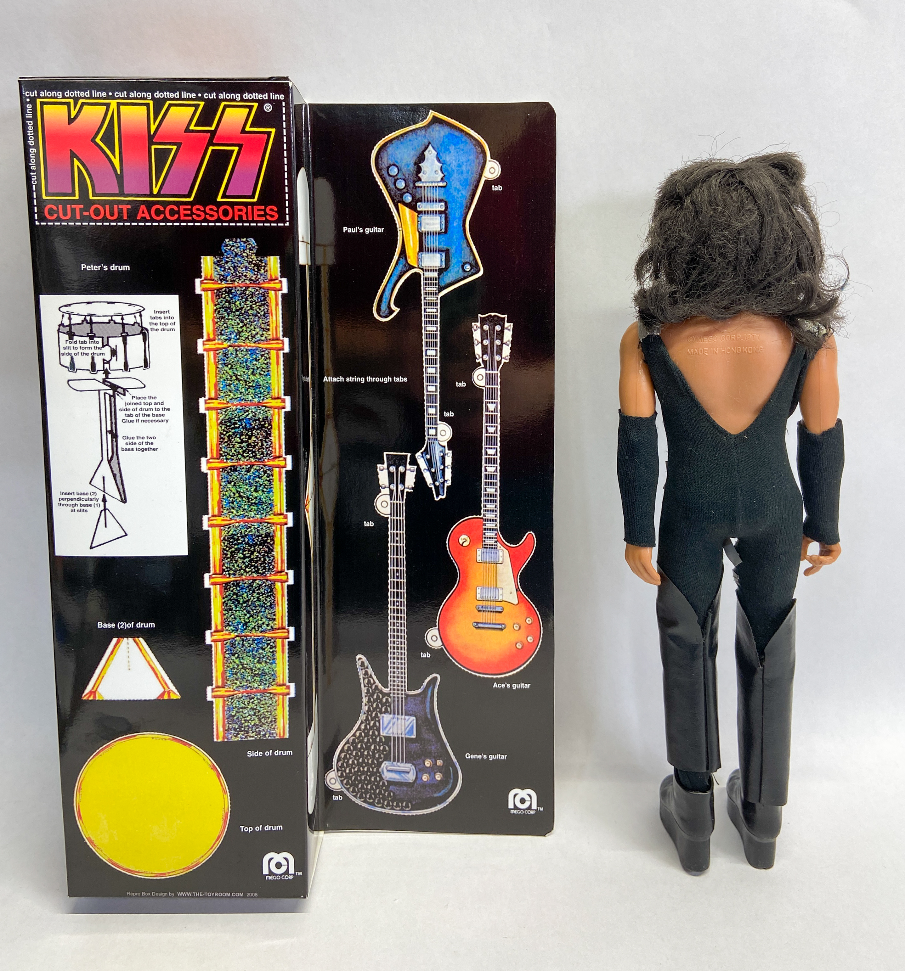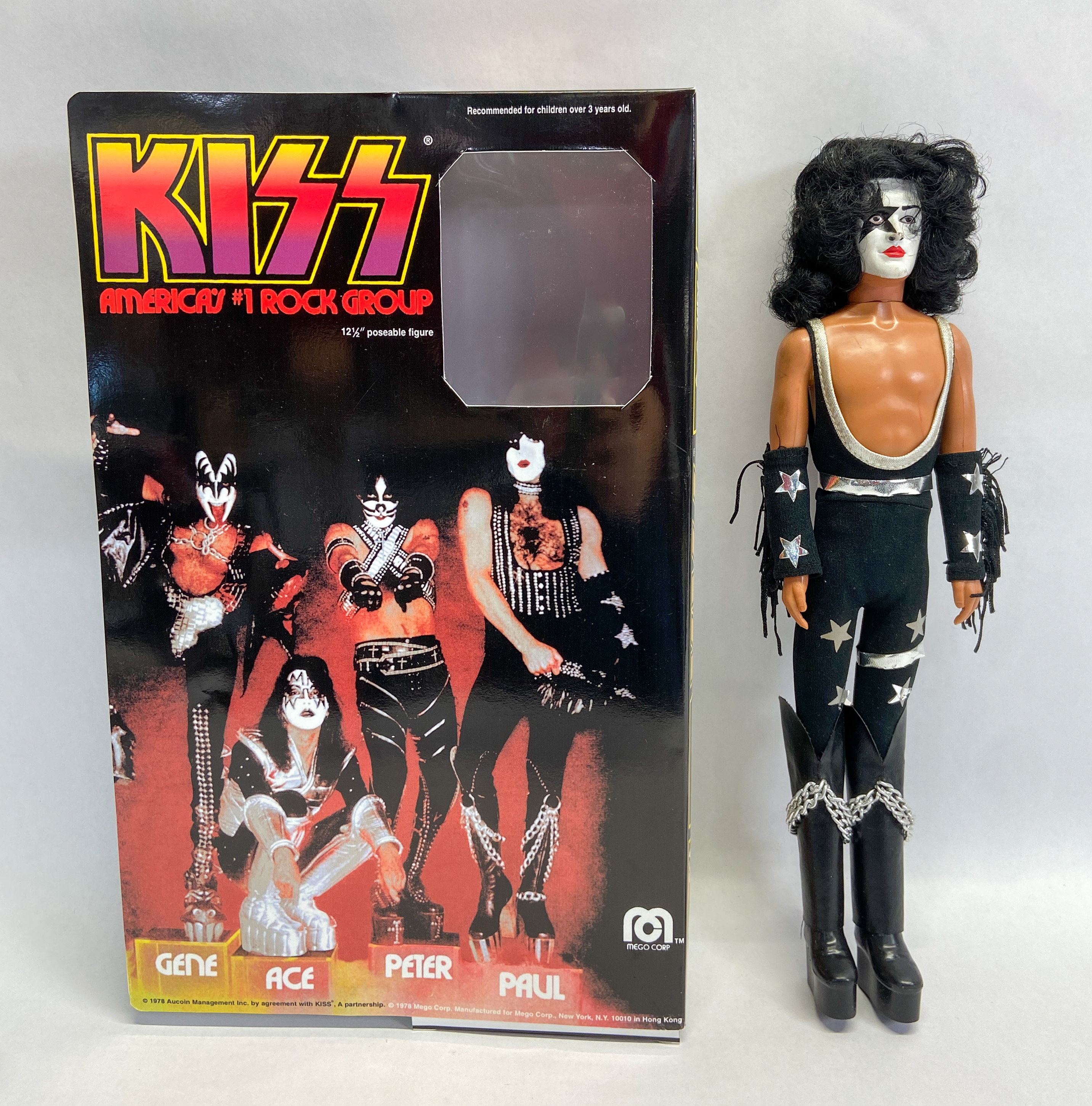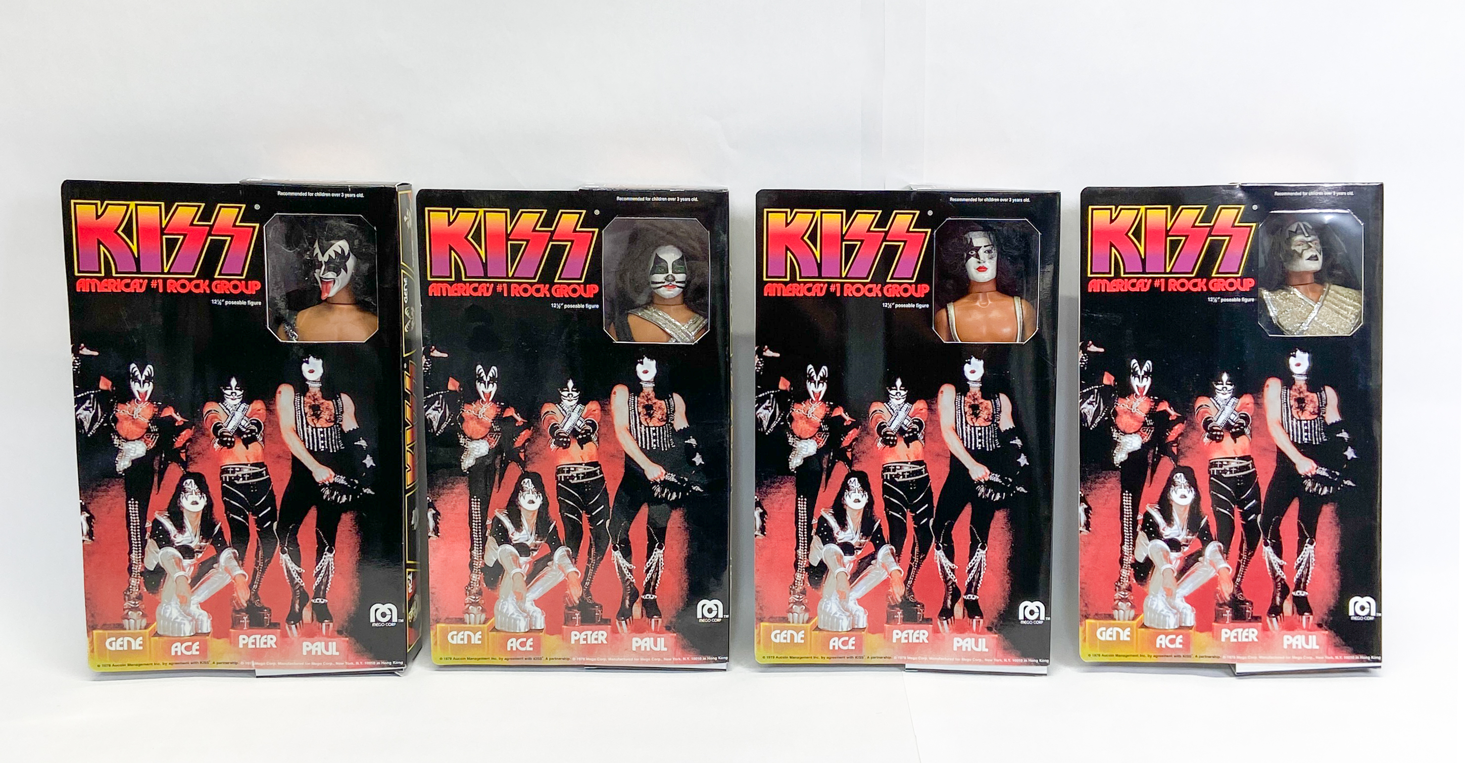 Group of four vintage KISS 12.5-inch poseable action figures manufactured by Mego in 1977. Whole-band set including Gene Simmons (The Demon), Ace Frehley (The Spaceman), Peter Criss (The Catman), and Paul Stanley (The Starchild). Includes four matching display boxes identified on the reverse as high-quality modern reproductions designed in 2008. Boxes 15" H x 10" W x 2" D.