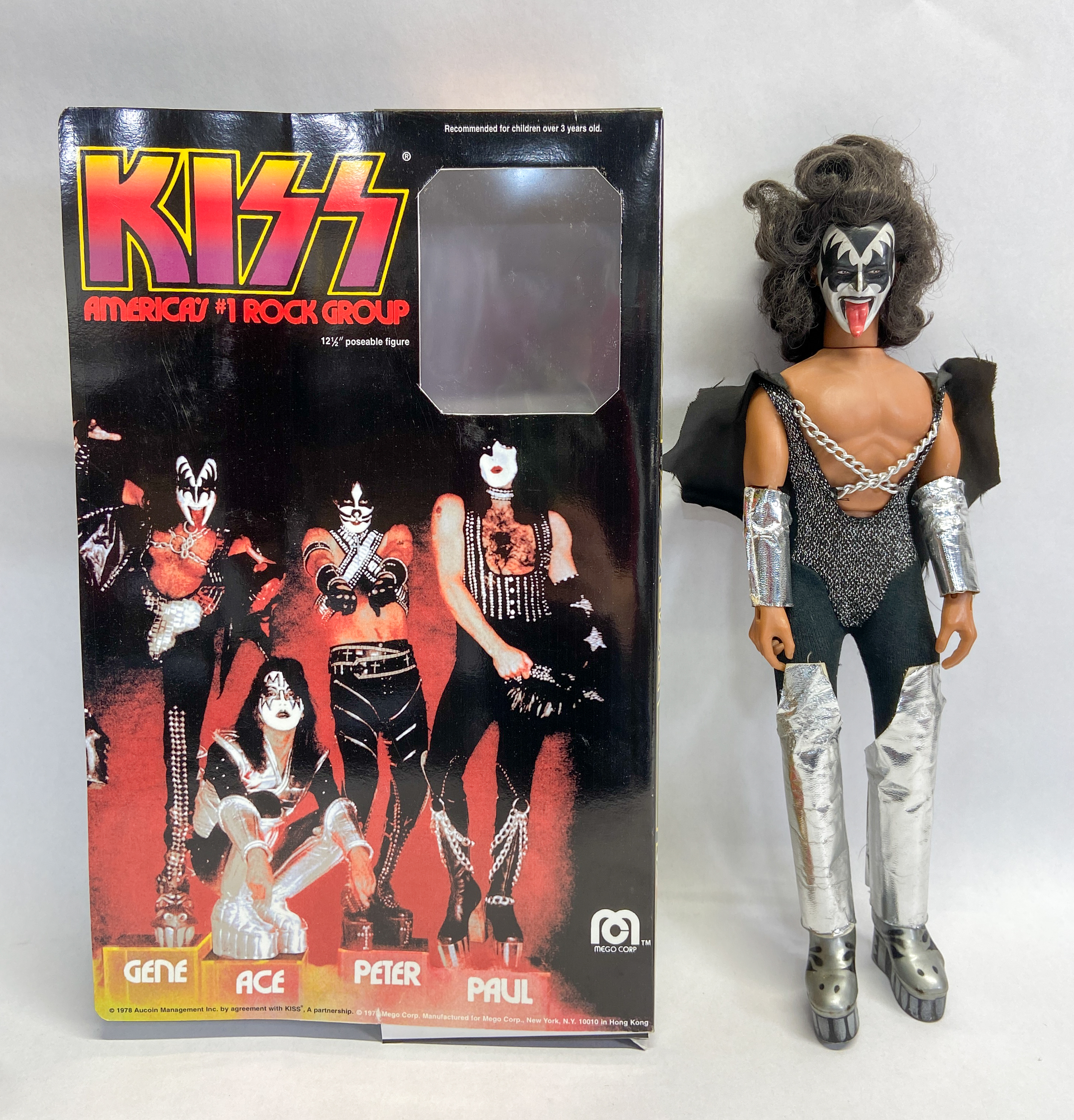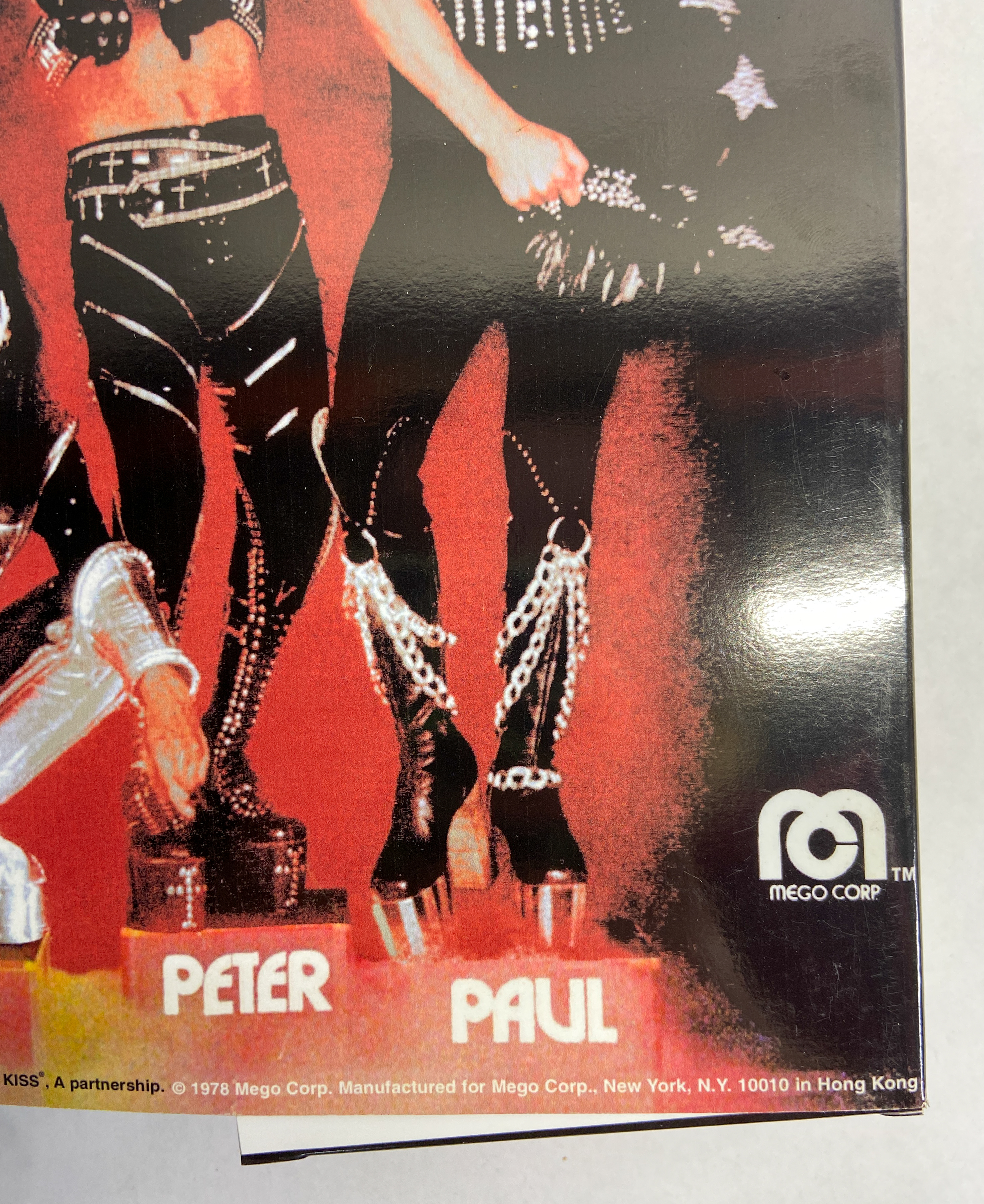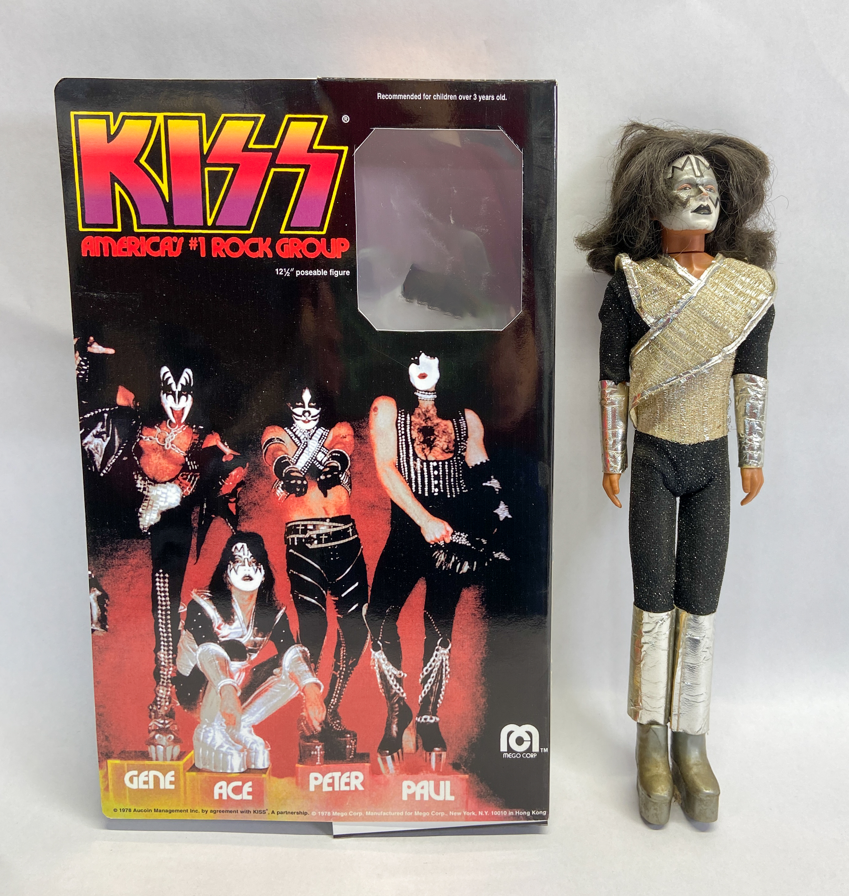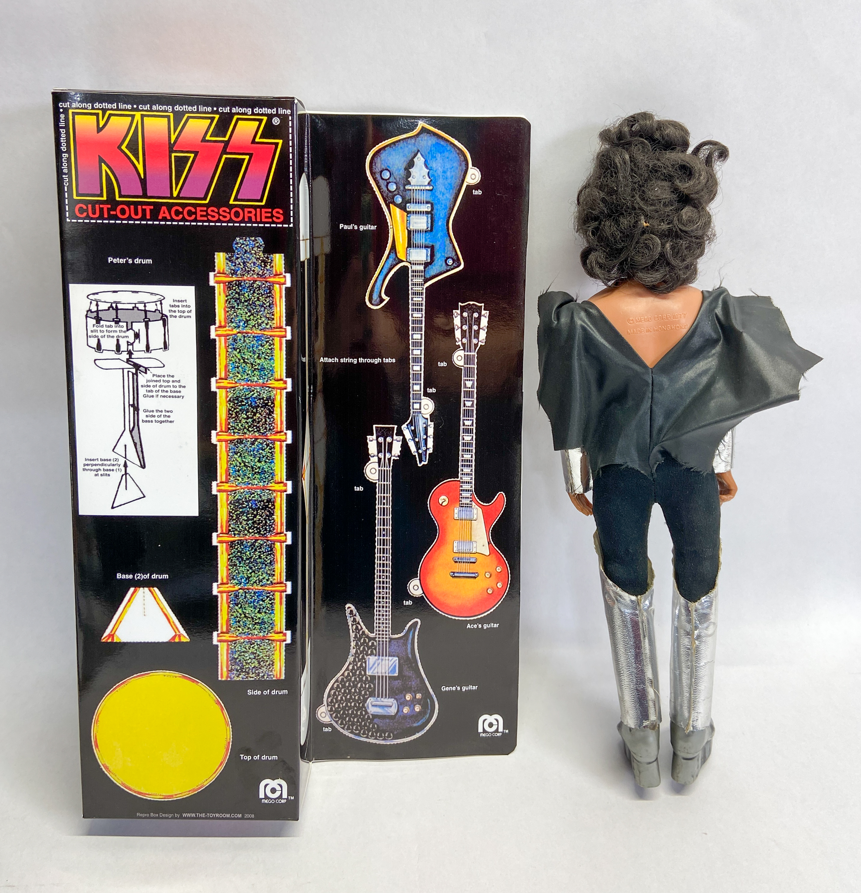 Group of four vintage KISS 12.5-inch poseable action figures manufactured by Mego in 1977. Whole-band set including Gene Simmons (The Demon), Ace Frehley (The Spaceman), Peter Criss (The Catman), and Paul Stanley (The Starchild). Includes four matching display boxes identified on the reverse as high-quality modern reproductions designed in 2008. Boxes 15" H x 10" W x 2" D.