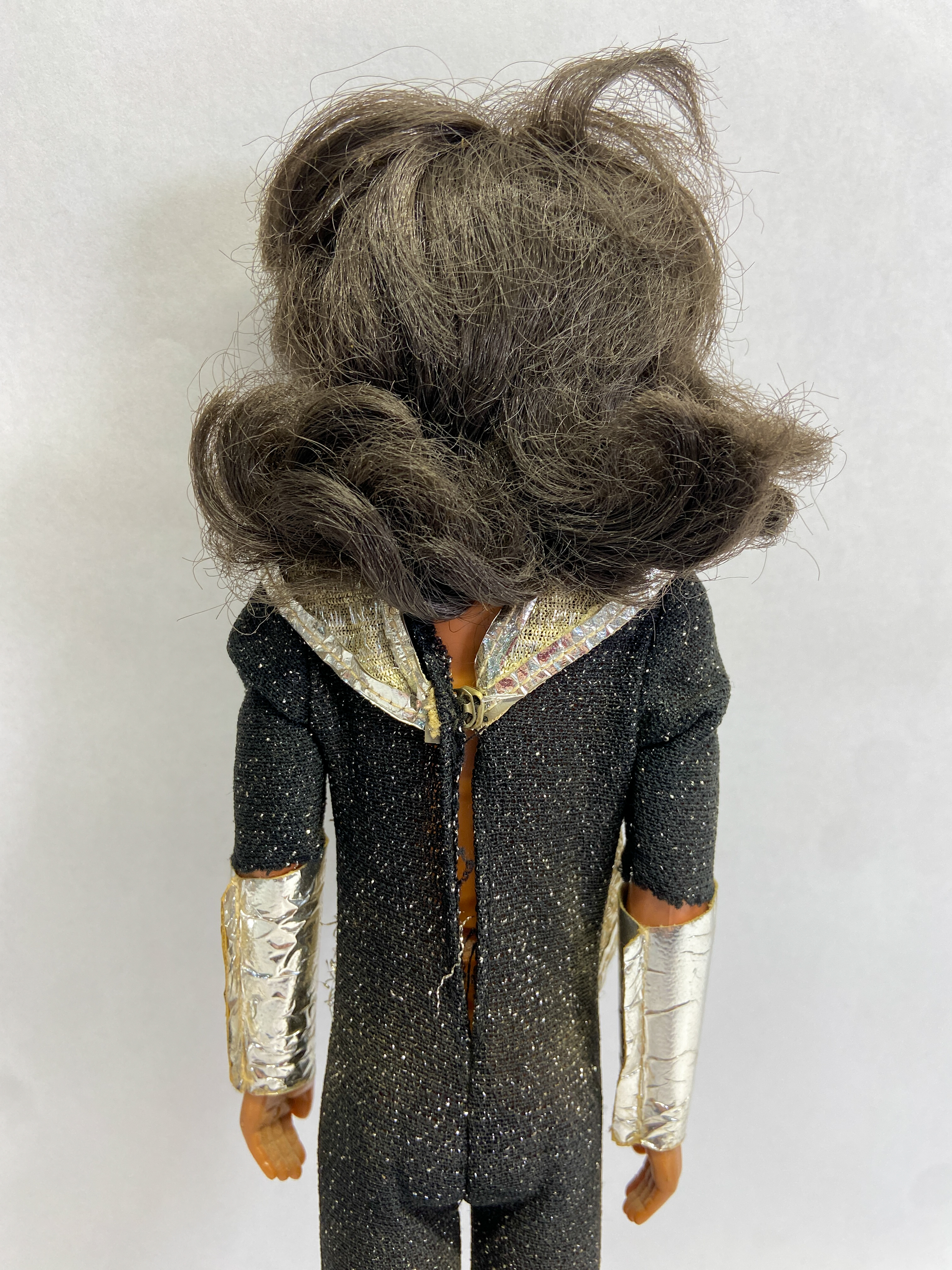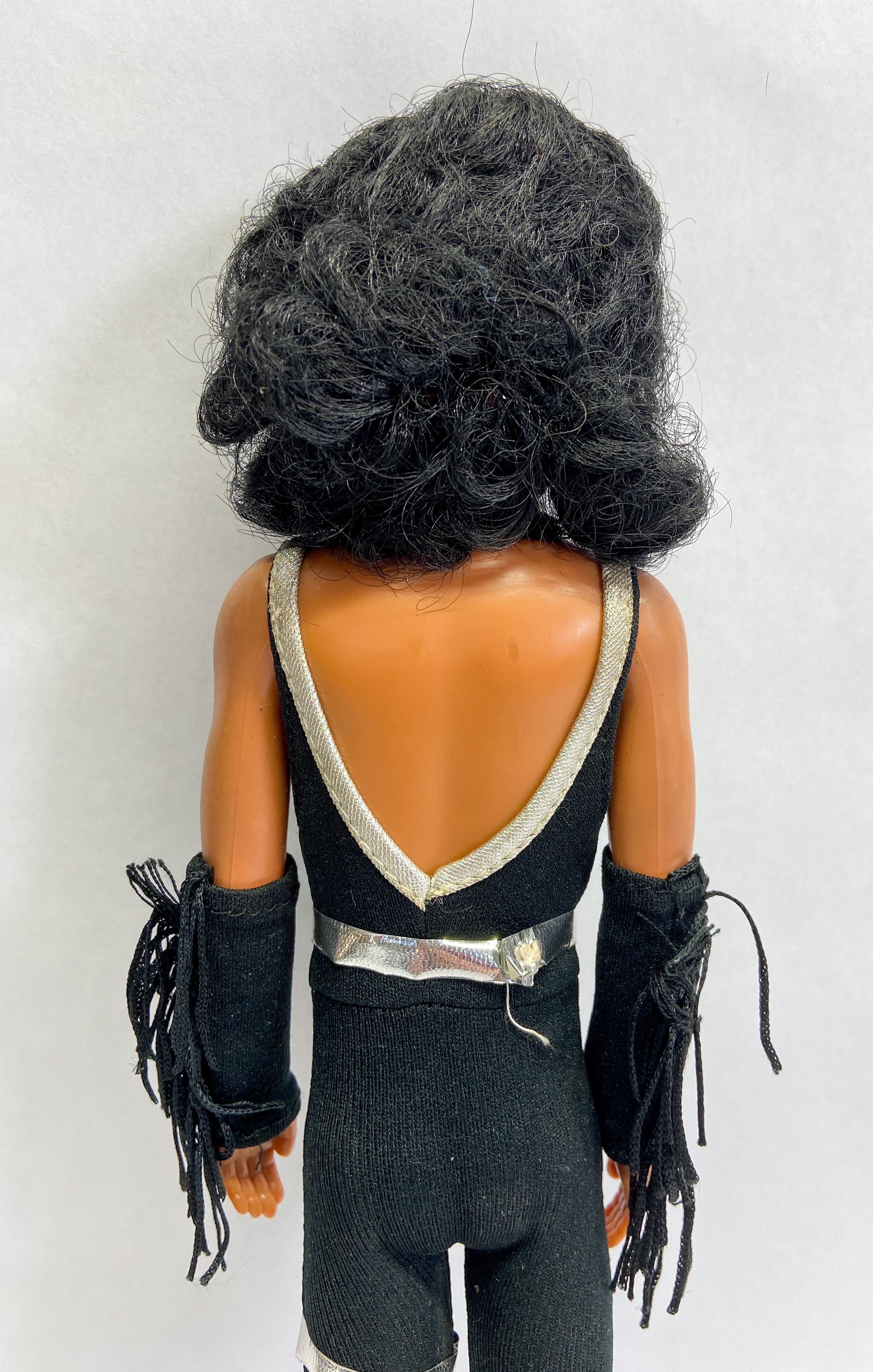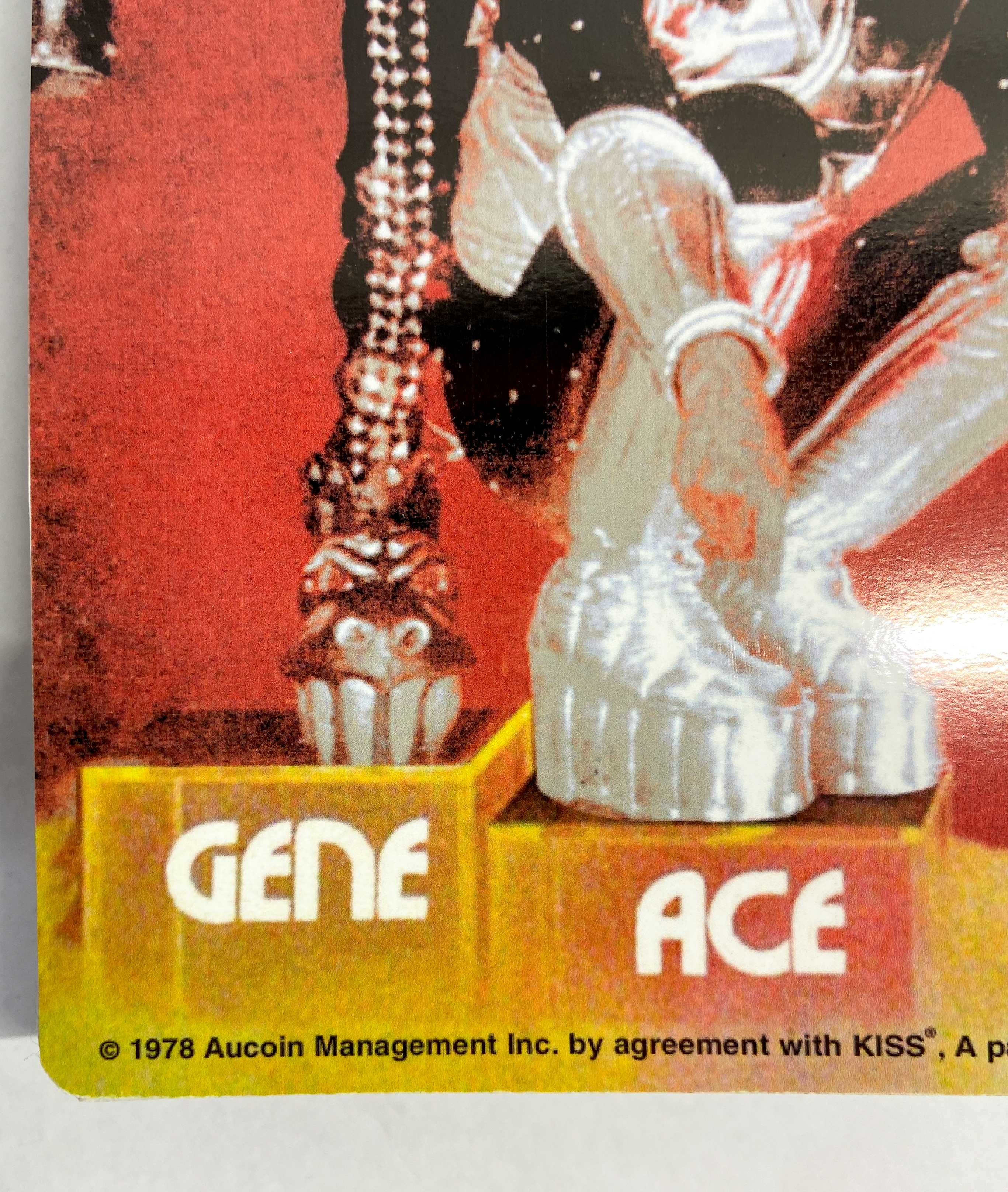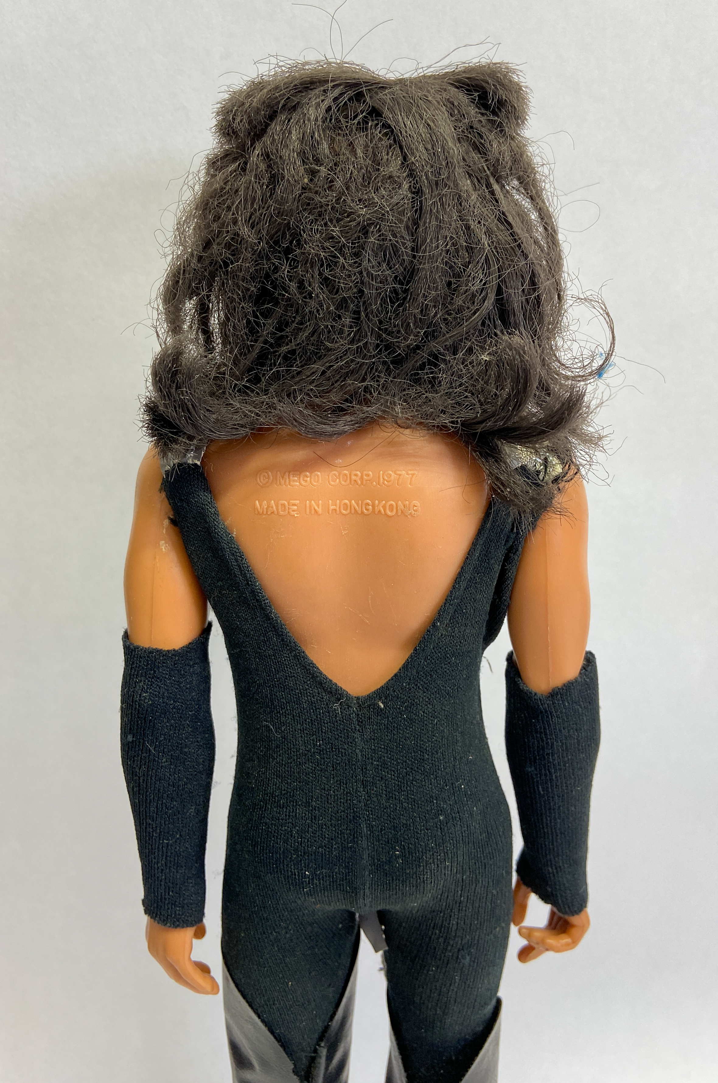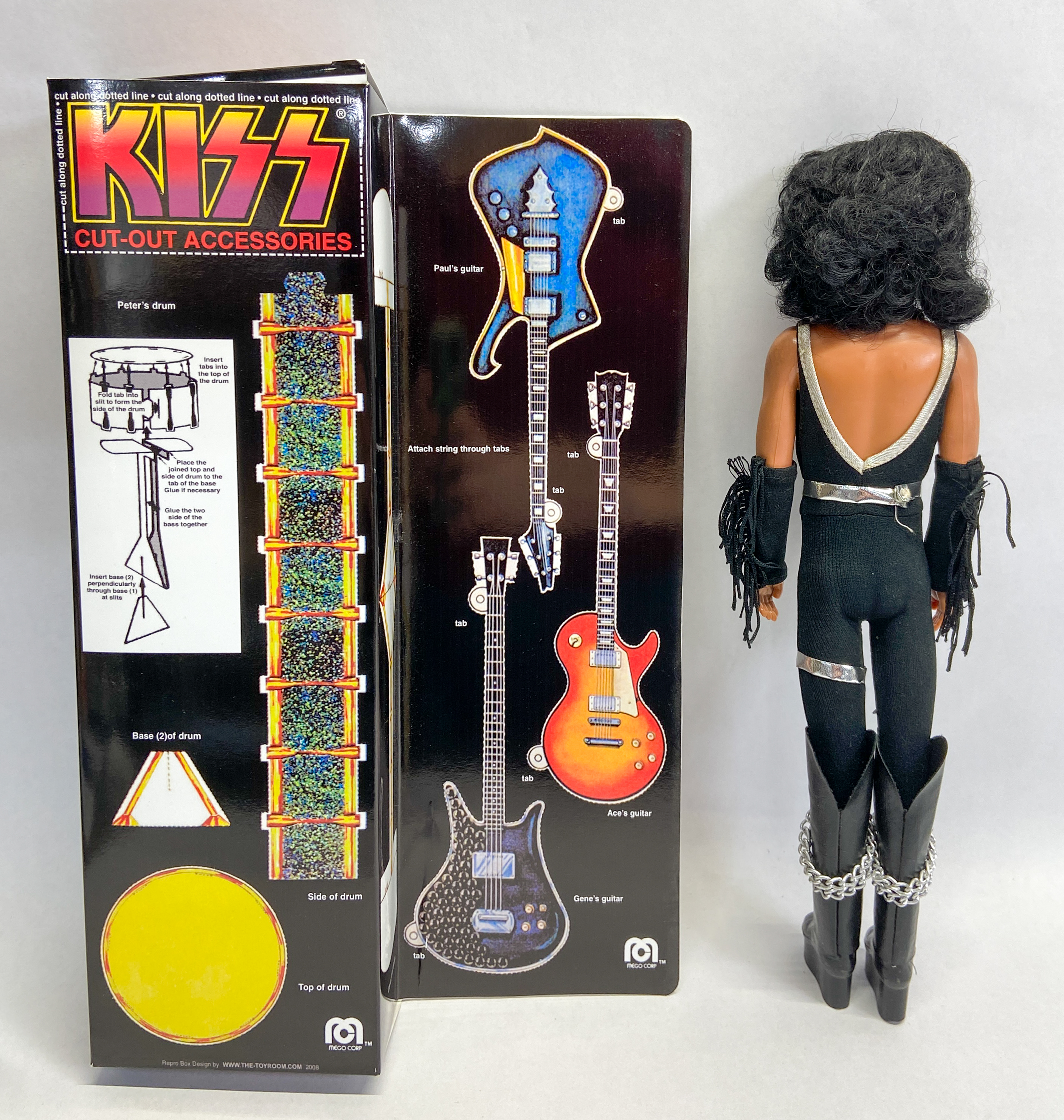 Group of four vintage KISS 12.5-inch poseable action figures manufactured by Mego in 1977. Whole-band set including Gene Simmons (The Demon), Ace Frehley (The Spaceman), Peter Criss (The Catman), and Paul Stanley (The Starchild). Includes four matching display boxes identified on the reverse as high-quality modern reproductions designed in 2008. Boxes 15" H x 10" W x 2" D.