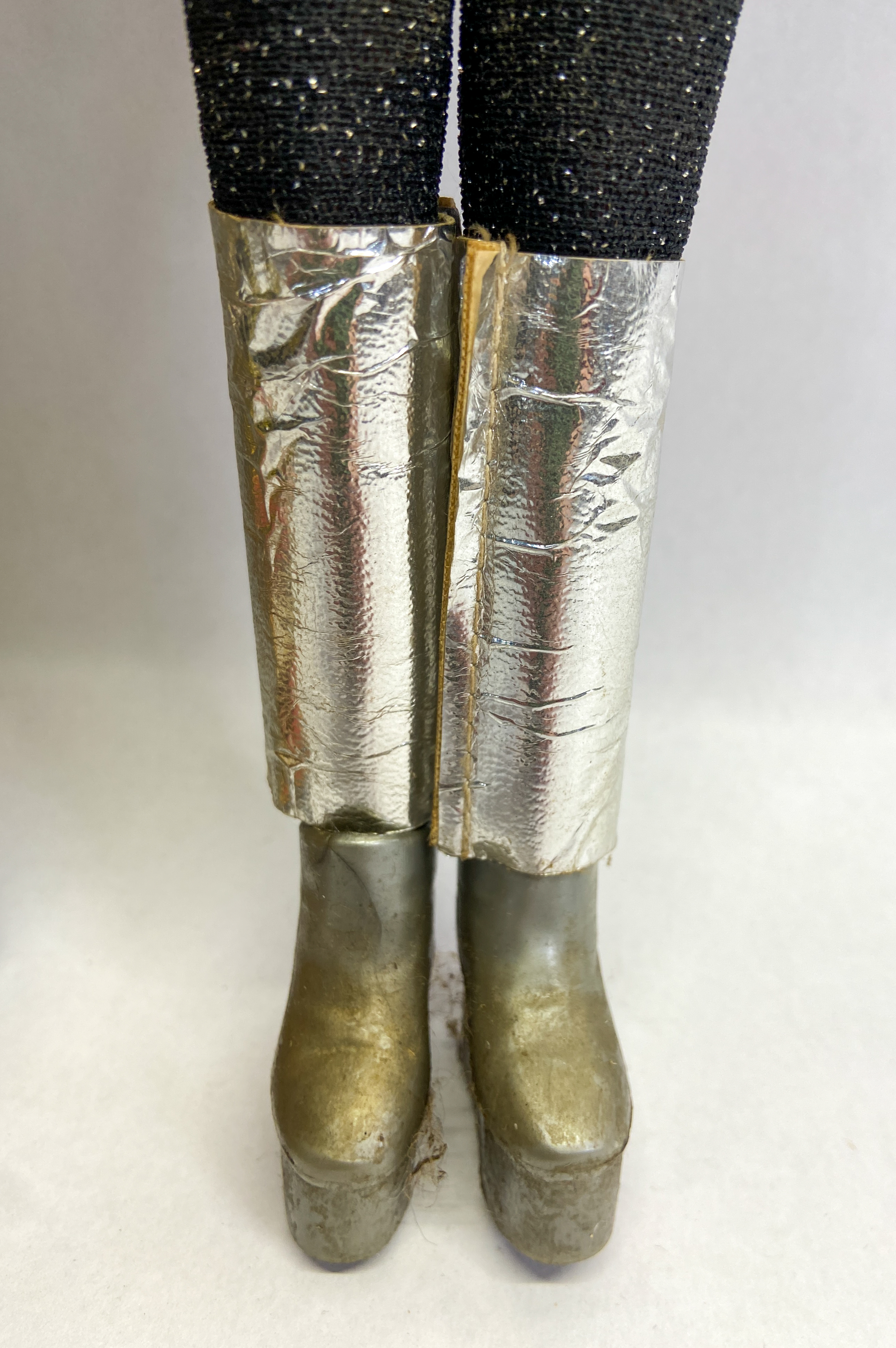 Condition: Figures are in good vintage condition with age-related wear including fraying to fabric costume elements and light surface grime. Rooted hair shows some tangling from age. Face paint remains largely intact and vibrant. The reproduction boxes are in good overall condition with minimal shelf wear.