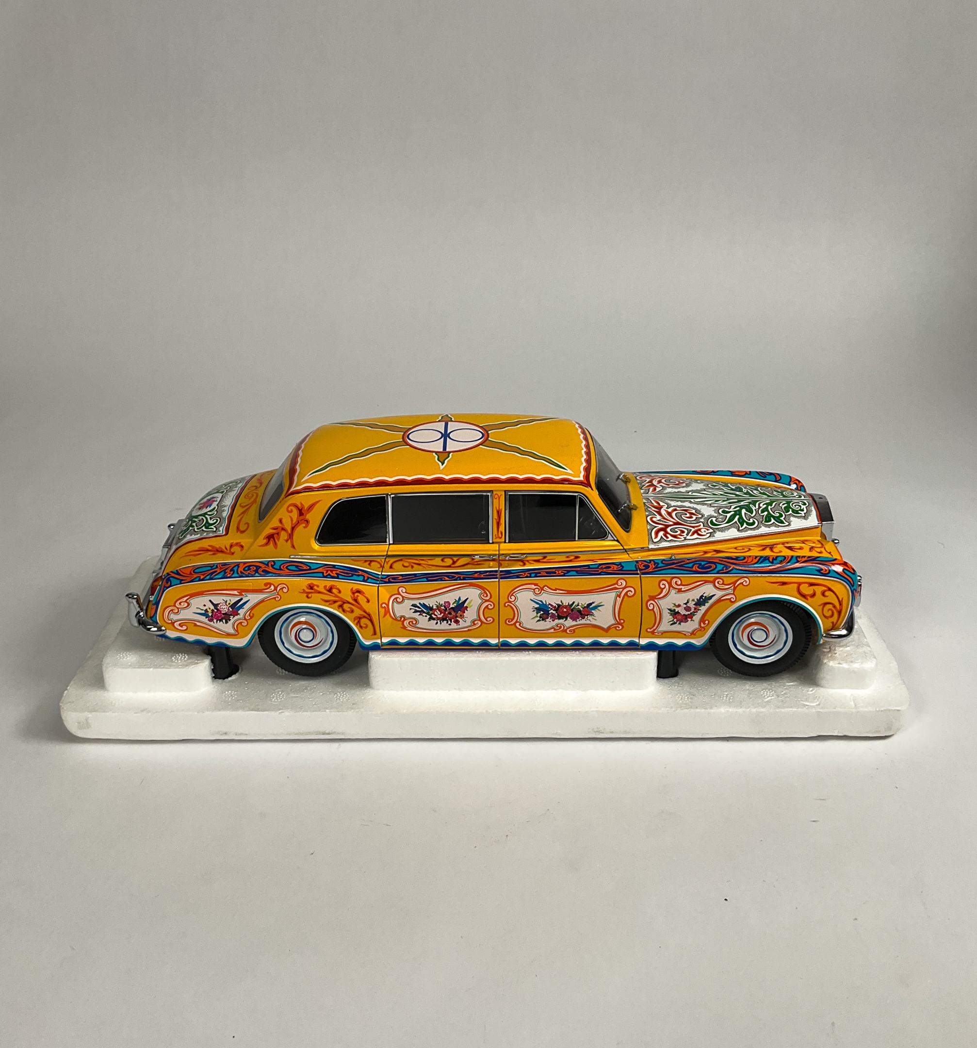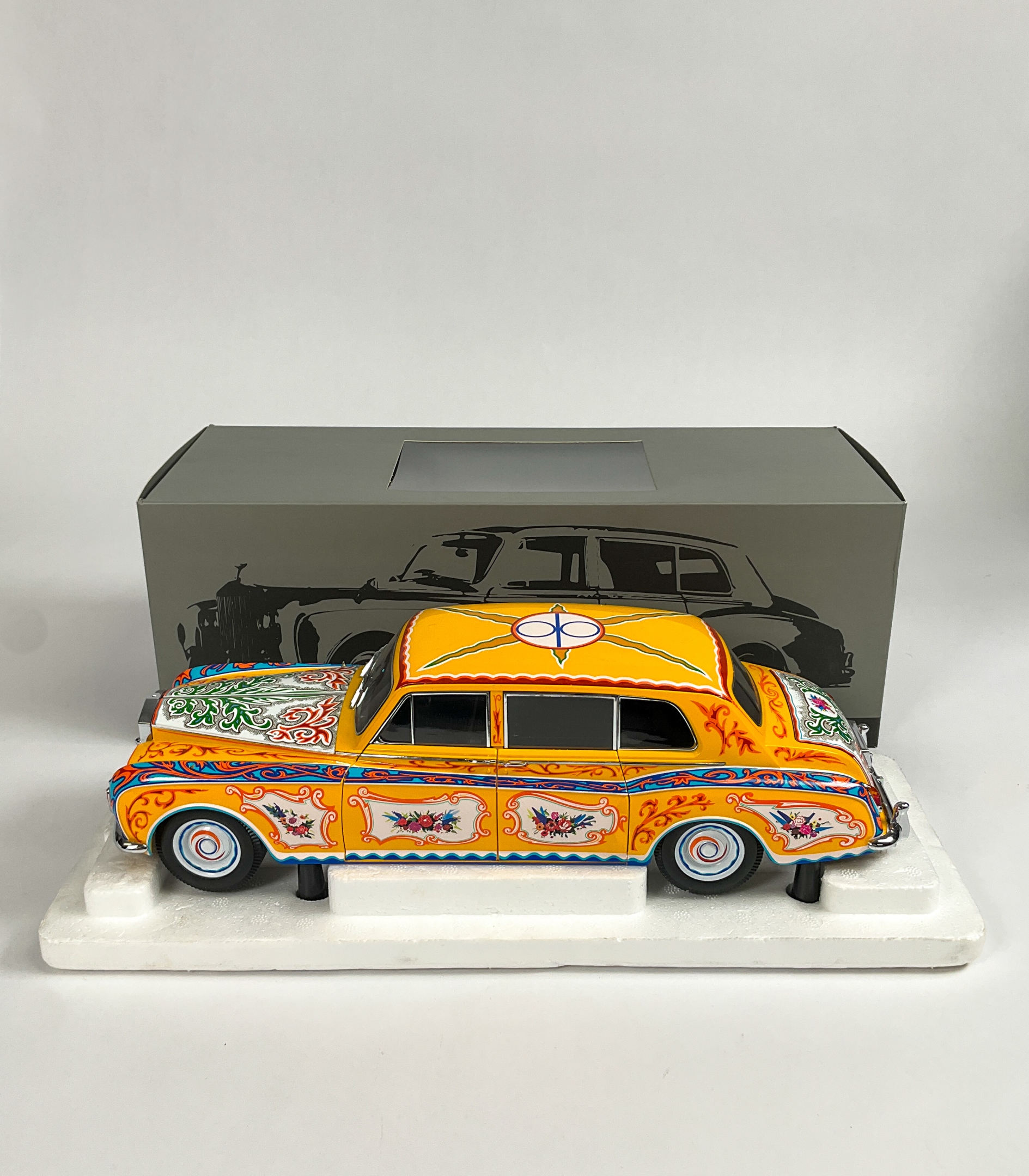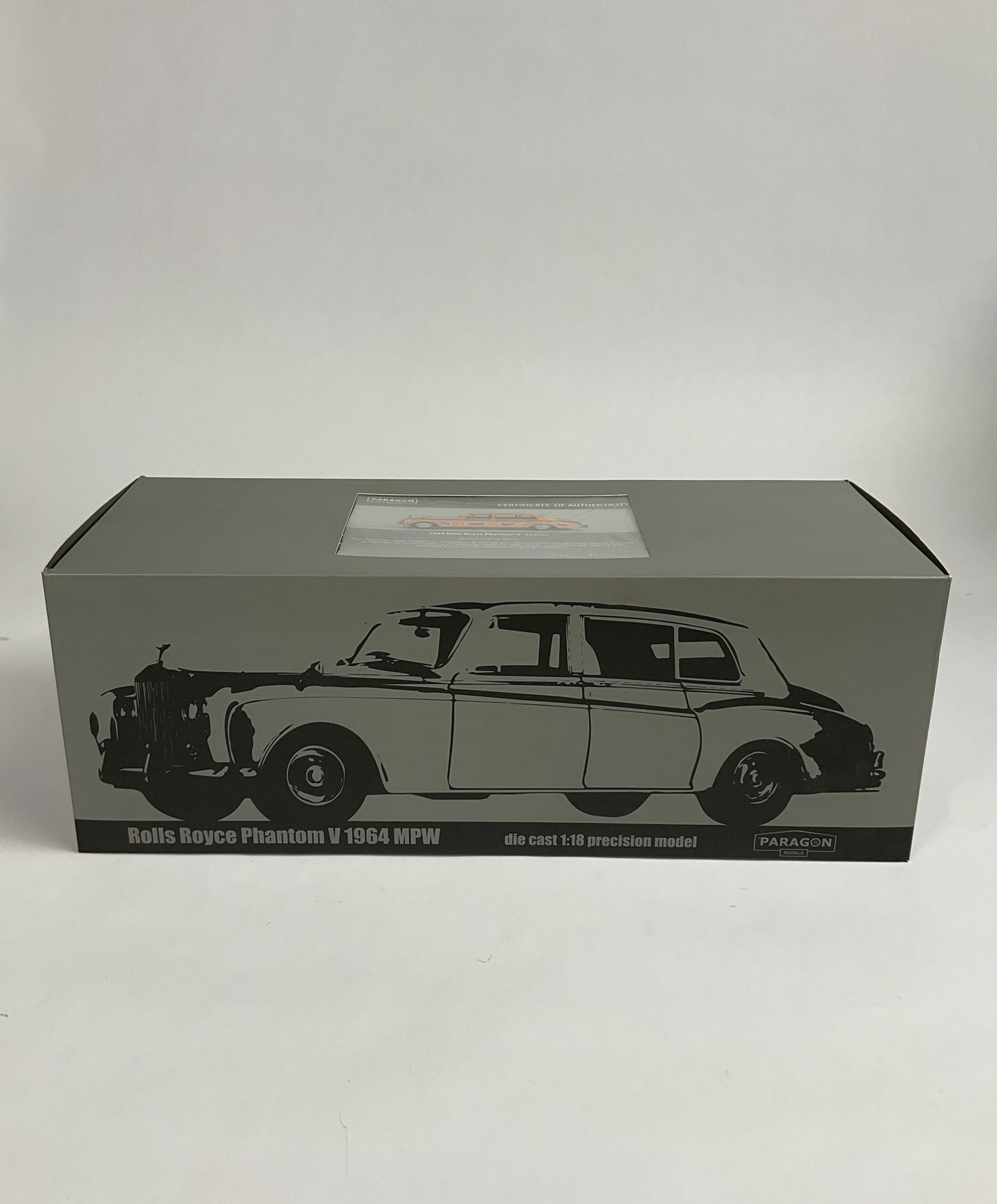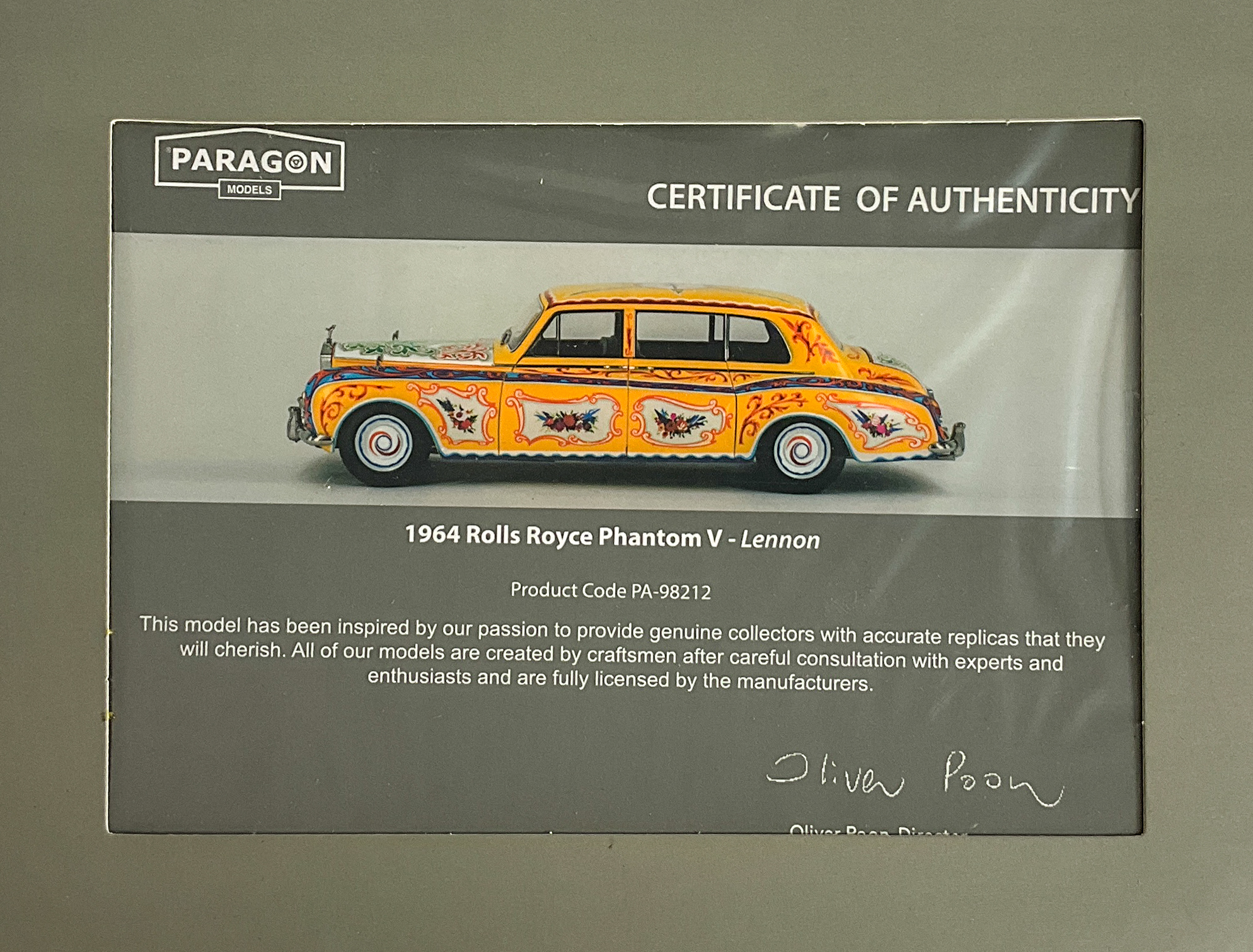Paragon Models John Lennon 1964 Rolls Royce Phantom V die-cast 1:18 precision model. Original packaging with Paragon COA. Box 5 1/2" H x 15" W x 6" D. Car 3 3/4" H x 13" L x 4 1/2" W.