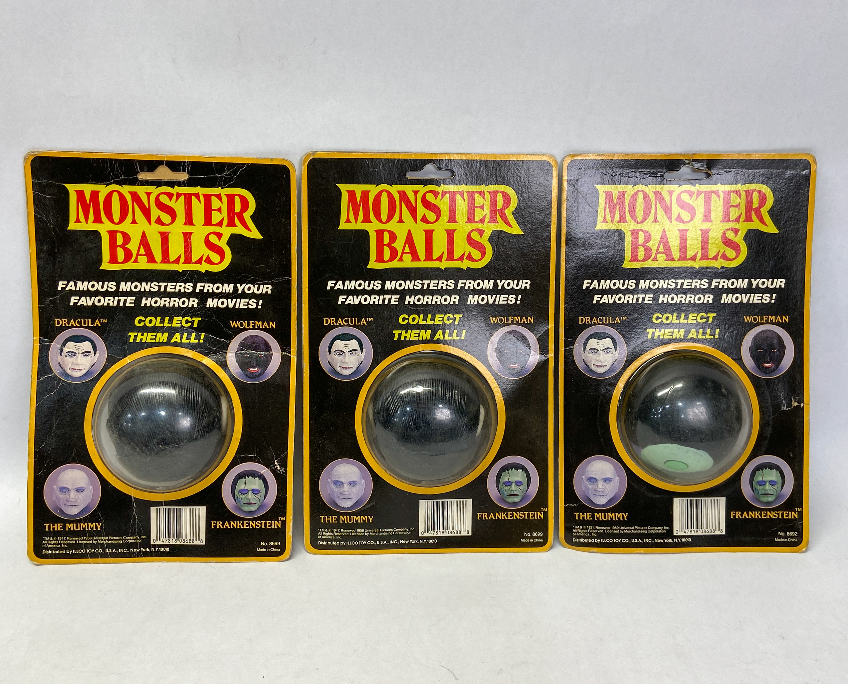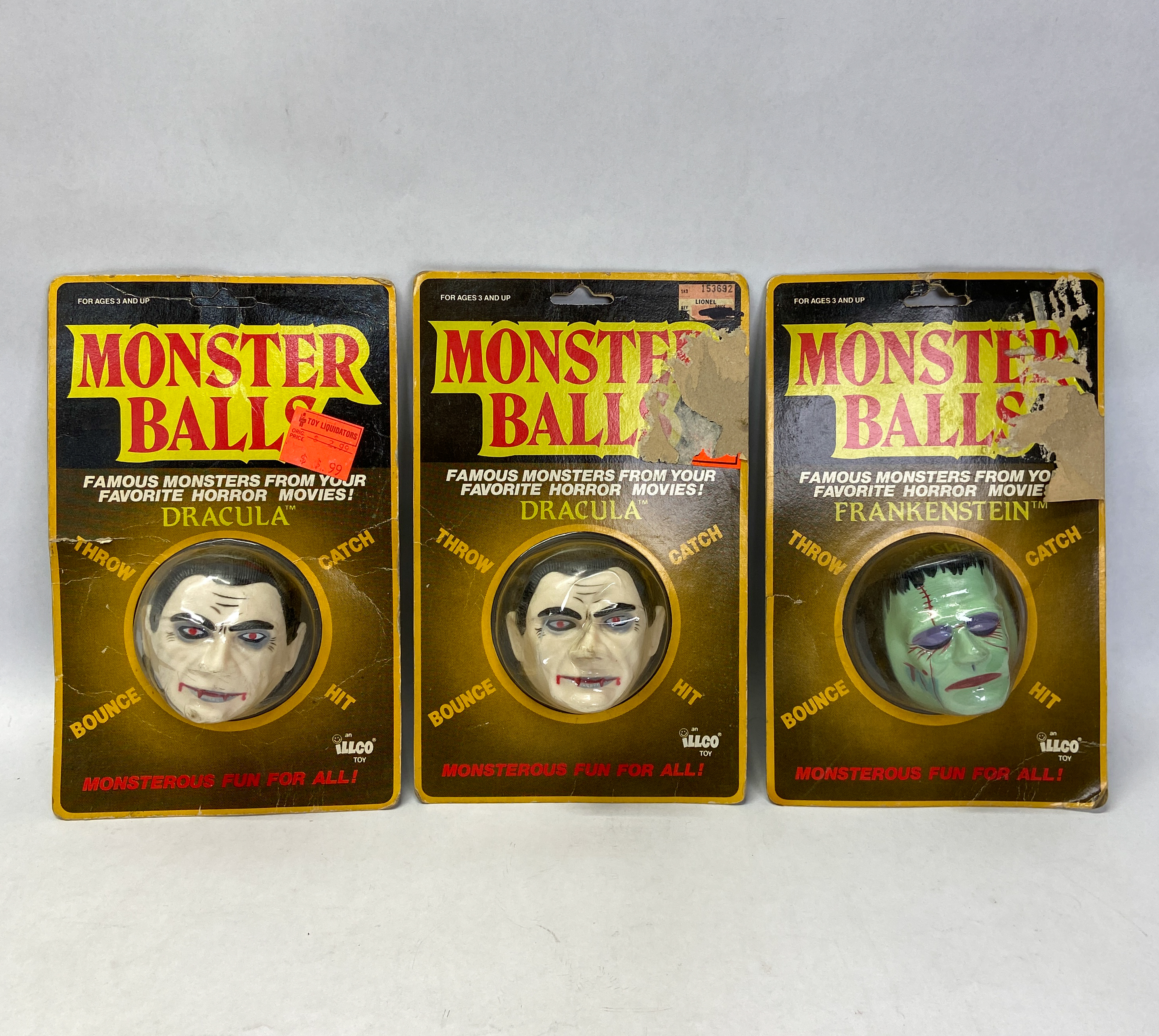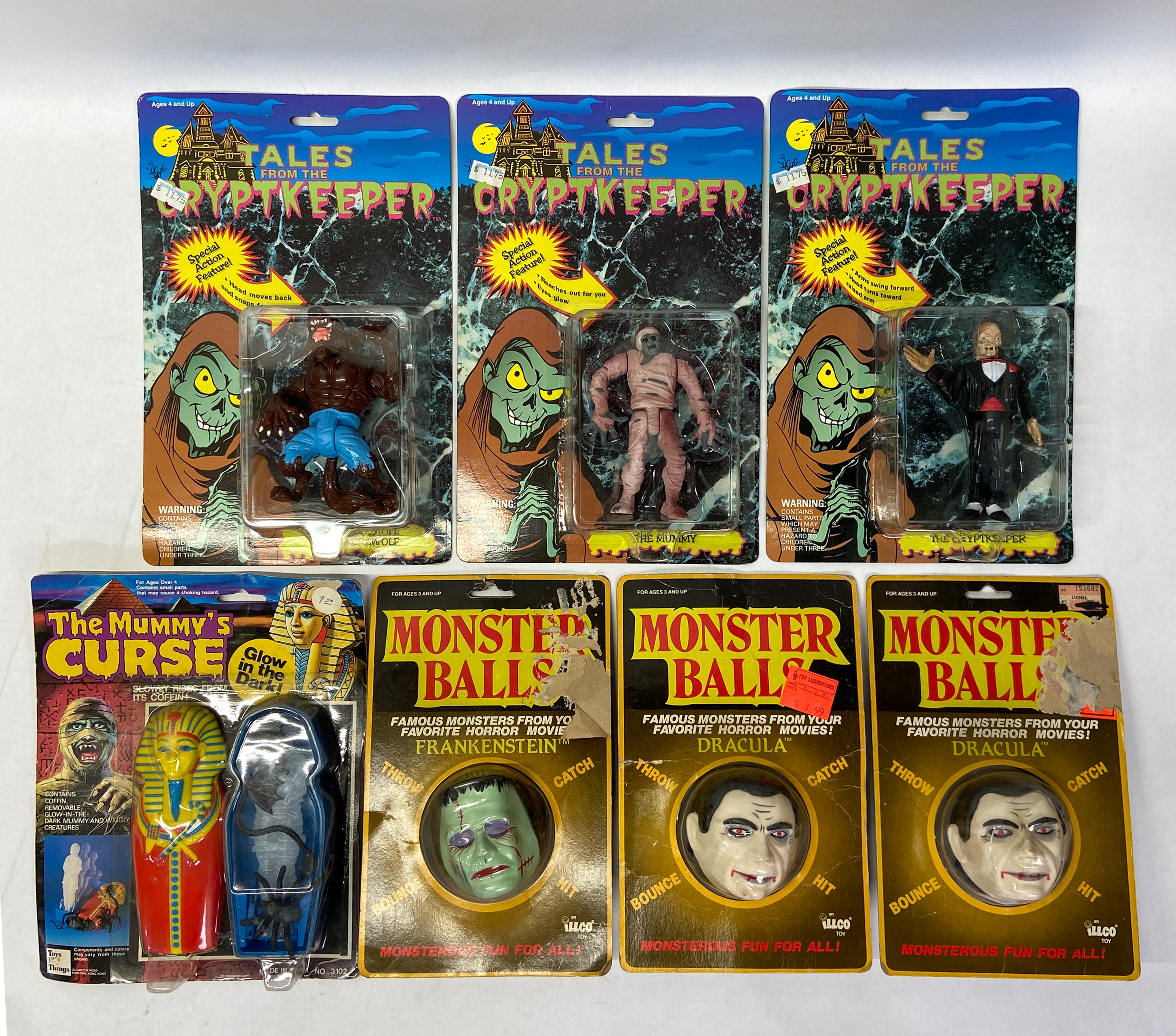 Group of seven vintage monster-themed toys and action figures, primarily from the early to mid-1990s. Includes three “Tales From the Cryptkeeper” action figures produced by Ace Novelty featuring The Werewolf, The Mummy, and The Cryptkeeper. Also includes three “Monster Balls” manufactured by Illco, featuring two Dracula characters and one Frankenstein character. The final piece is “The Mummy’s Curse” playset by Toys N’ Things, which features a mechanical rising sarcophagus and glow-in-the-dark figures. All items are presented in their original blister pack packaging. Largest item 12″ H x 7.5″ W x 3″ D.