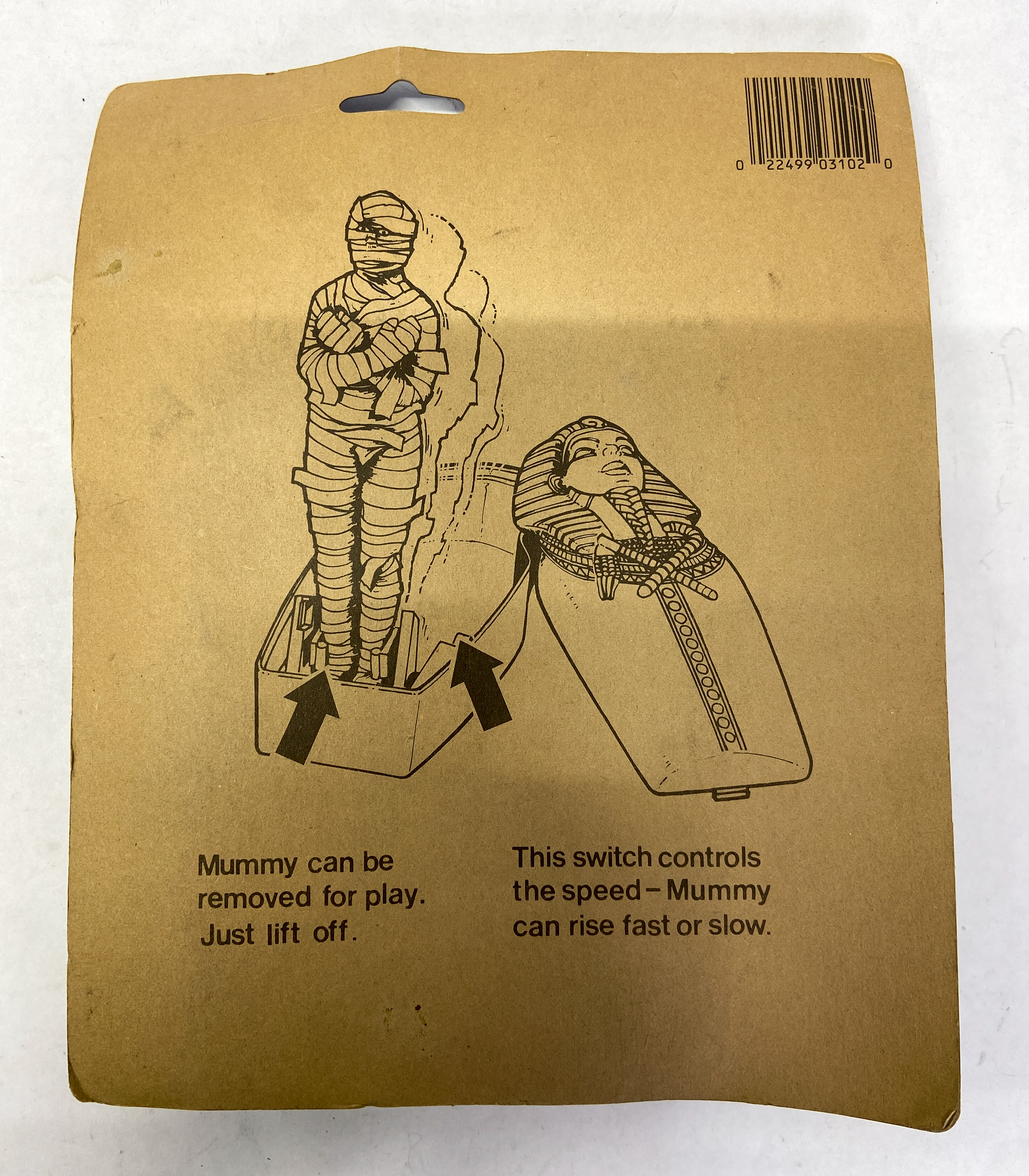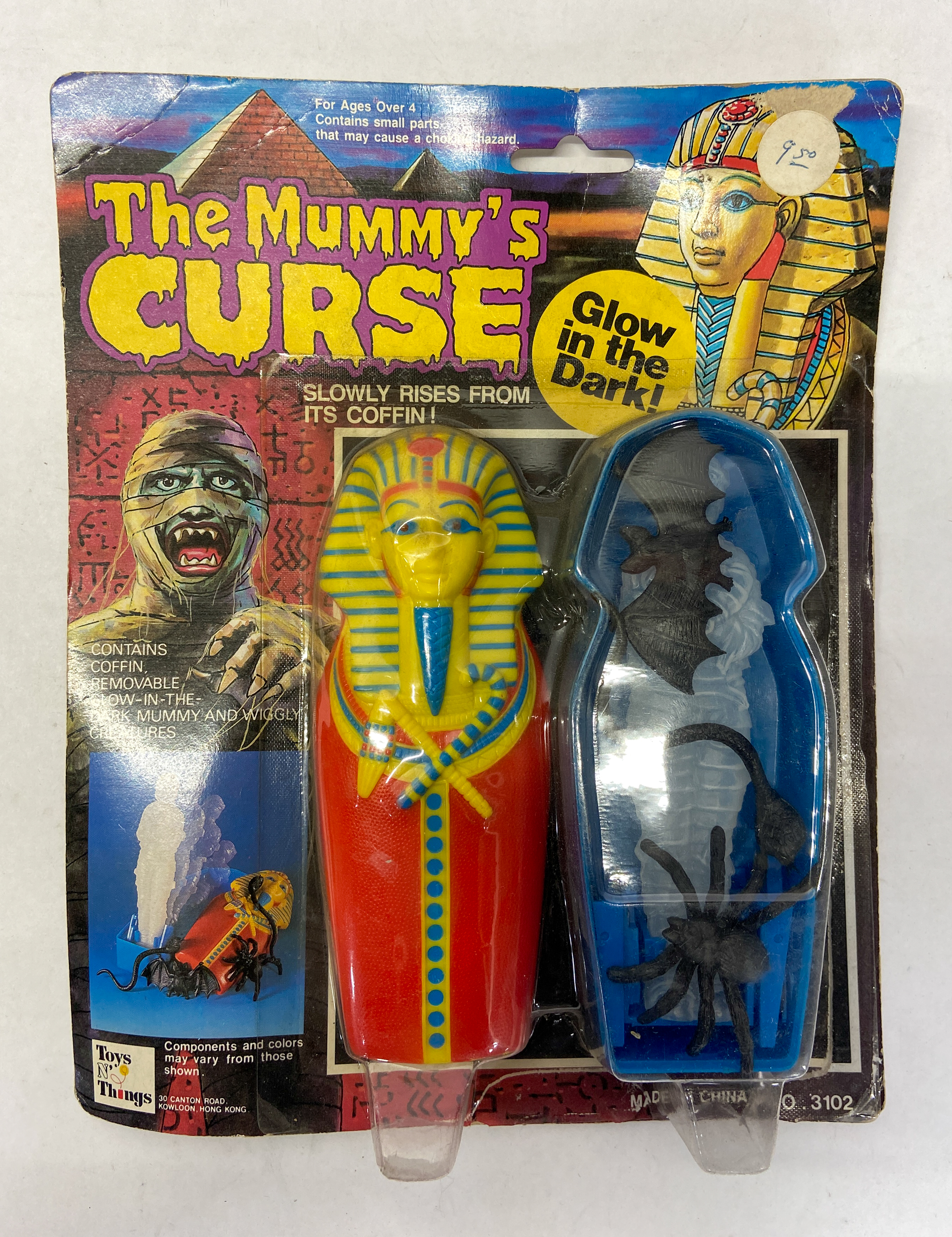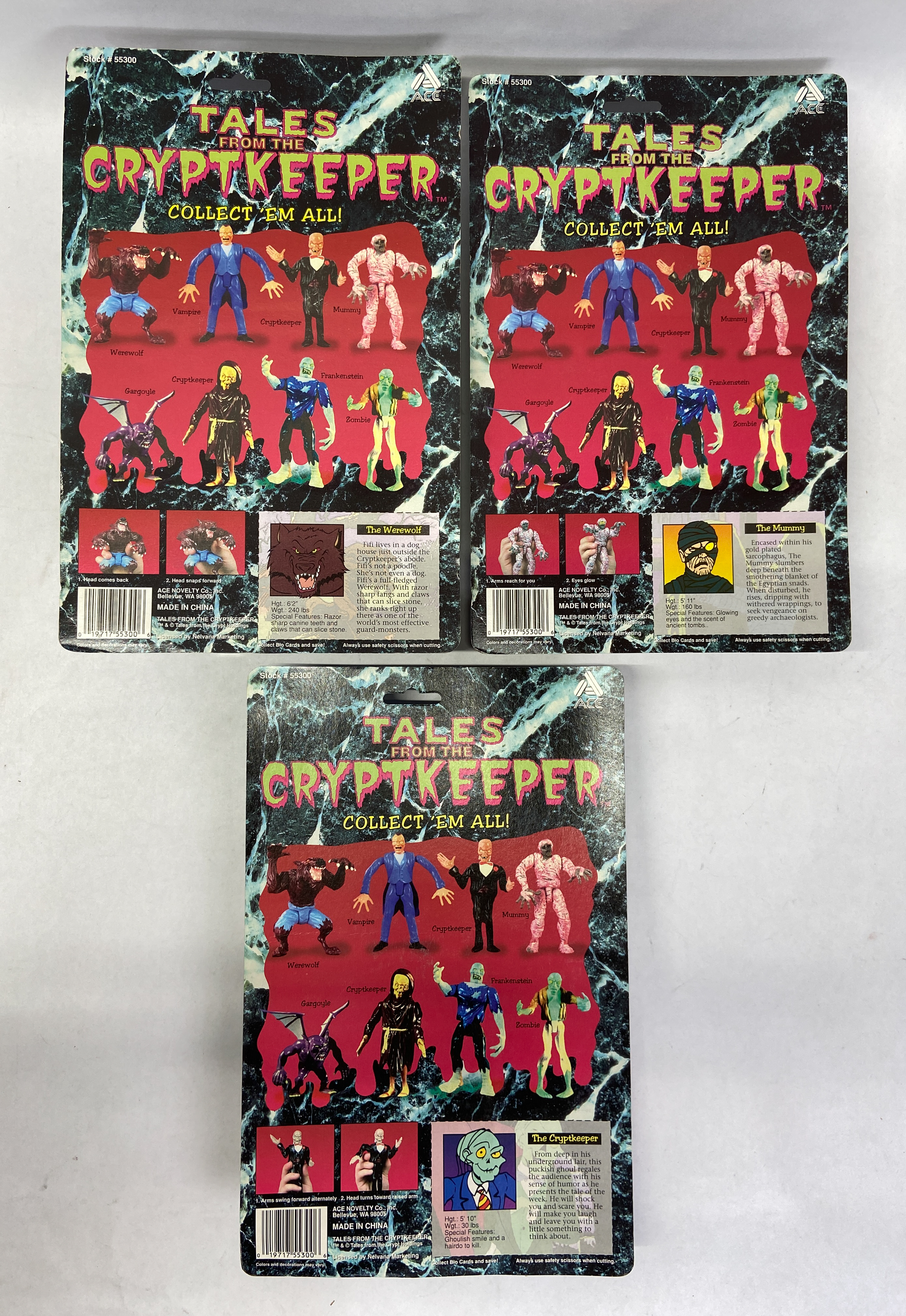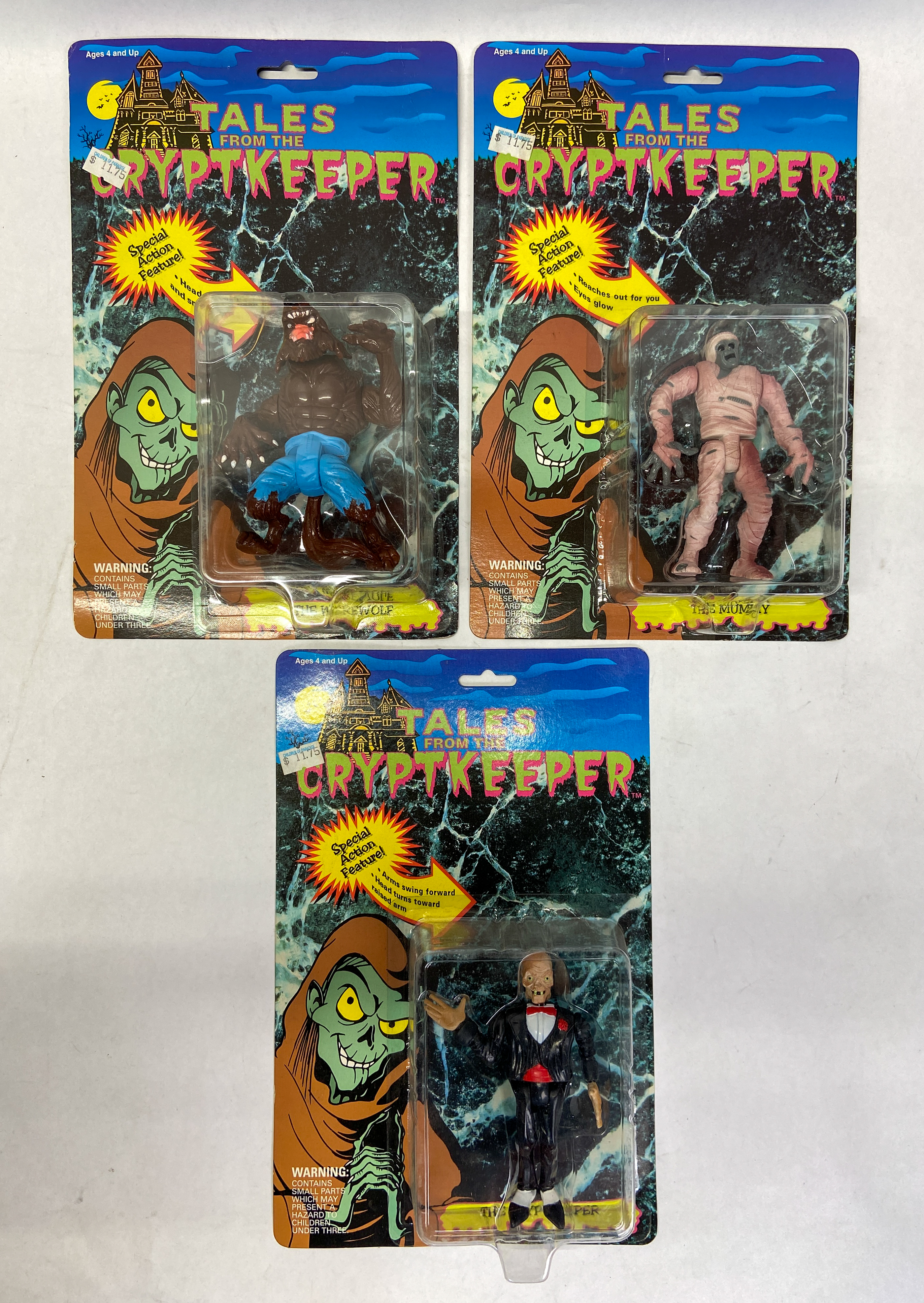 Group of seven vintage monster-themed toys and action figures, primarily from the early to mid-1990s. Includes three “Tales From the Cryptkeeper” action figures produced by Ace Novelty featuring The Werewolf, The Mummy, and The Cryptkeeper. Also includes three “Monster Balls” manufactured by Illco, featuring two Dracula characters and one Frankenstein character. The final piece is “The Mummy’s Curse” playset by Toys N’ Things, which features a mechanical rising sarcophagus and glow-in-the-dark figures. All items are presented in their original blister pack packaging. Largest item 12″ H x 7.5″ W x 3″ D.