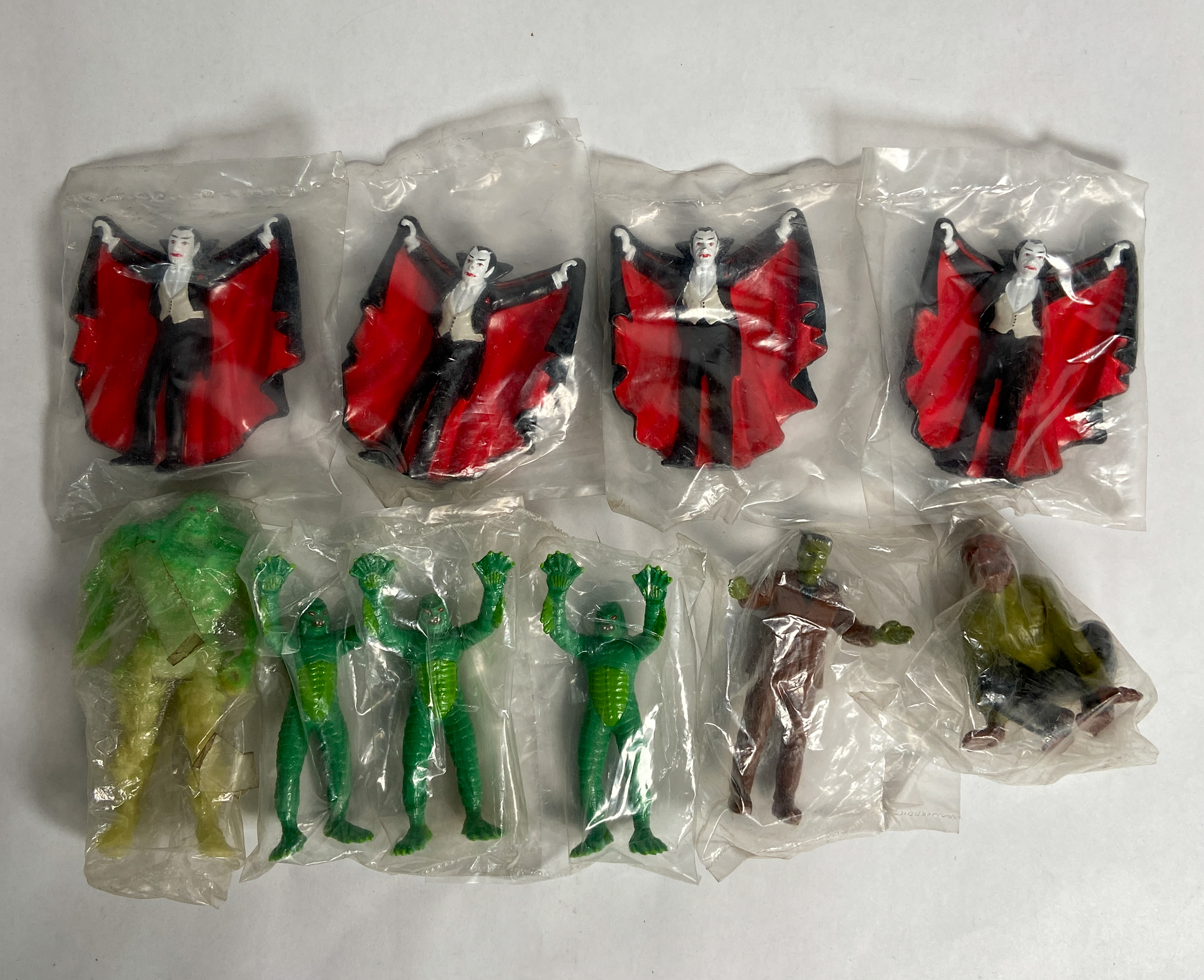 Group of nine vintage Universal Monsters figures including four Dracula figures, three Creature from the Black Lagoon figures, one Frankenstein Monster in a brown suit, and one crouching Wolfman. Also includes one larger, loose figure of a creature resembling Swamp Thing. Marked 1991 Universal City Studios. Each figure 4″ H.