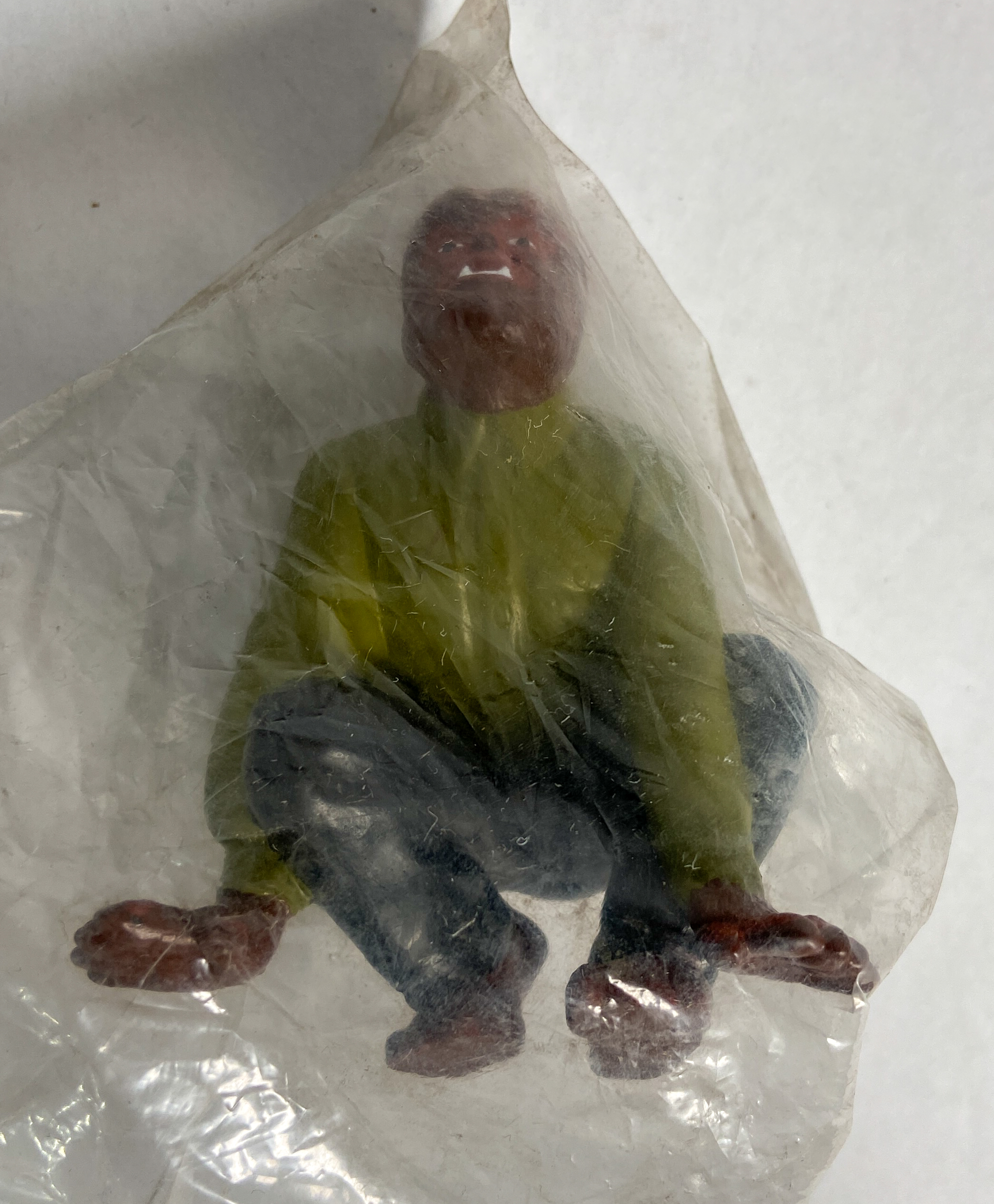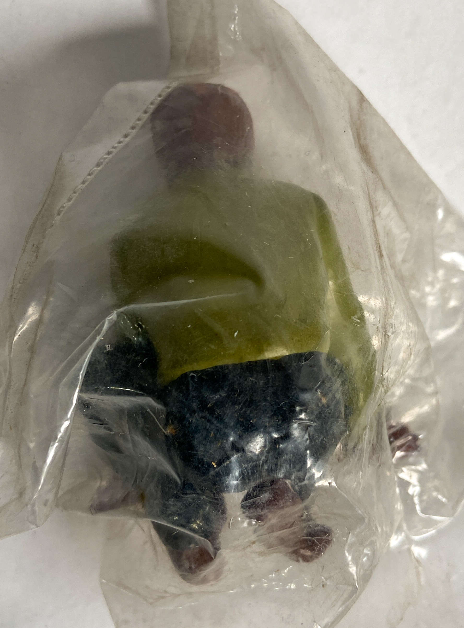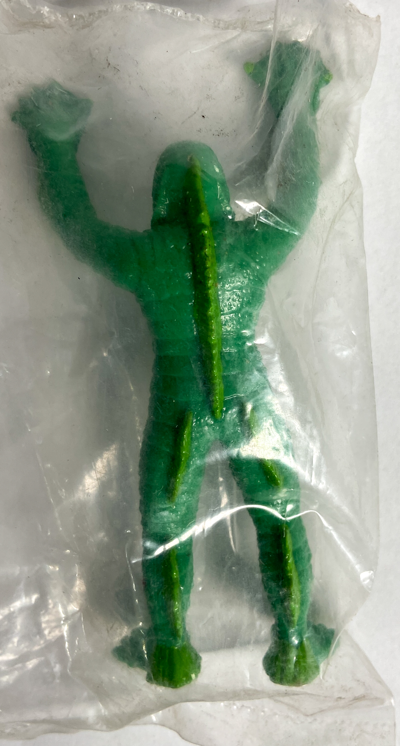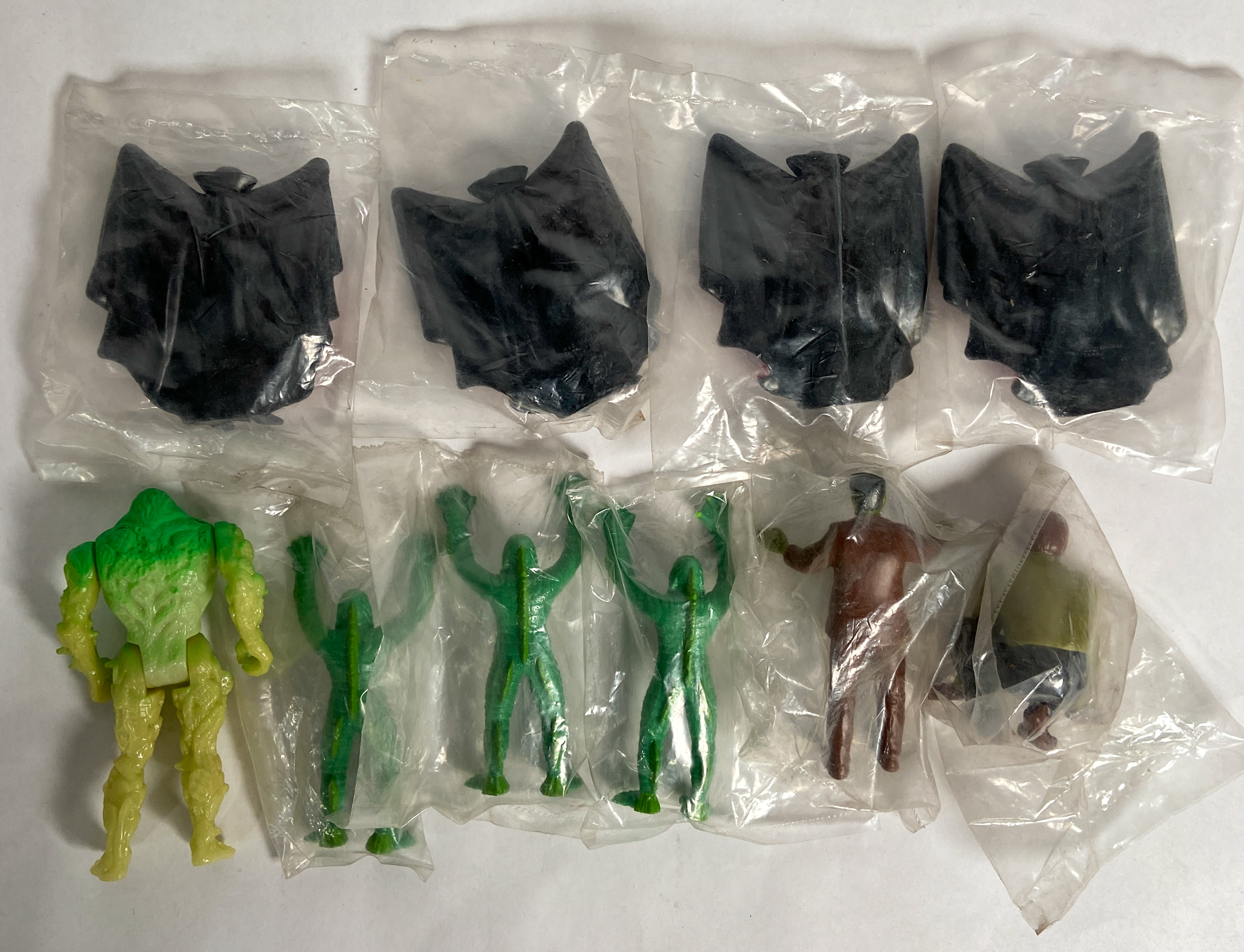 Eight of the nine figures remain in their original, factory-sealed clear plastic polybags. The larger translucent figure is loose. The collection appears to be in good vintage condition, showing only minor shelf wear and light dust accumulation on the exterior of the packaging. Paint and plastic remain vibrant.