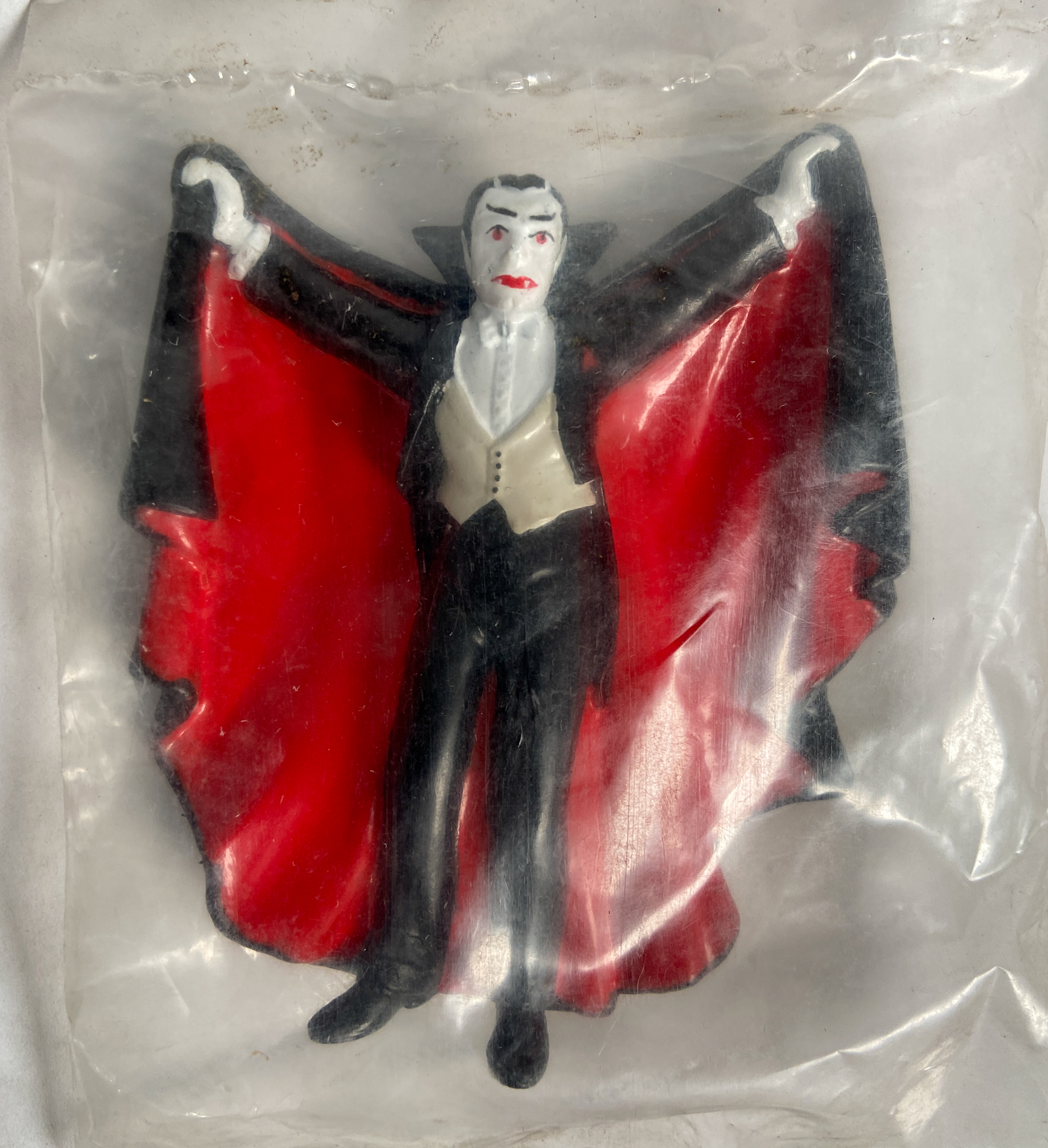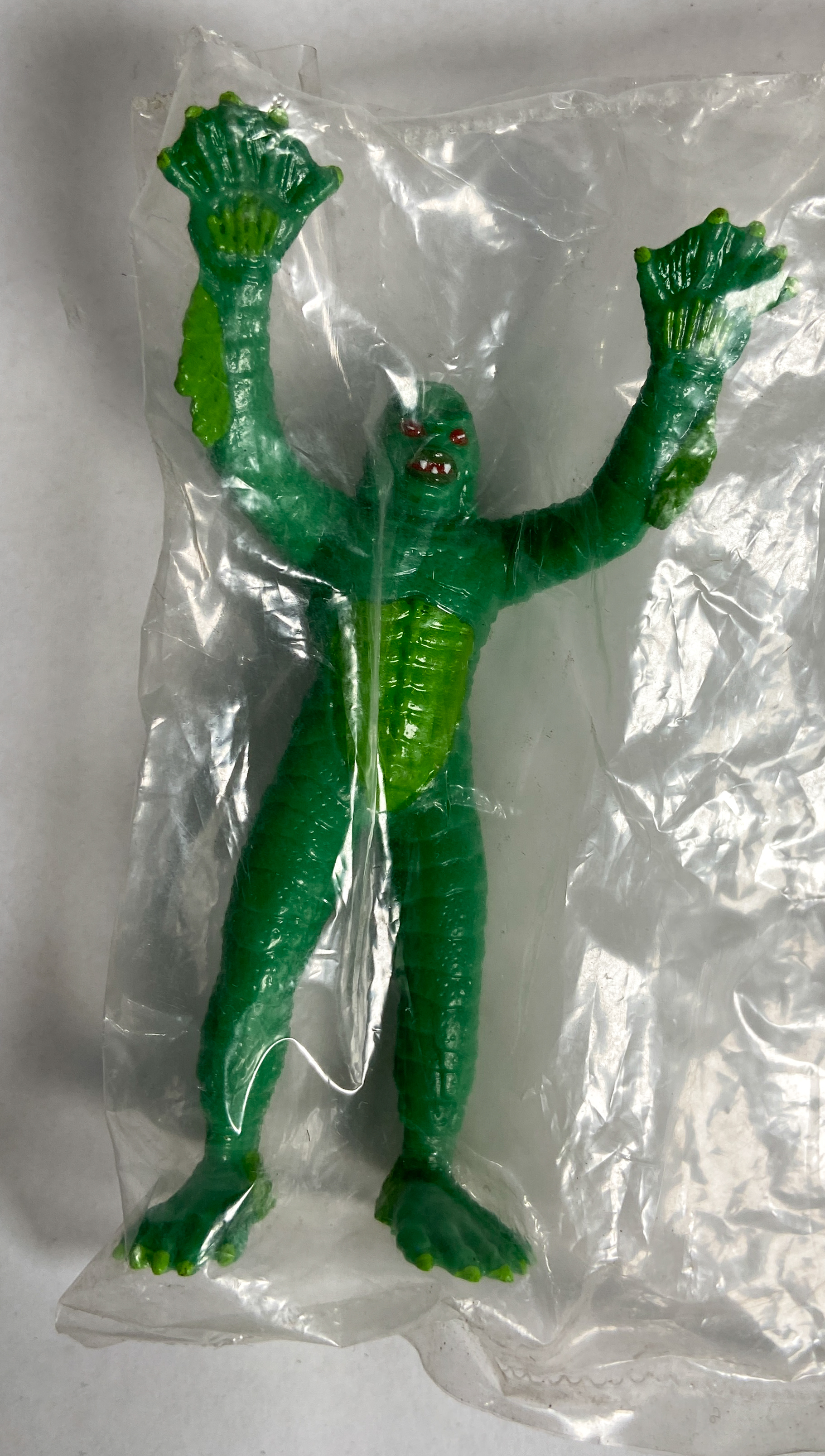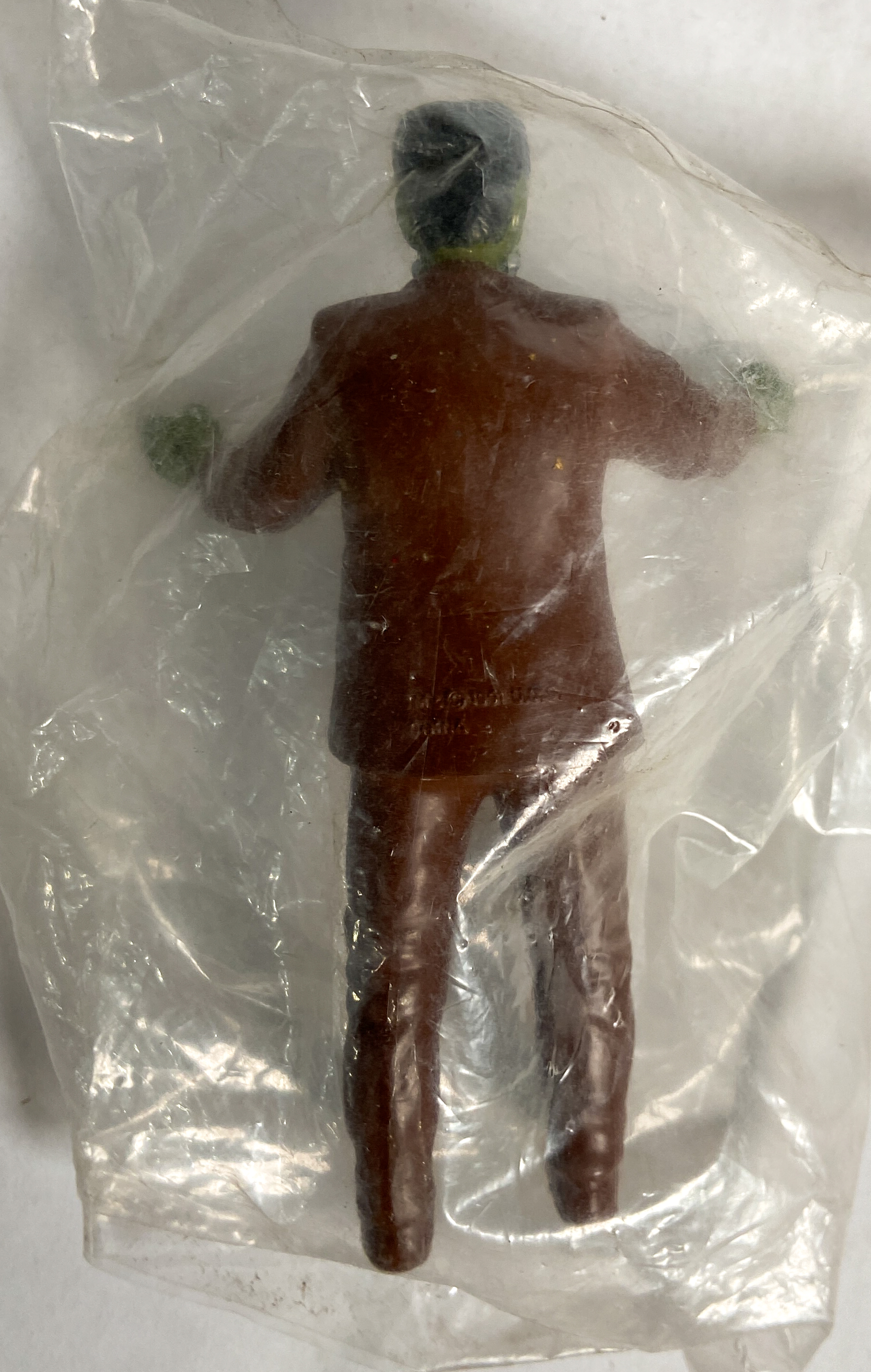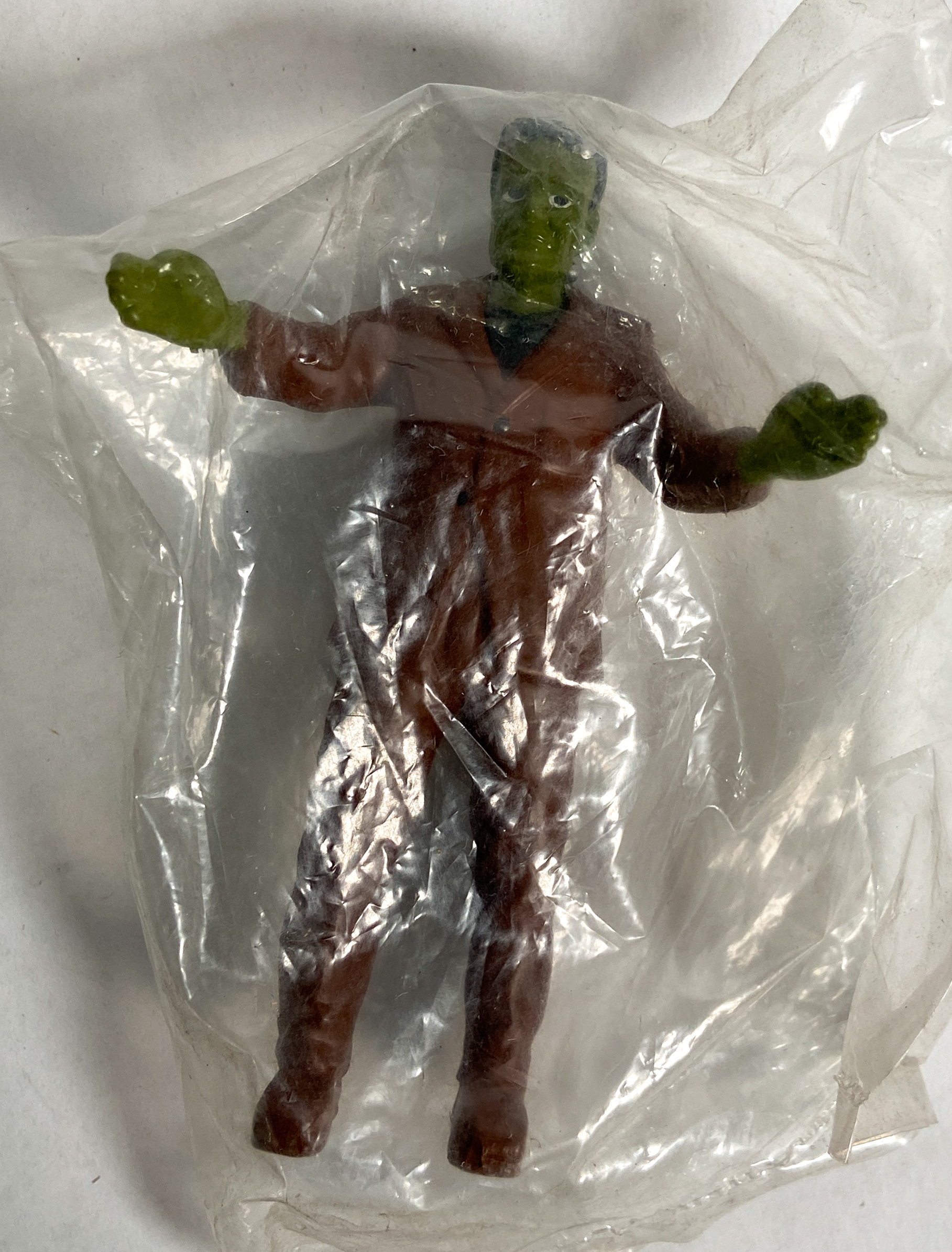 Eight of the nine figures remain in their original, factory-sealed clear plastic polybags. The larger translucent figure is loose. The collection appears to be in good vintage condition, showing only minor shelf wear and light dust accumulation on the exterior of the packaging. Paint and plastic remain vibrant.