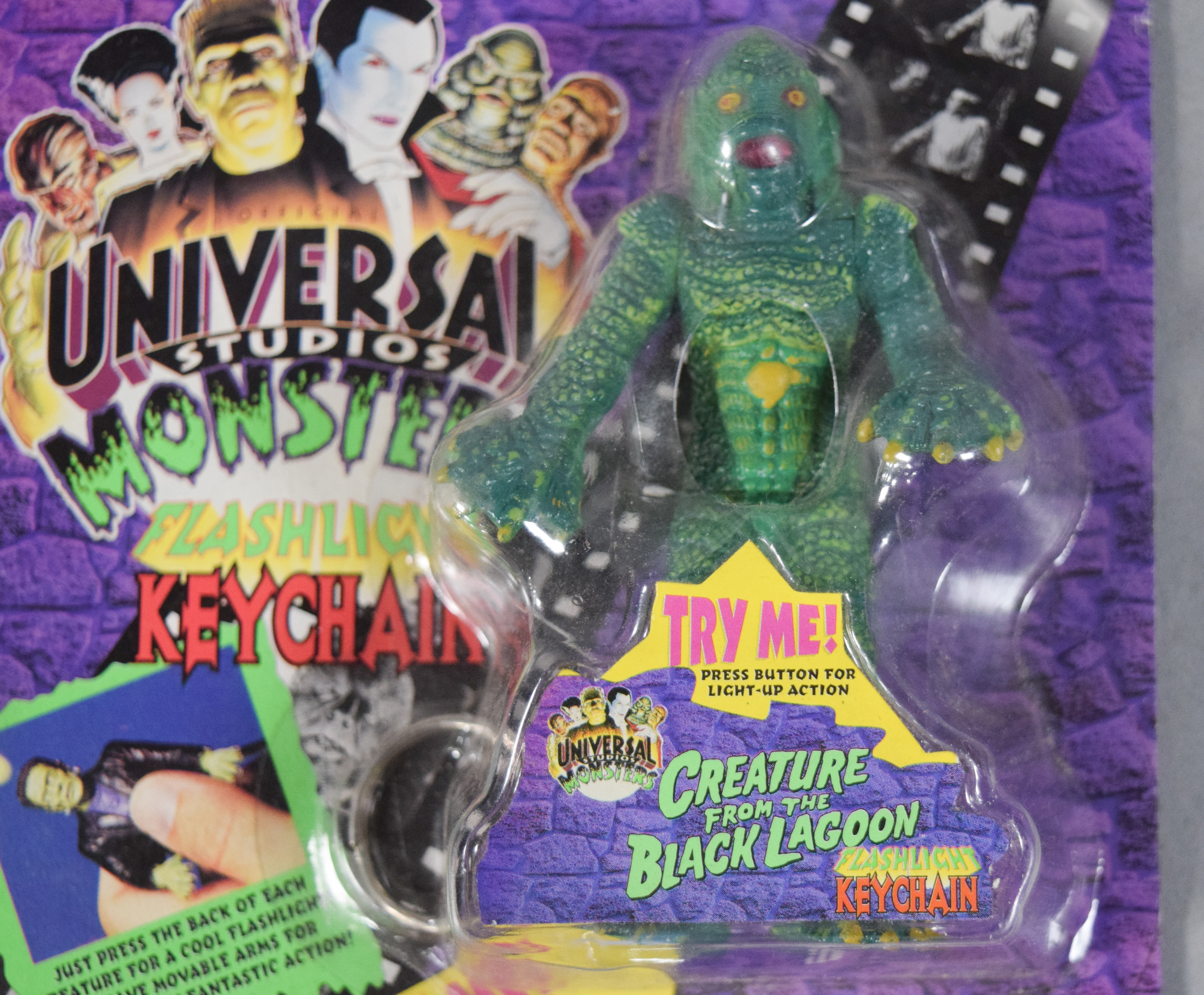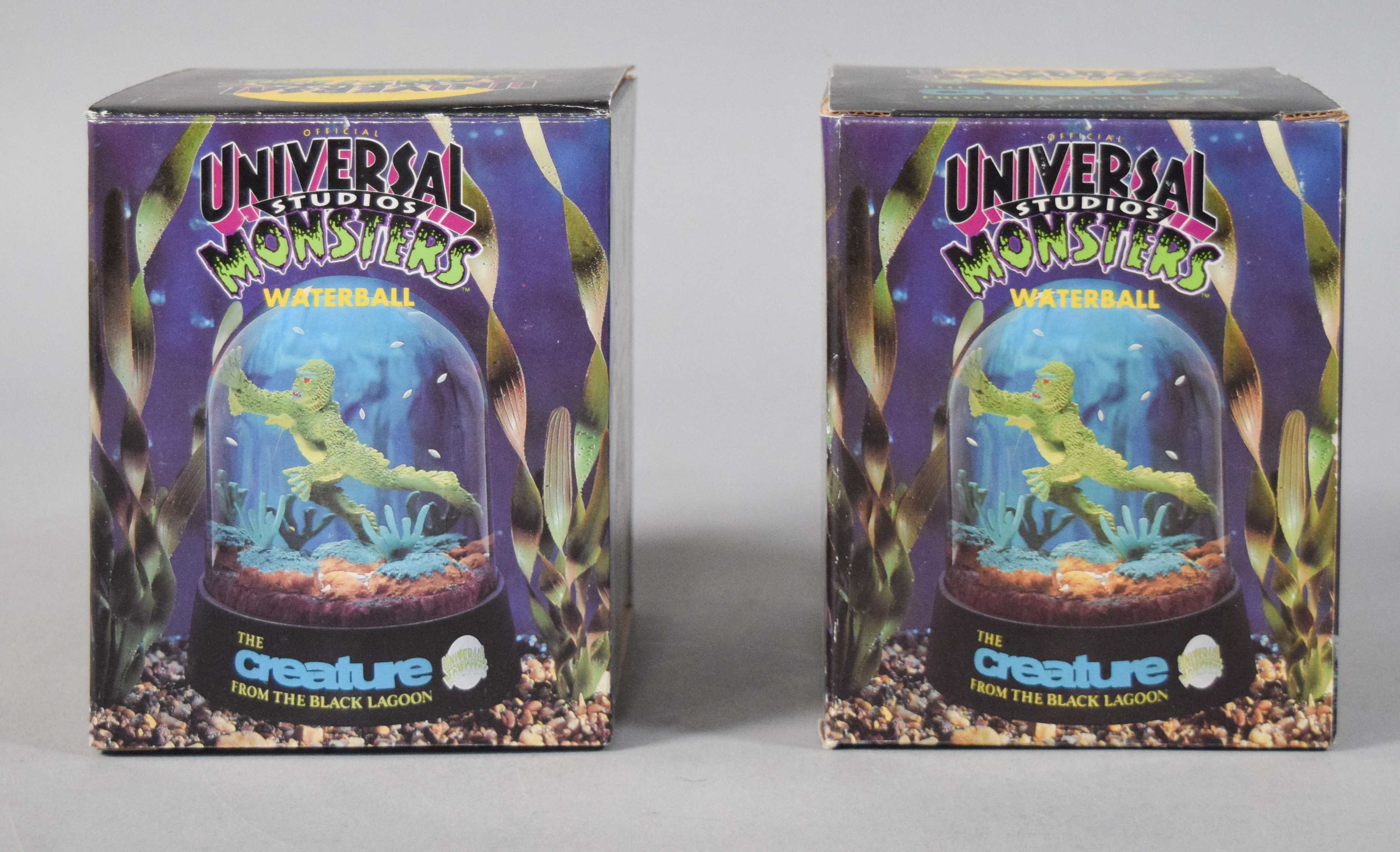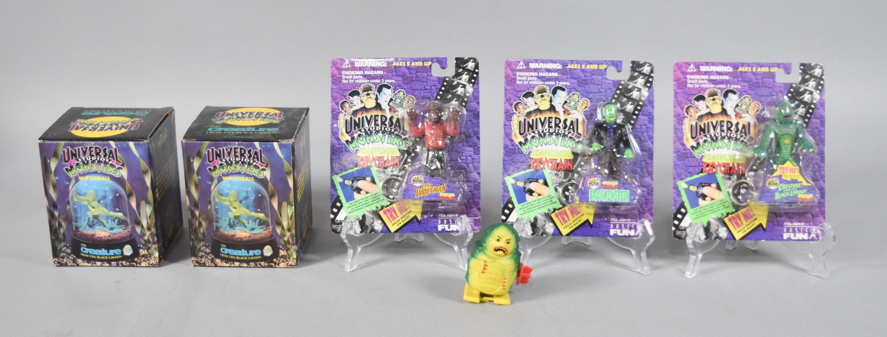Group of various horror and science fiction themed collectibles from the 1990s. Includes two boxed Universal Studios Monsters The Creature from the Black Lagoon waterballs; three Universal Studios Monsters Flashlight Keychains in original blister packaging; several Galoob Micro Machines Space series miniature sets; and one loose plastic wind-up figure depicting the Creature from the Black Lagoon.