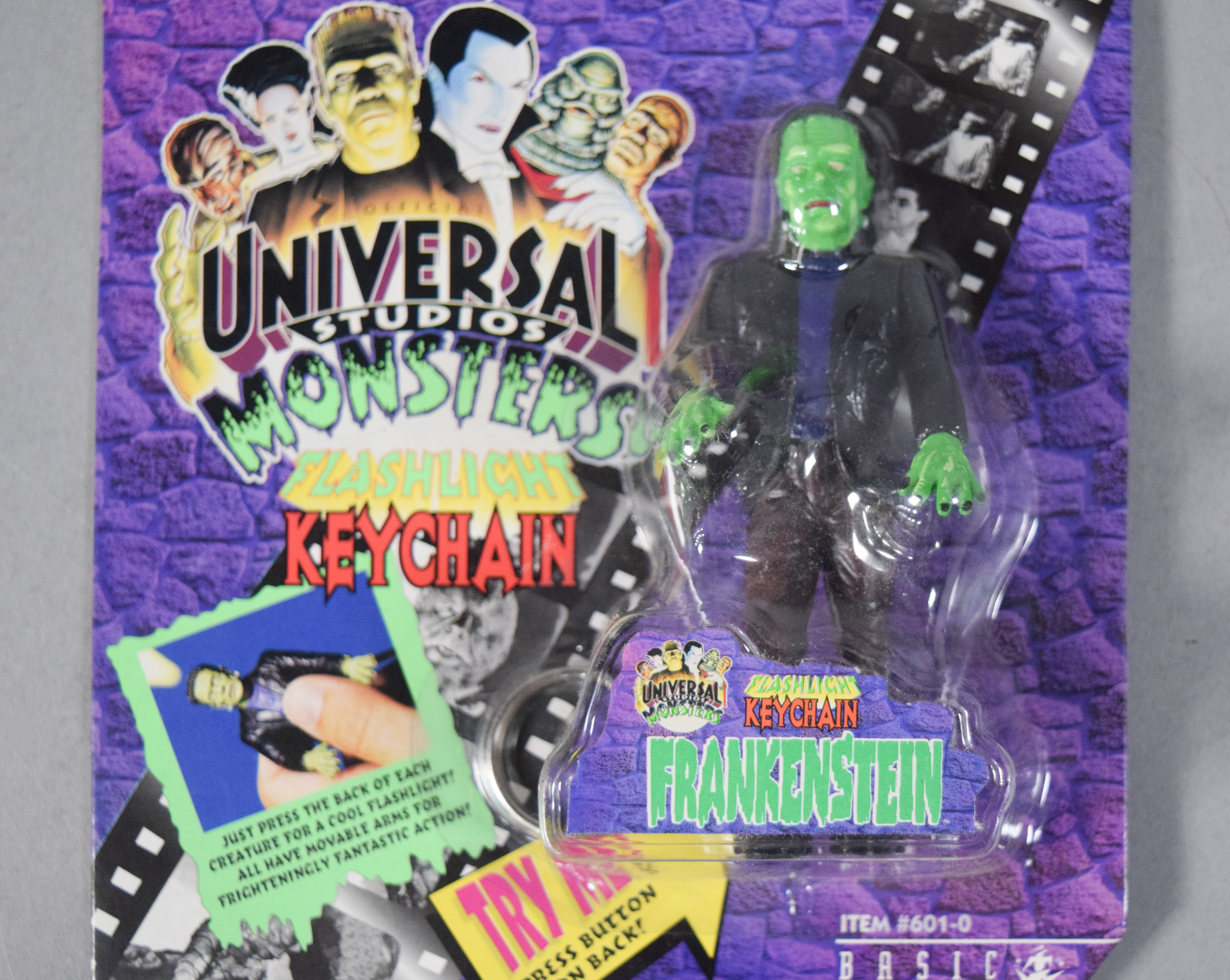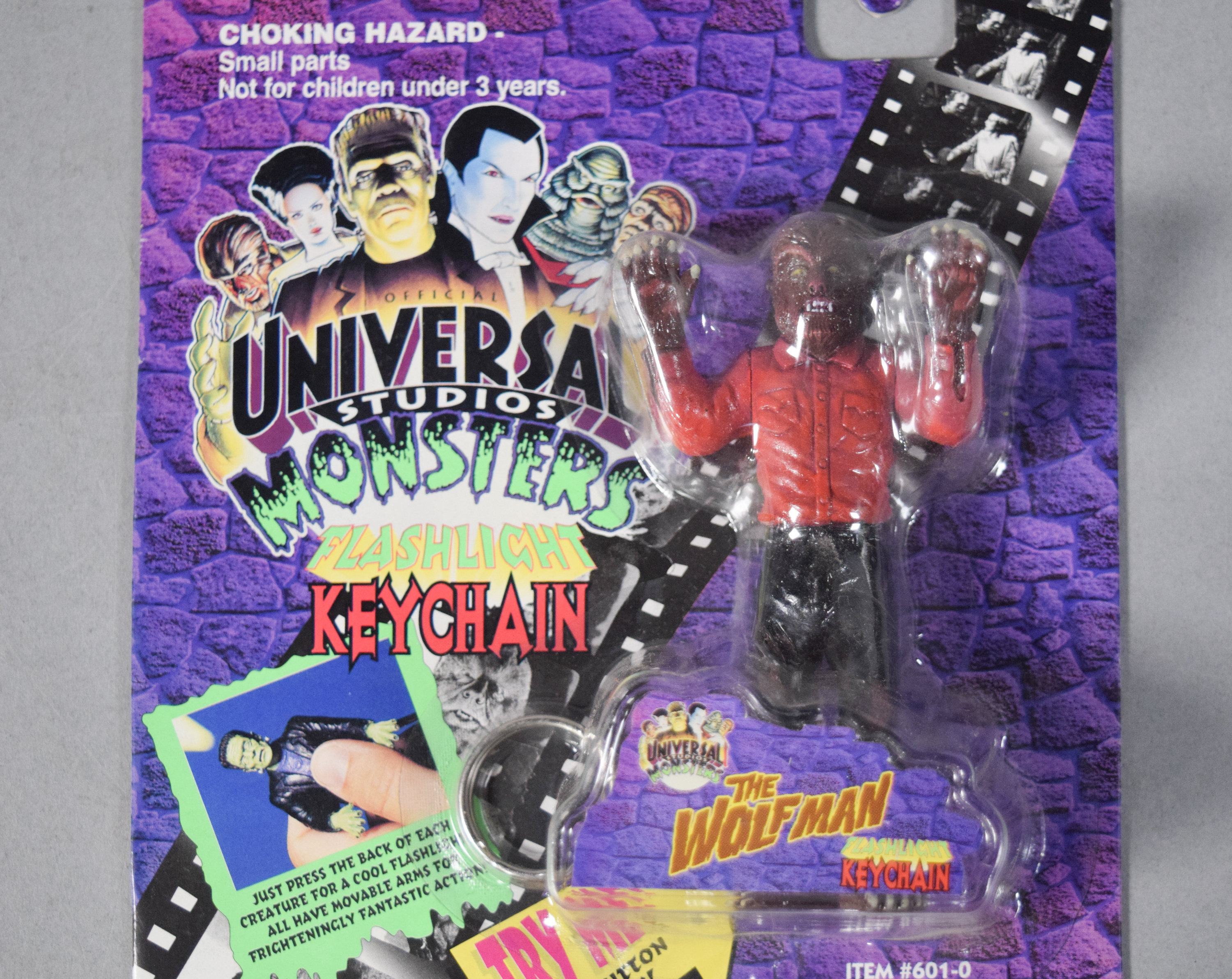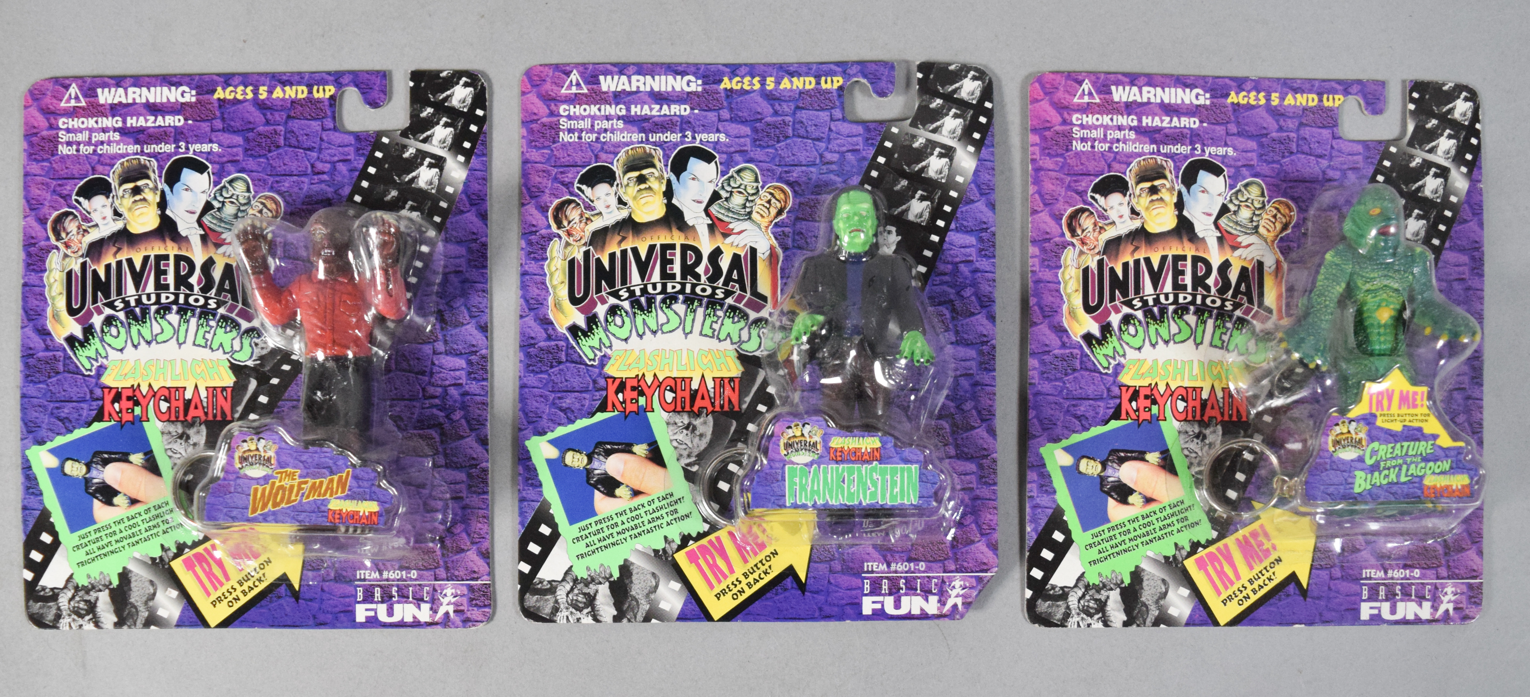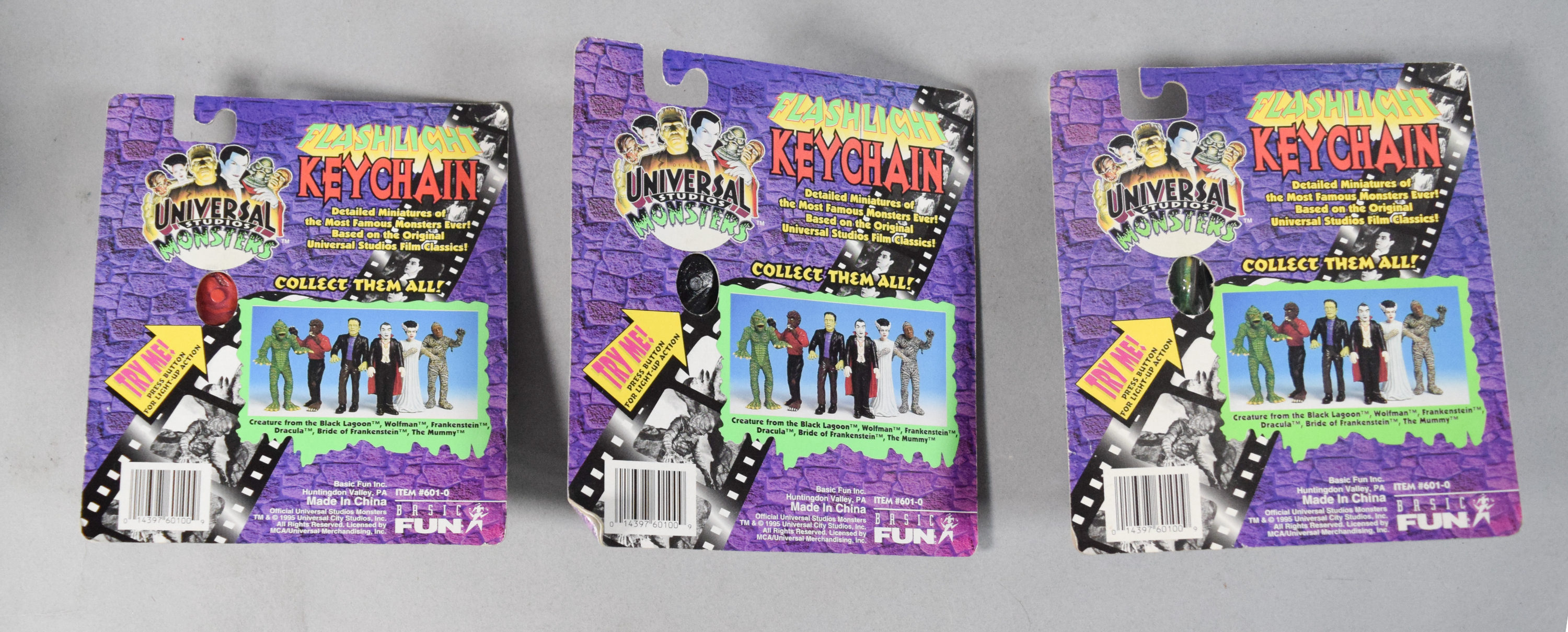 Group of various horror and science fiction themed collectibles from the 1990s. Includes two boxed Universal Studios Monsters The Creature from the Black Lagoon waterballs; three Universal Studios Monsters Flashlight Keychains in original blister packaging; several Galoob Micro Machines Space series miniature sets; and one loose plastic wind-up figure depicting the Creature from the Black Lagoon.