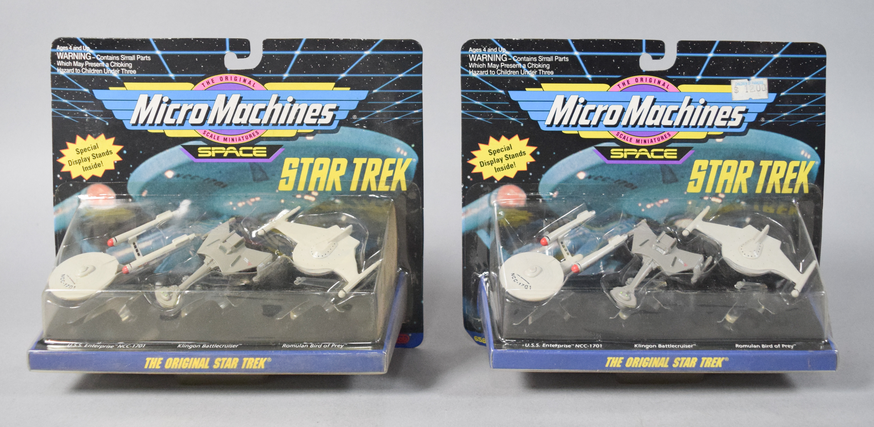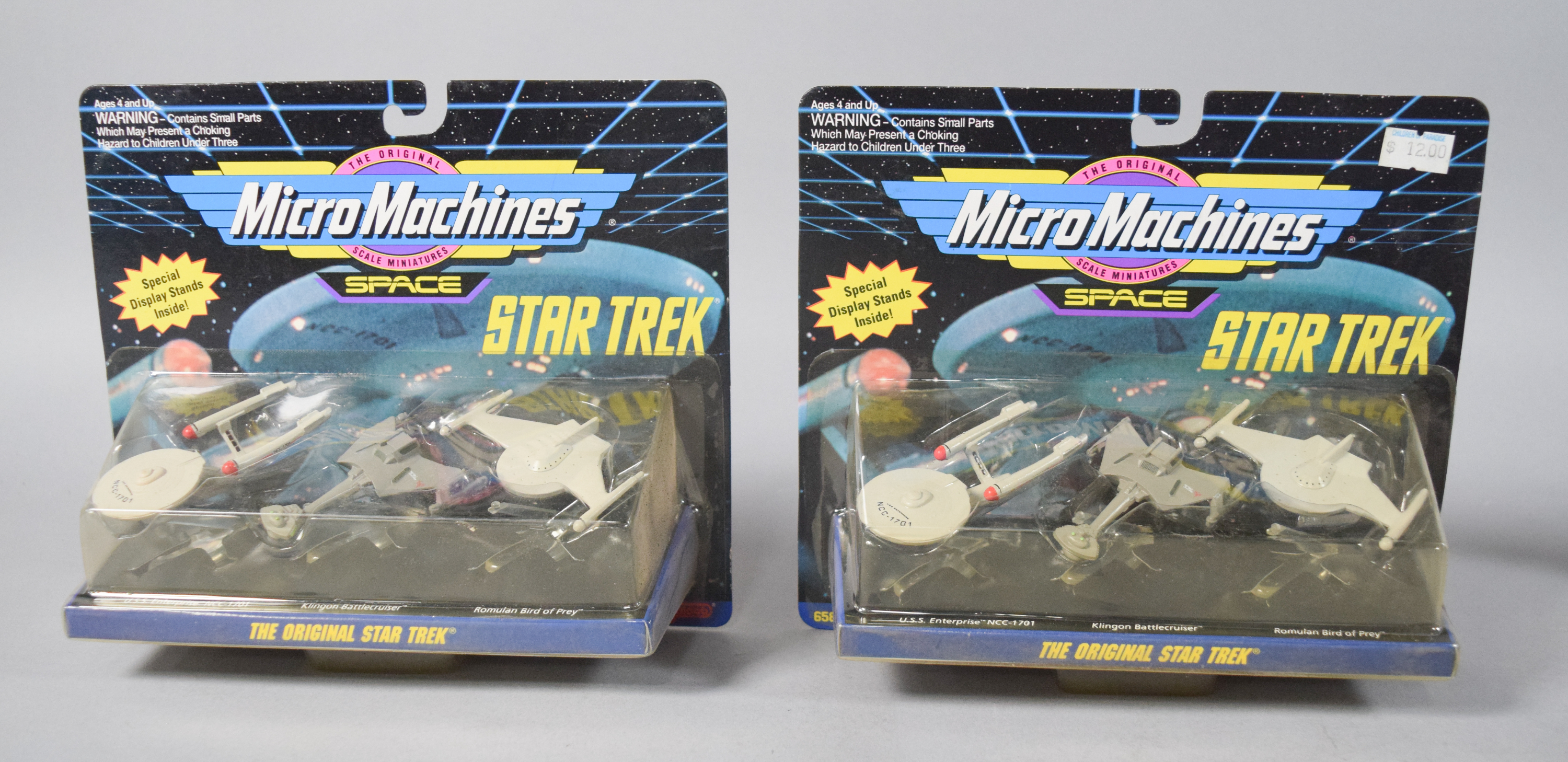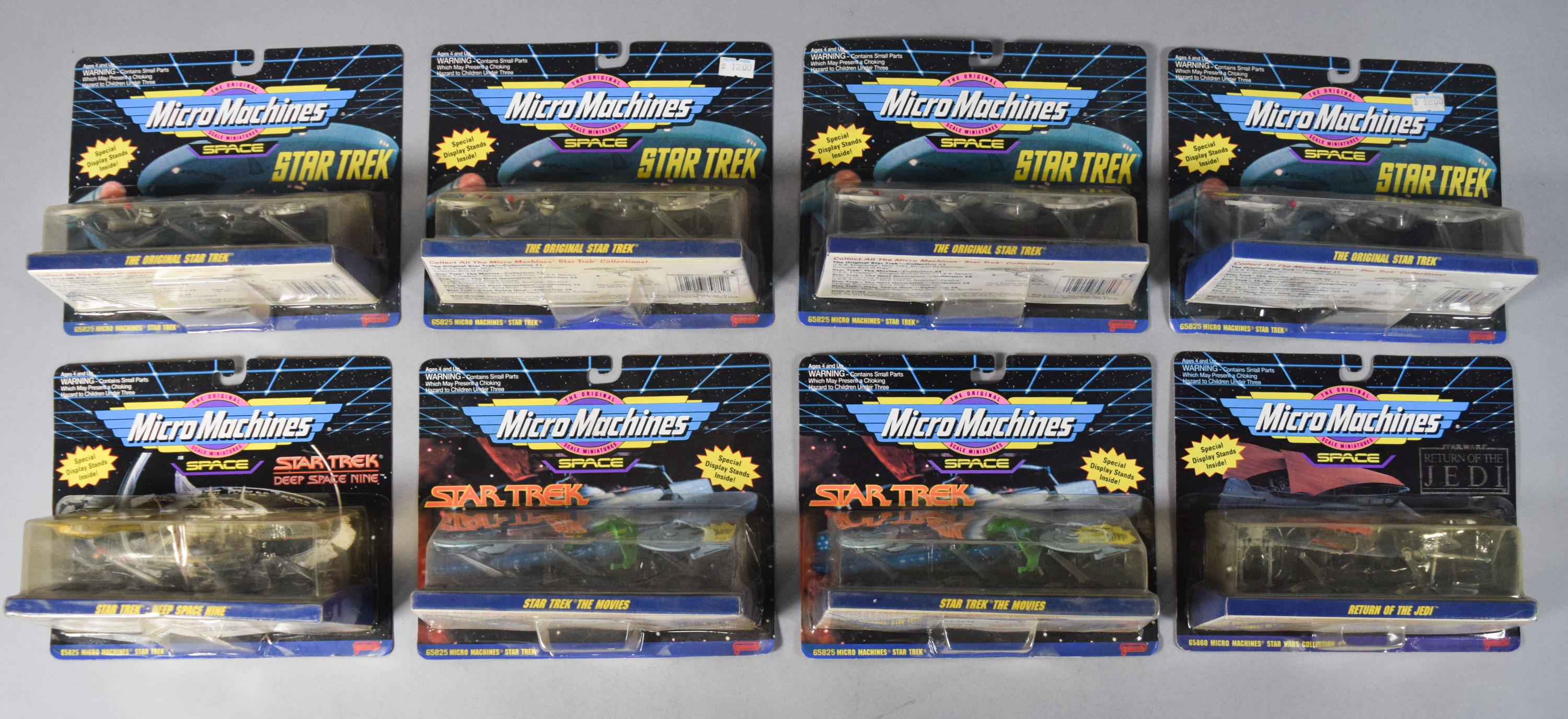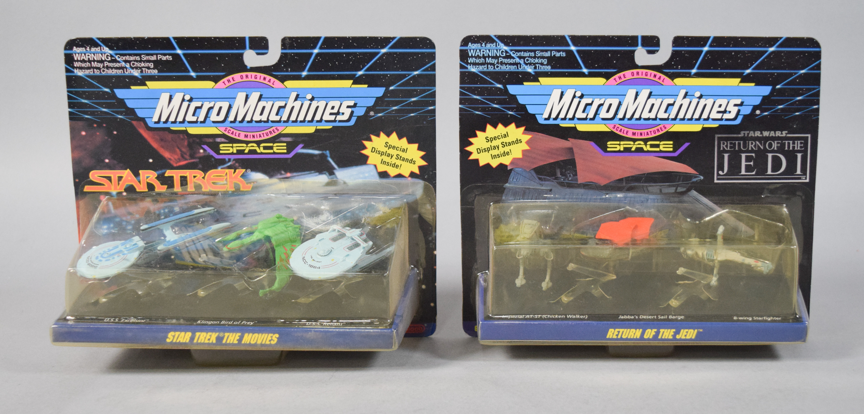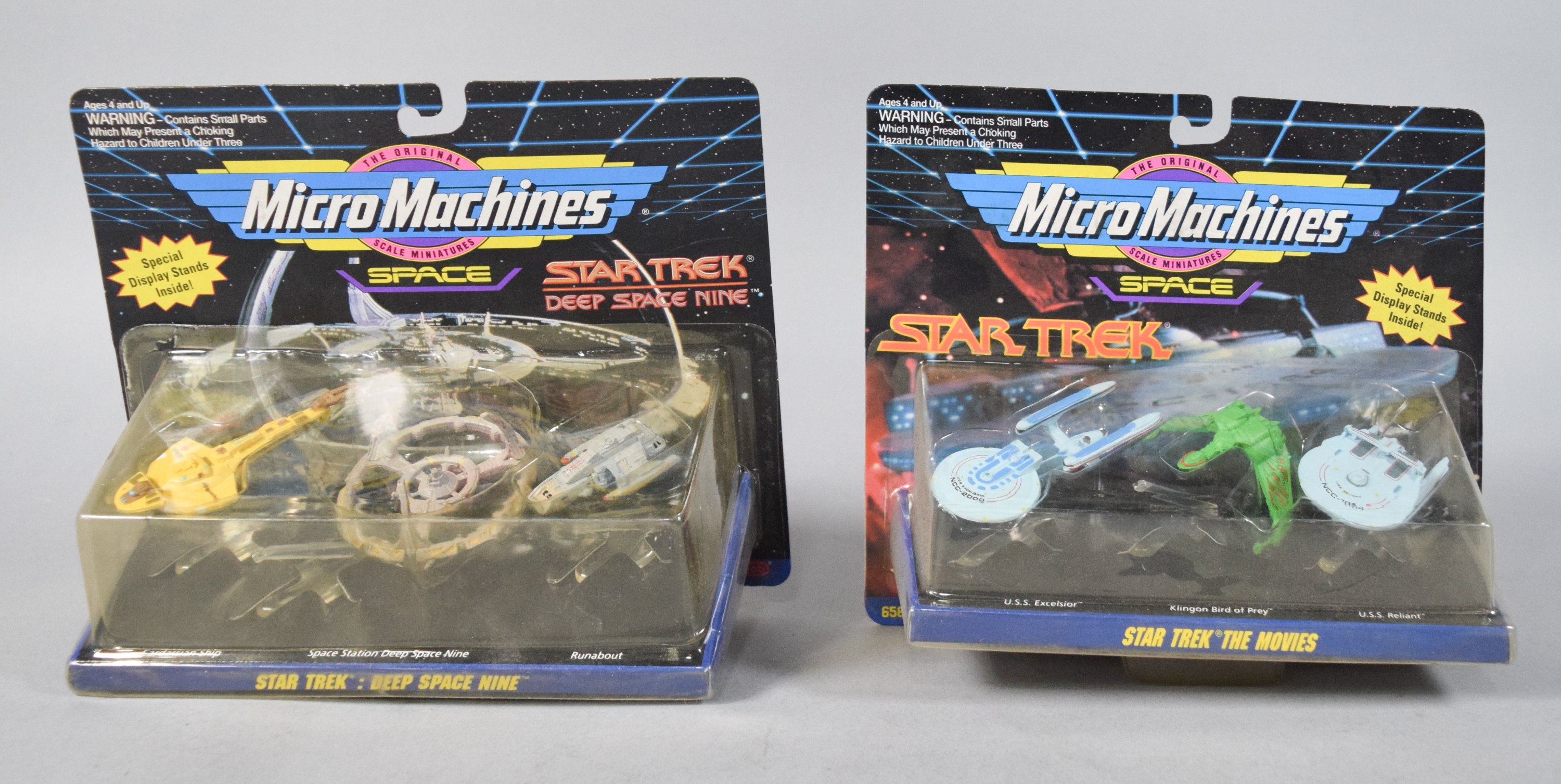 Most items remain in their original retail packaging. The cardboard components exhibit minor shelf wear consistent with age, including light edge wear and corner softening. The plastic blister packs appear generally secure to the cards. The loose wind-up figure shows minor surface marks.