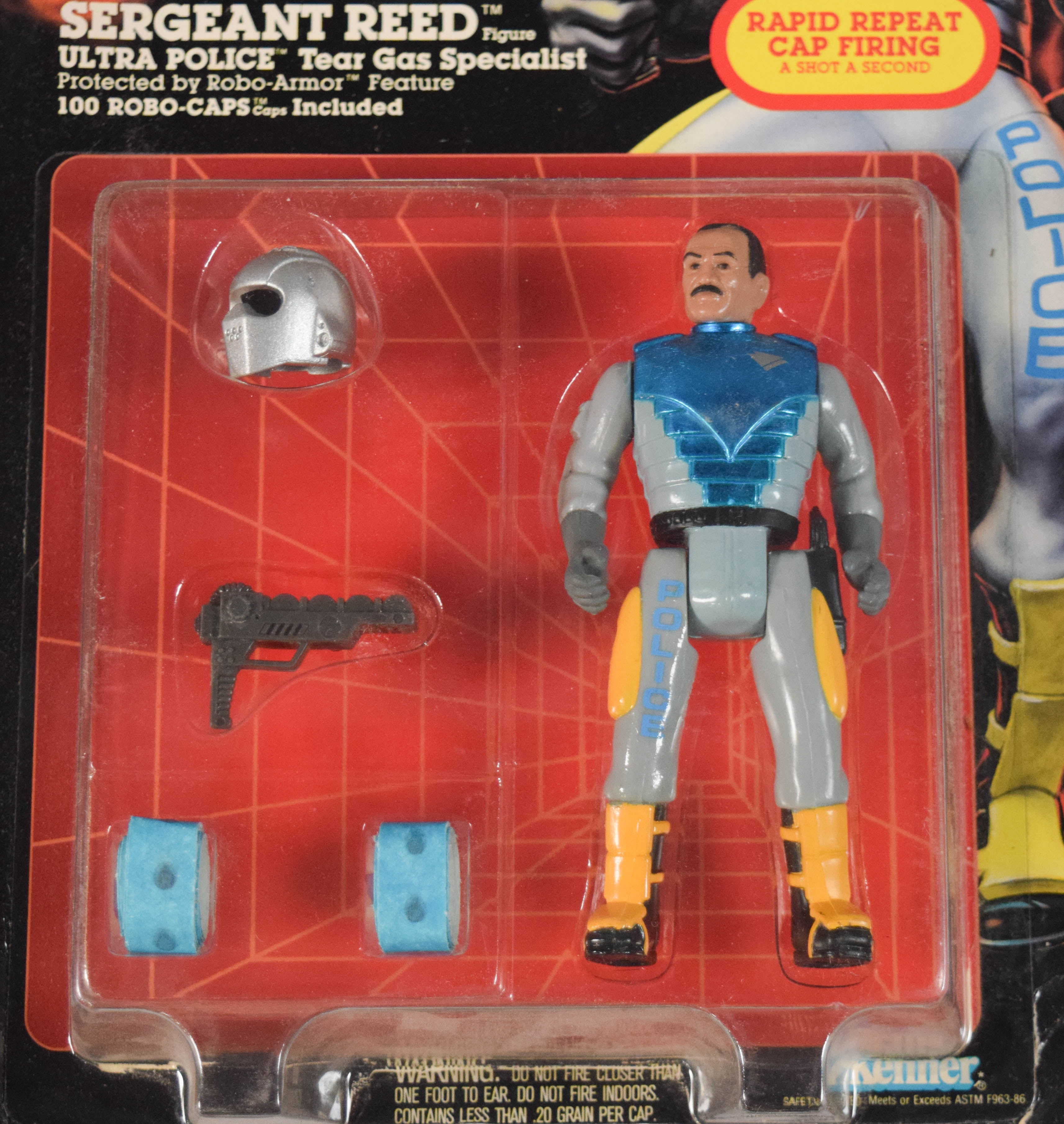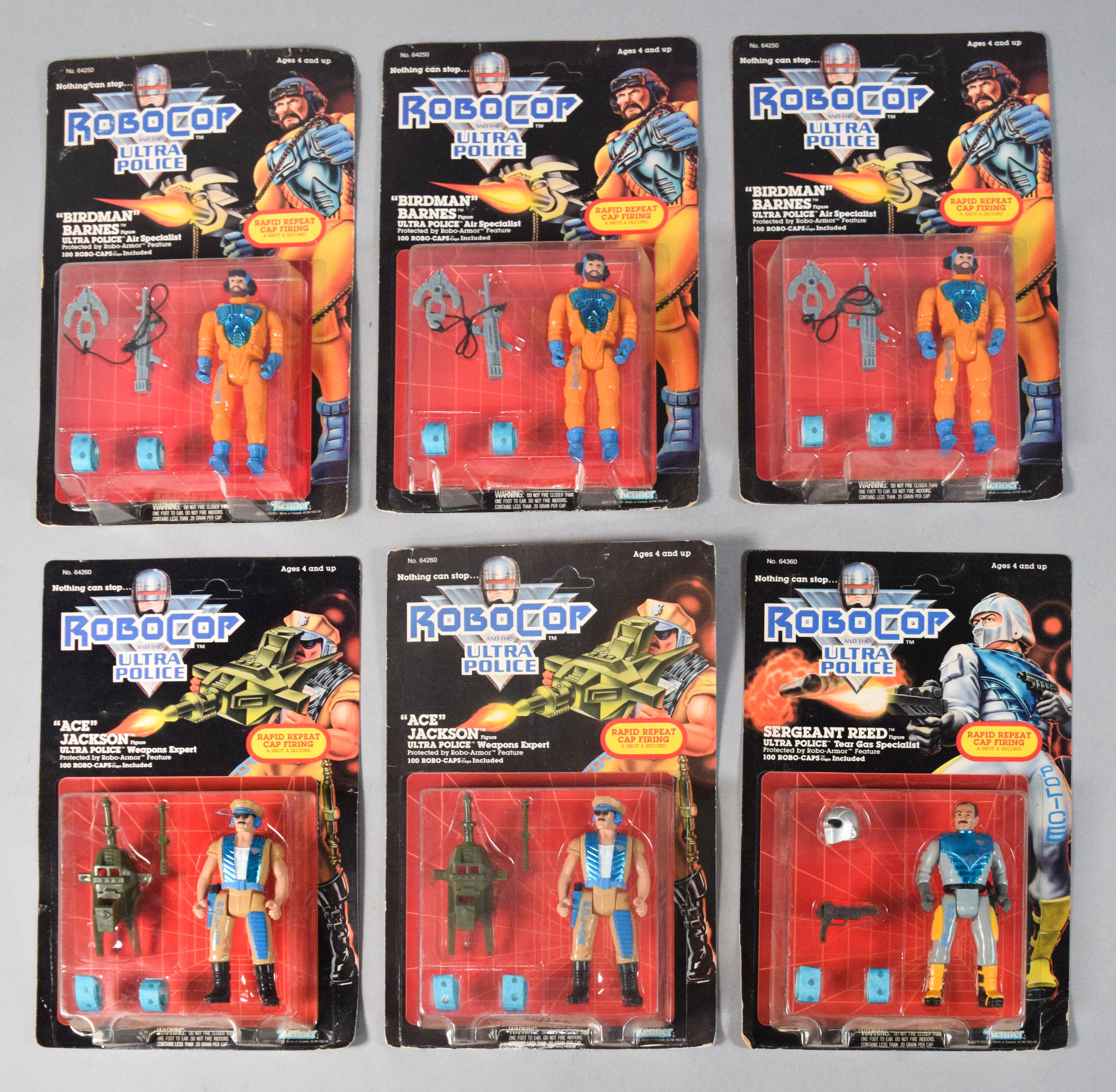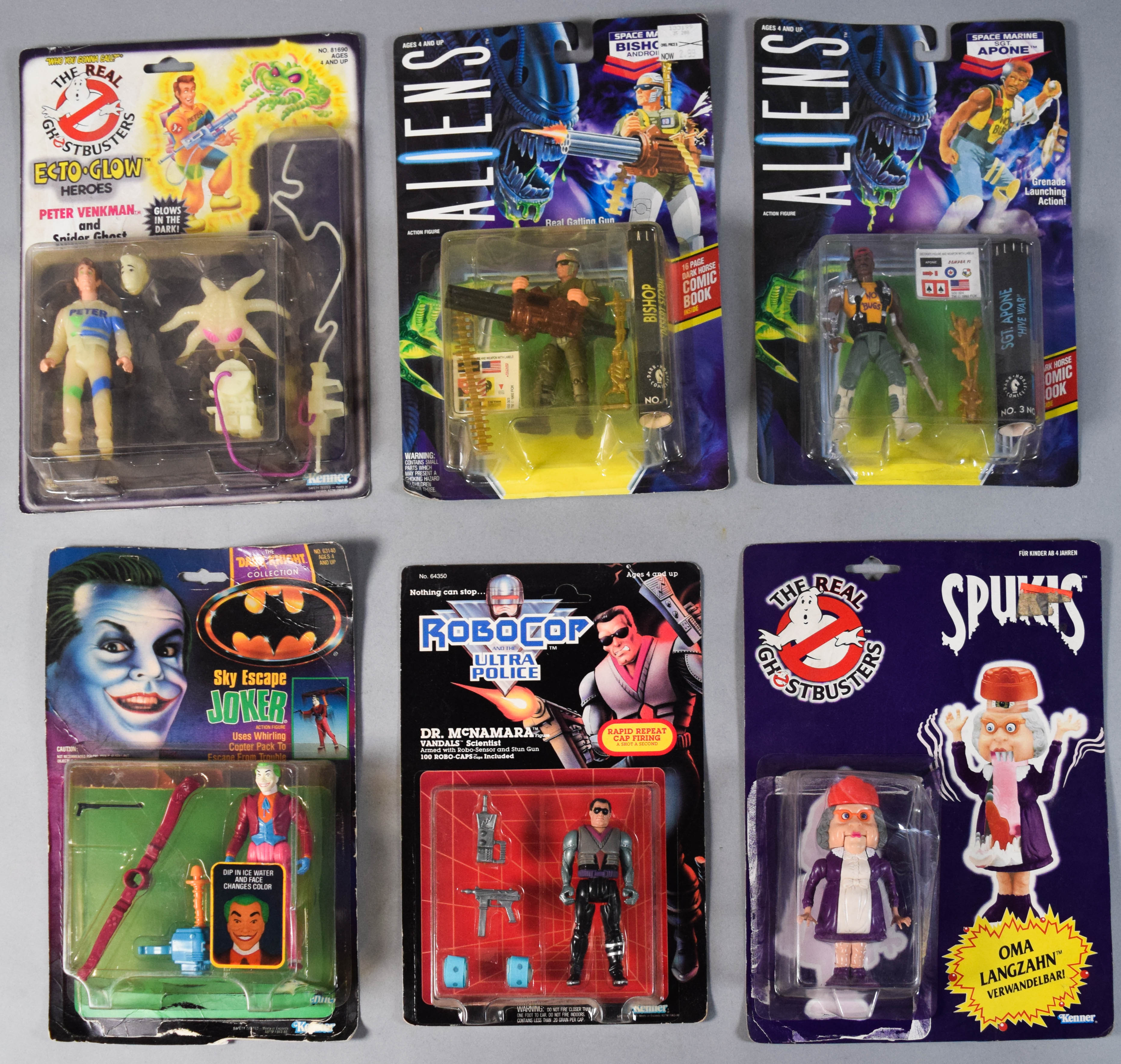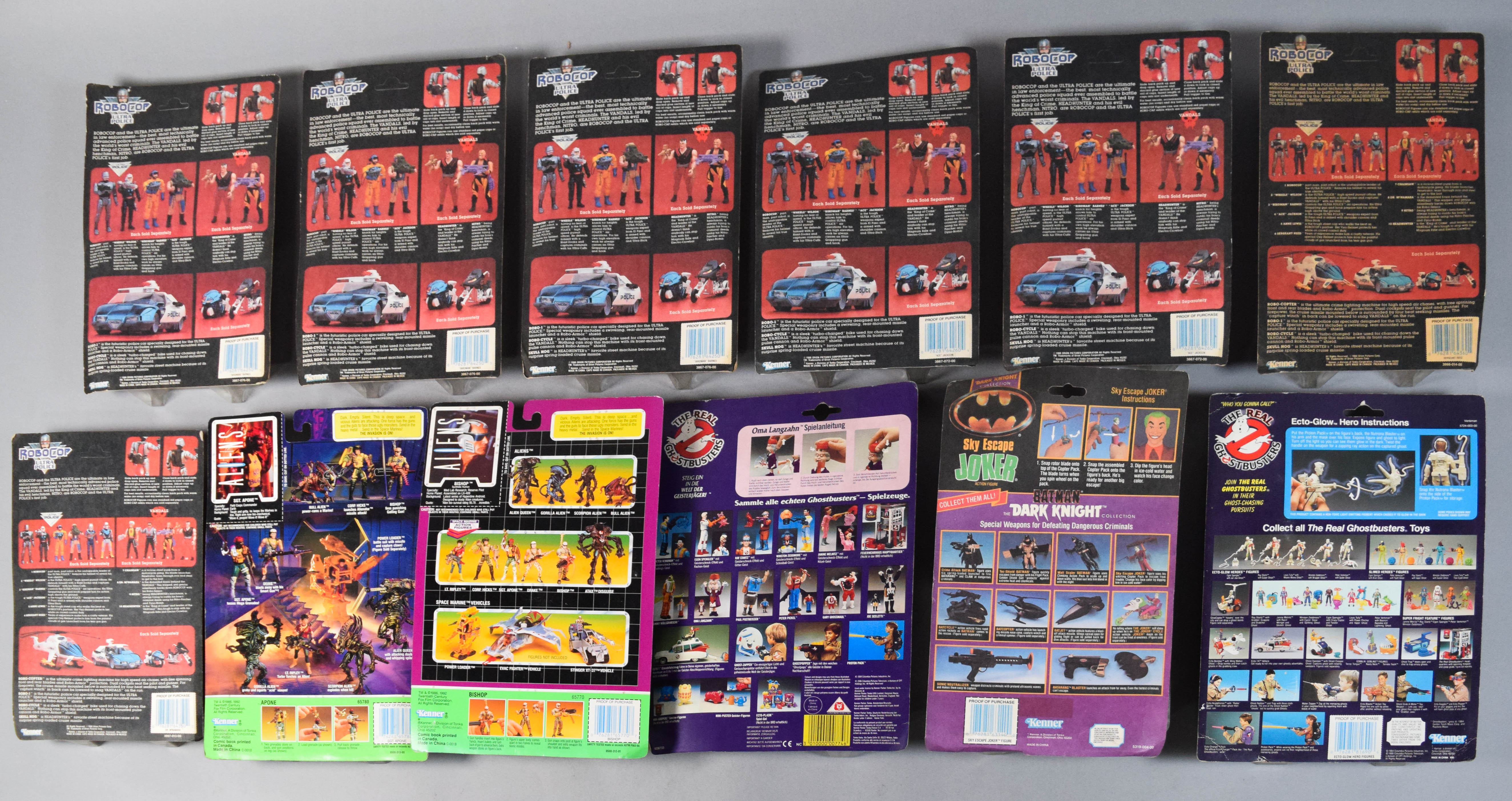 Collection of 12 factory-sealed vintage action figures manufactured by Kenner c. 1988-1992. Includes seven figures from RoboCop and Ultra Police; two Aliens figures; two Ghostbusters figures; and one Sky Escape Joker figure. Largest cardback 13″ H x 8″ W.