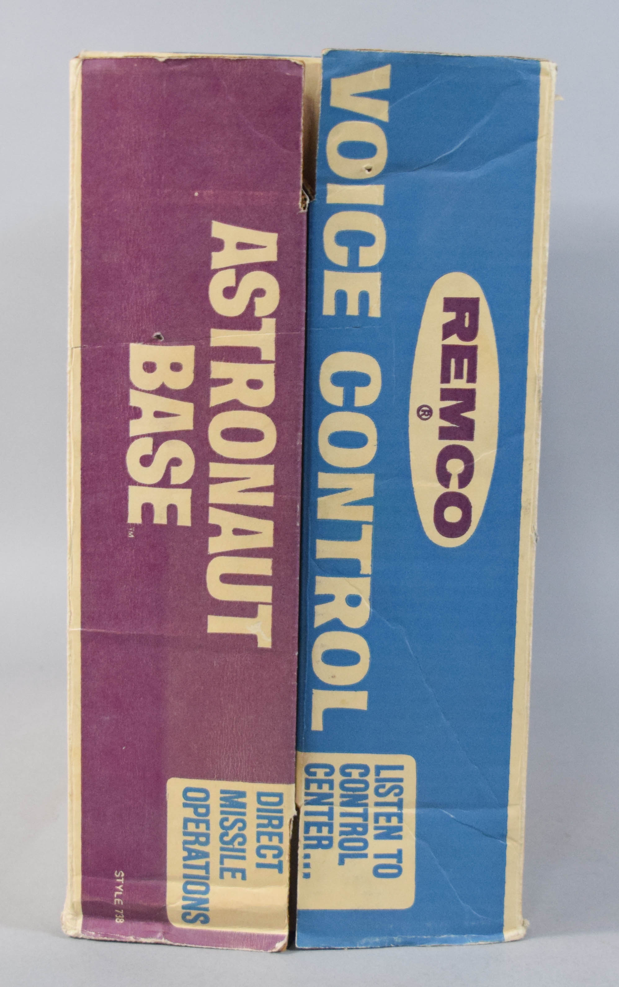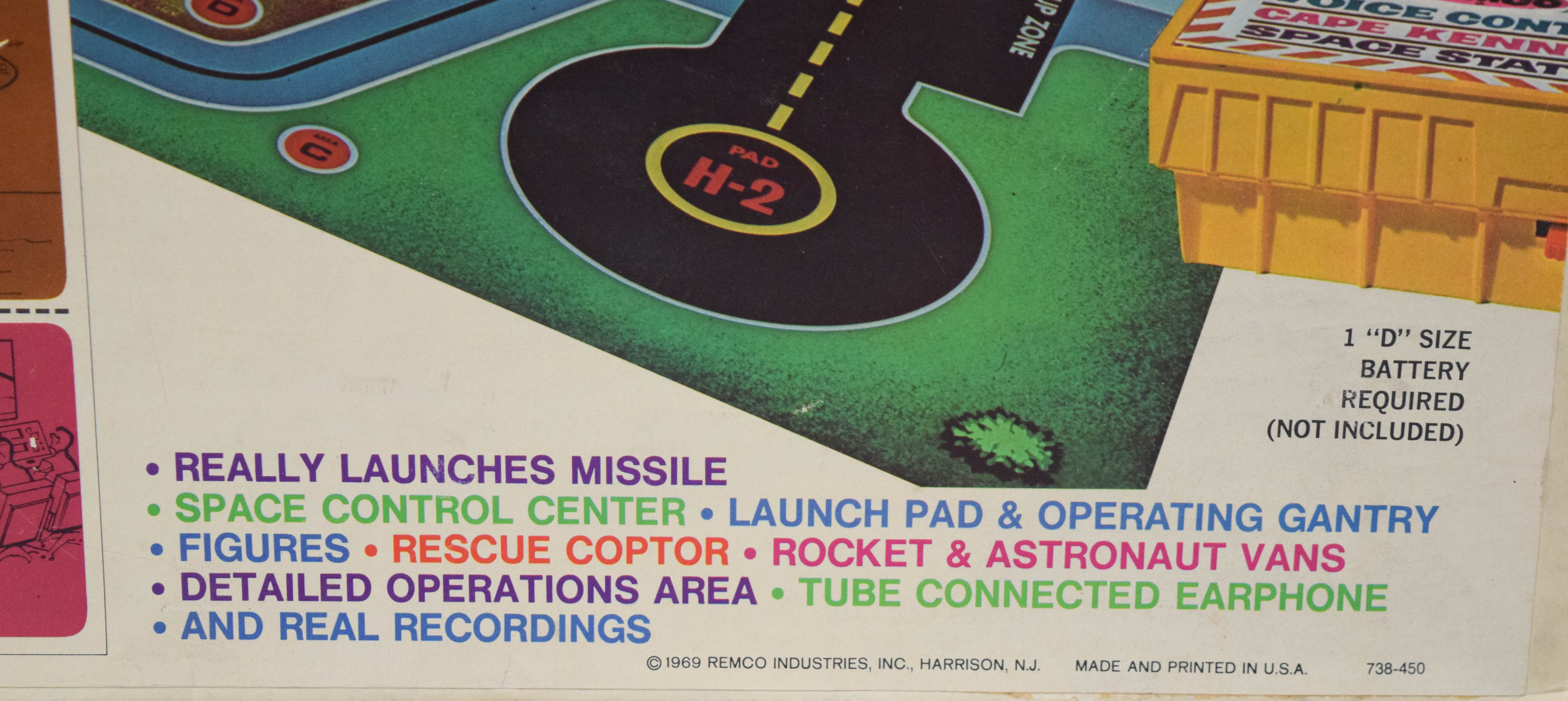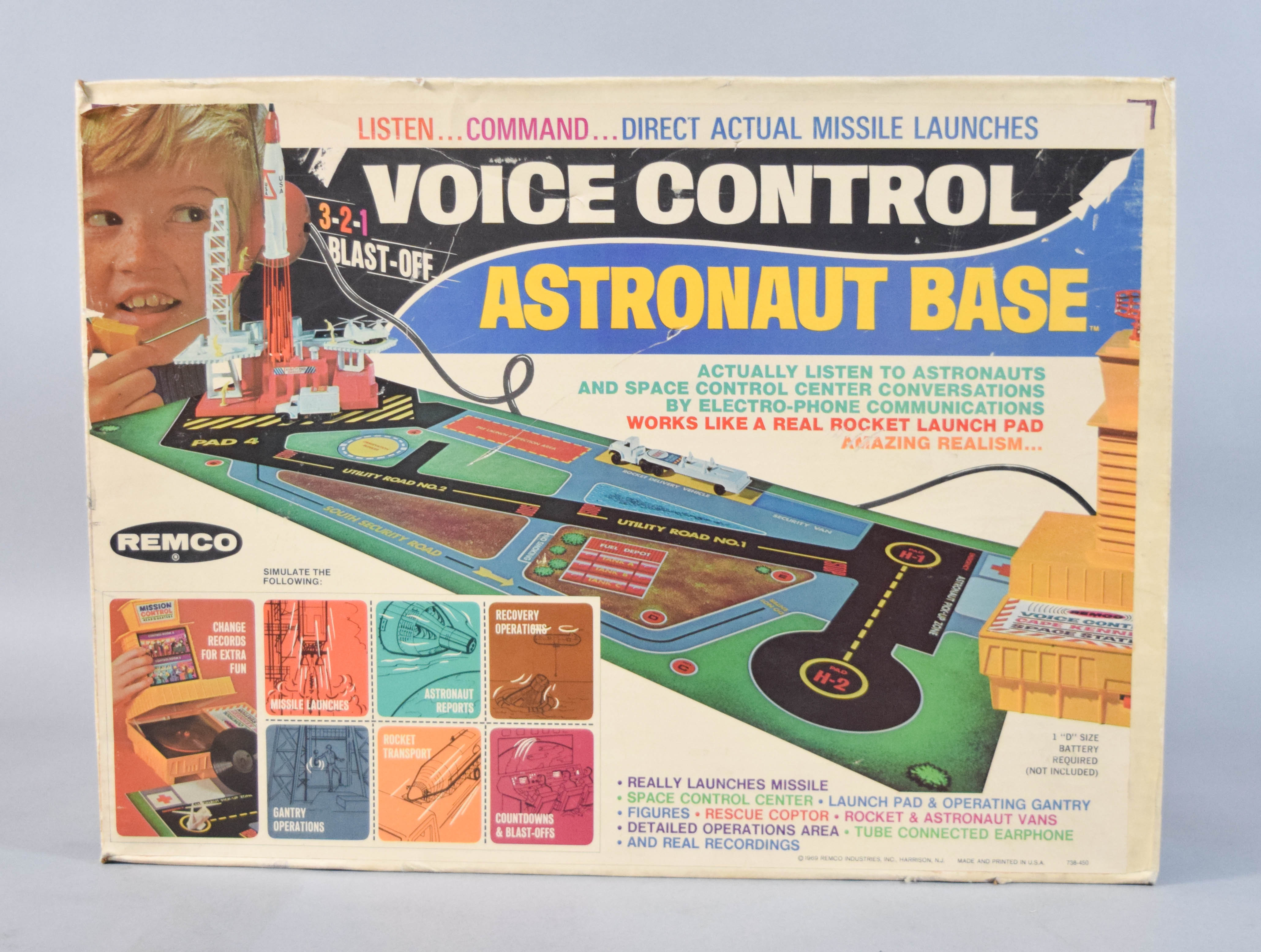 Vintage Voice Control Astronaut Base, Style #738, manufactured by Remco in 1969 during the height of the American space race. The construction consists of a lithographed cardboard play base and various plastic structures. The set features an electro-phone communication system powered by a Japanese motor, intended to play the included audio record so the user can listen to astronaut and mission control conversations through a tube-connected earphone. Not tested. The set includes a headset with a metal frame, a small audio record, and various plastic accessory pieces. 14.5″ H x 19.5″ W x 7.5″ D.