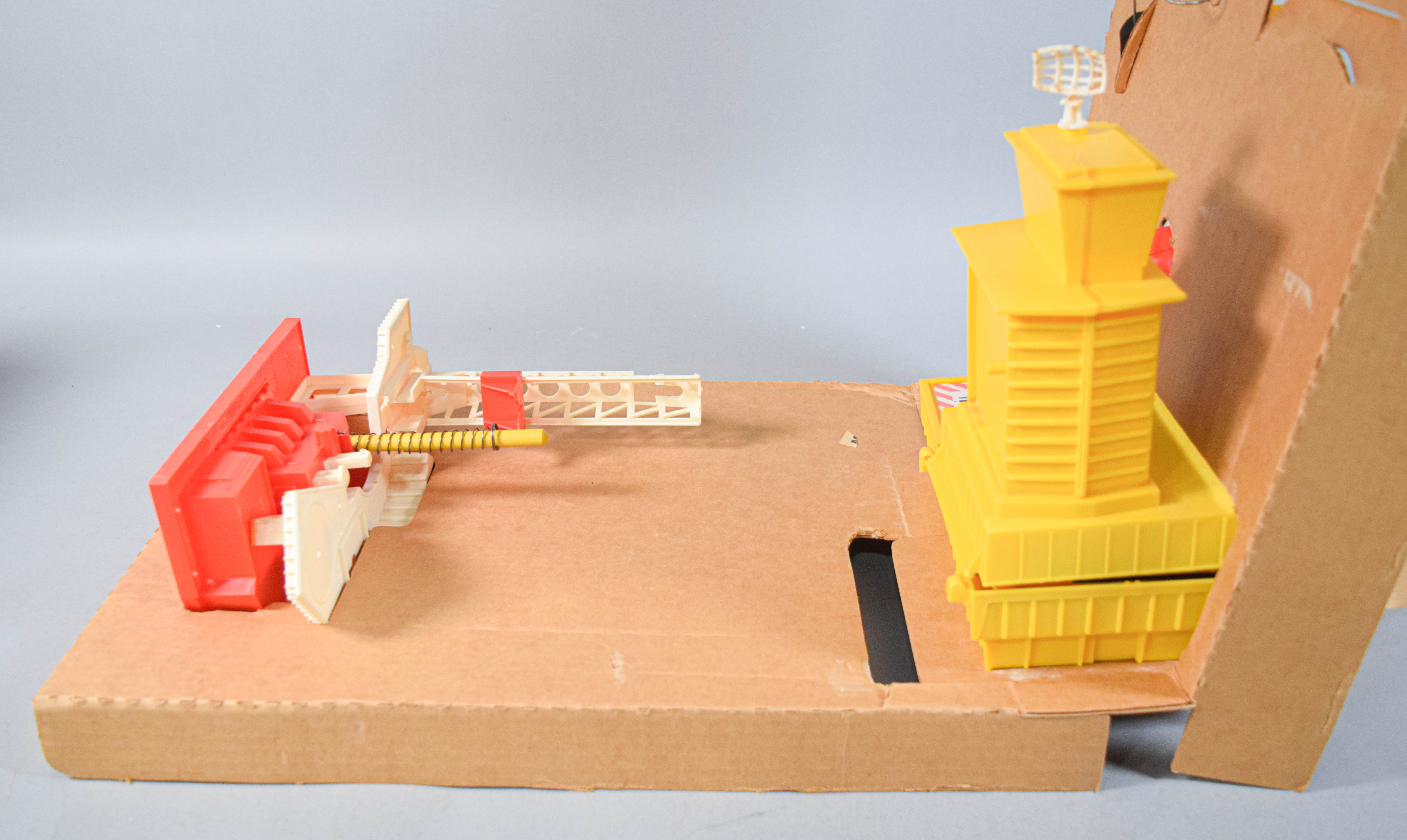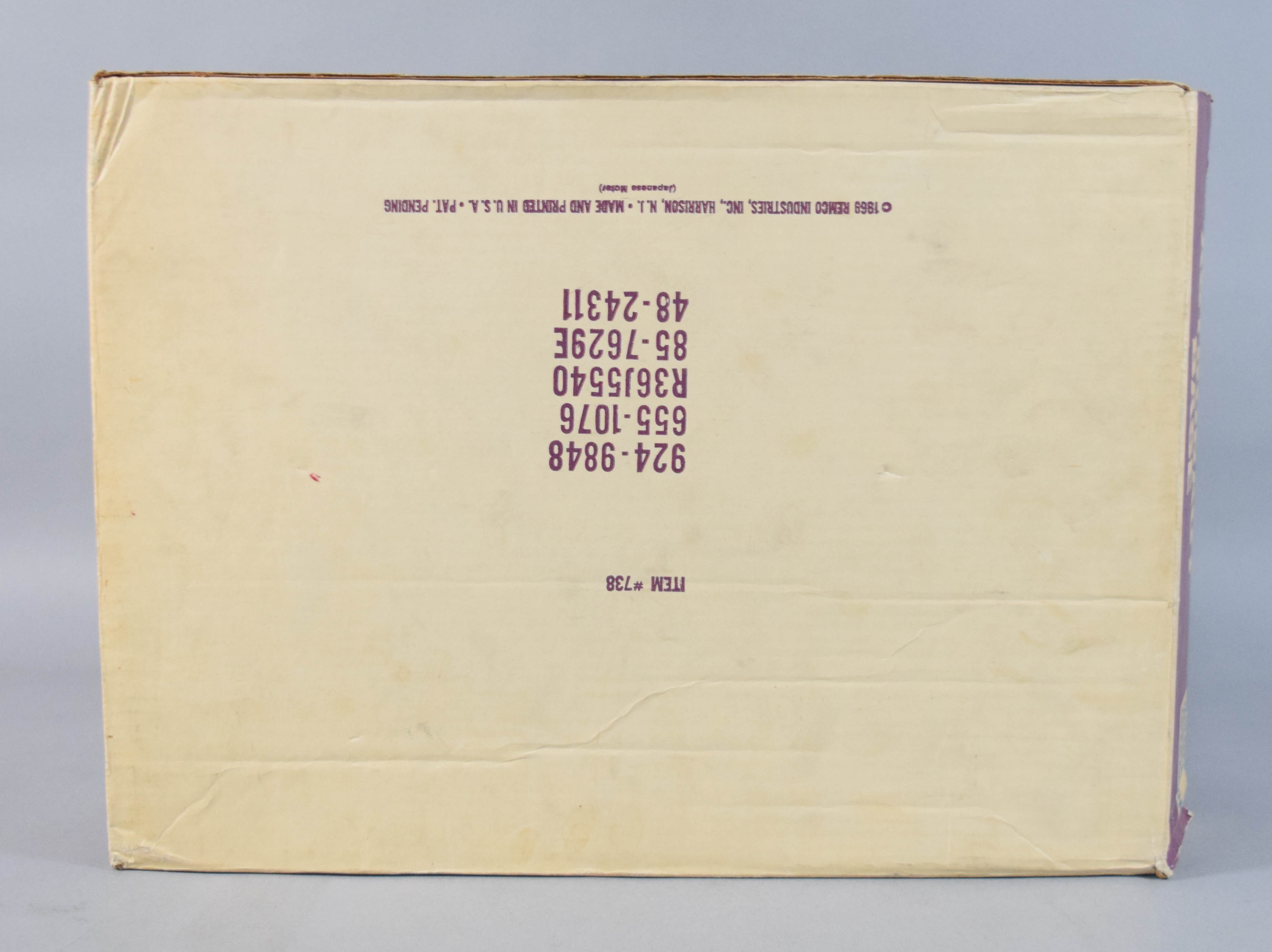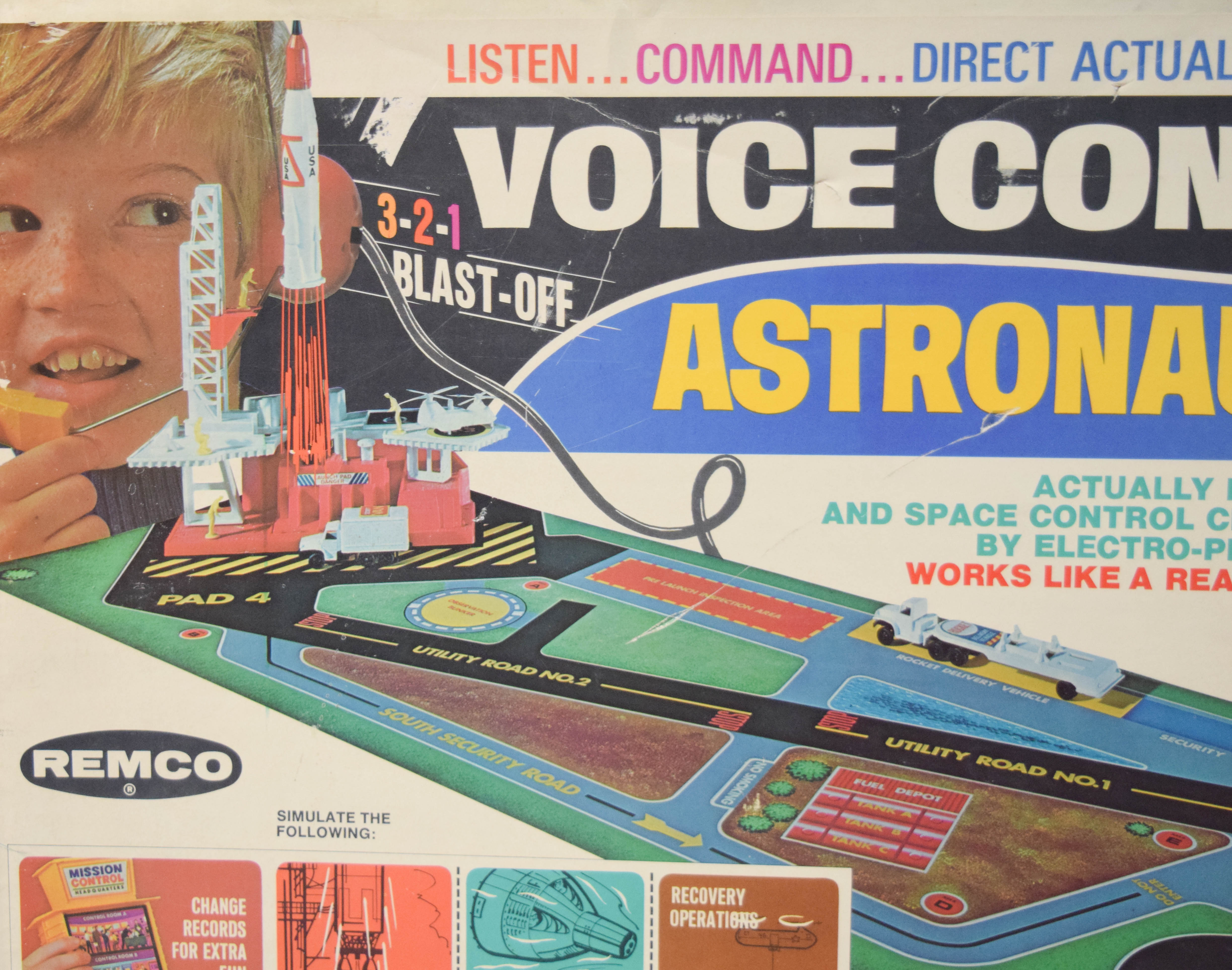 Vintage Voice Control Astronaut Base, Style #738, manufactured by Remco in 1969 during the height of the American space race. The construction consists of a lithographed cardboard play base and various plastic structures. The set features an electro-phone communication system powered by a Japanese motor, intended to play the included audio record so the user can listen to astronaut and mission control conversations through a tube-connected earphone. Not tested. The set includes a headset with a metal frame, a small audio record, and various plastic accessory pieces. 14.5″ H x 19.5″ W x 7.5″ D.