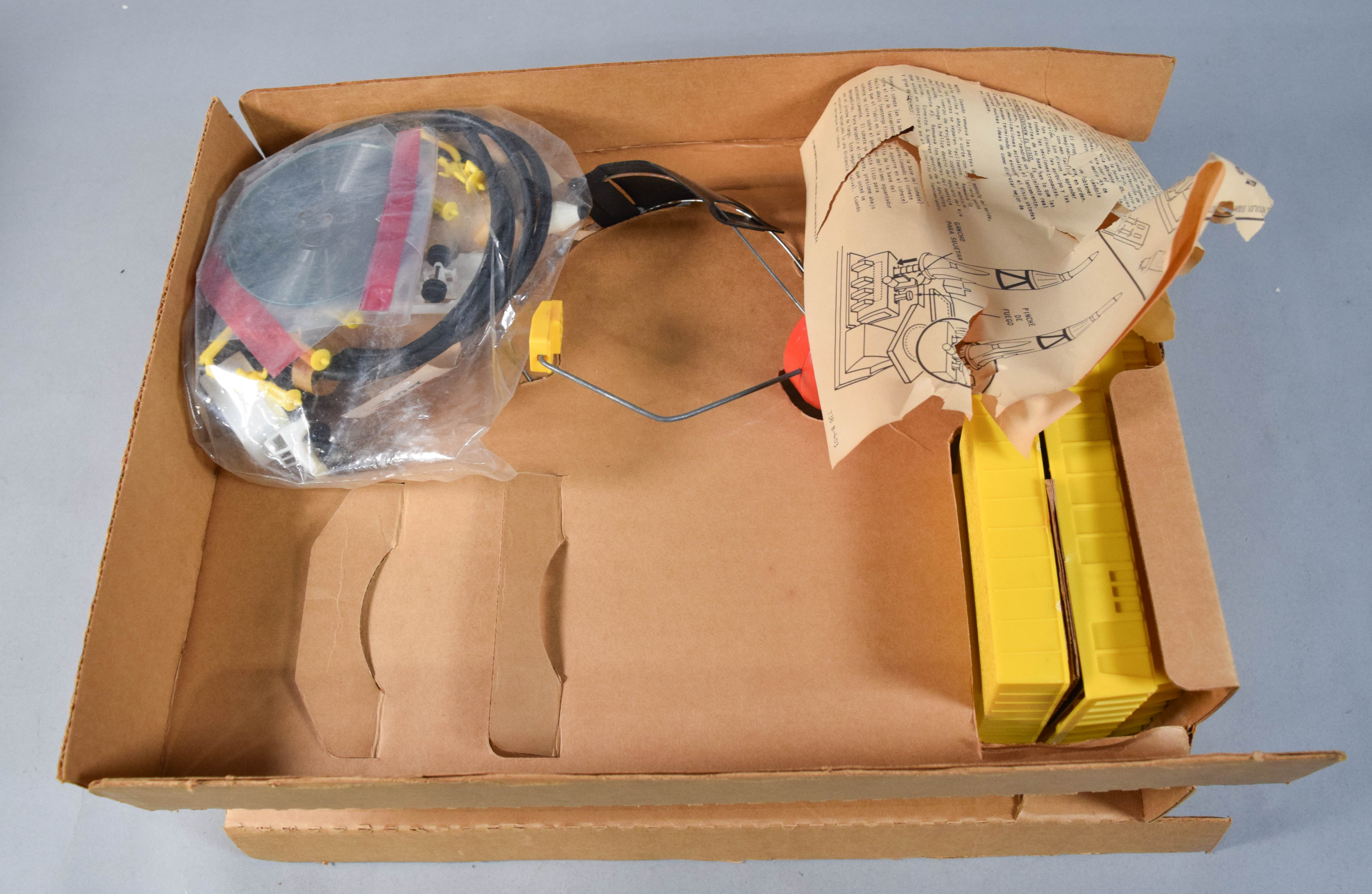 The set is housed in its original color-illustrated cardboard box, which exhibits age-related wear including creasing, edge scuffing, and surface marks. The interior contents appear partially assembled. A paper instruction sheet printed in Spanish is included but is heavily damaged and torn. Some small plastic accessories remain in a plastic bag. The mechanical working order and the absolute completeness of the set have not been determined. Requires one \"D\" battery for operation (not included).
