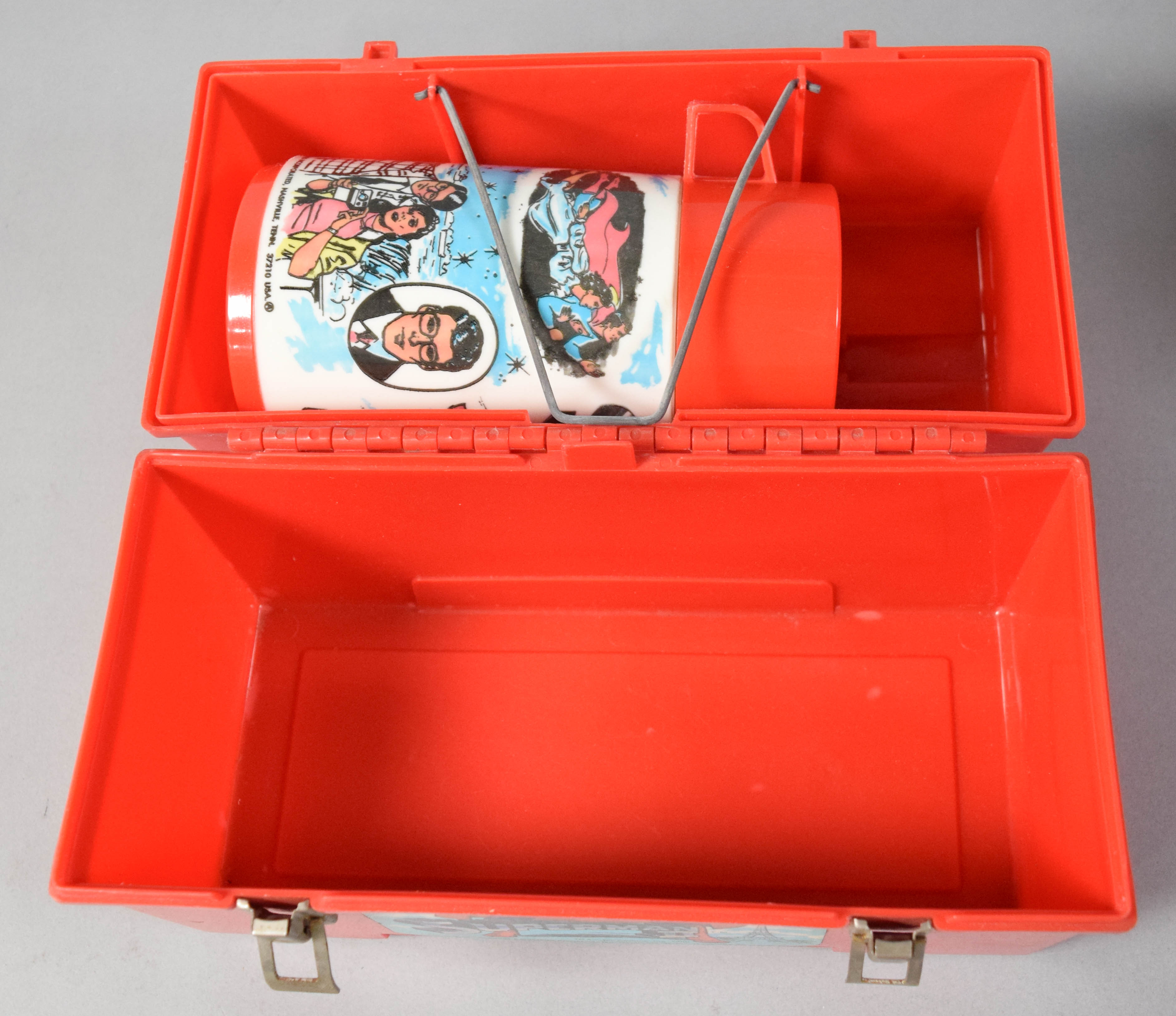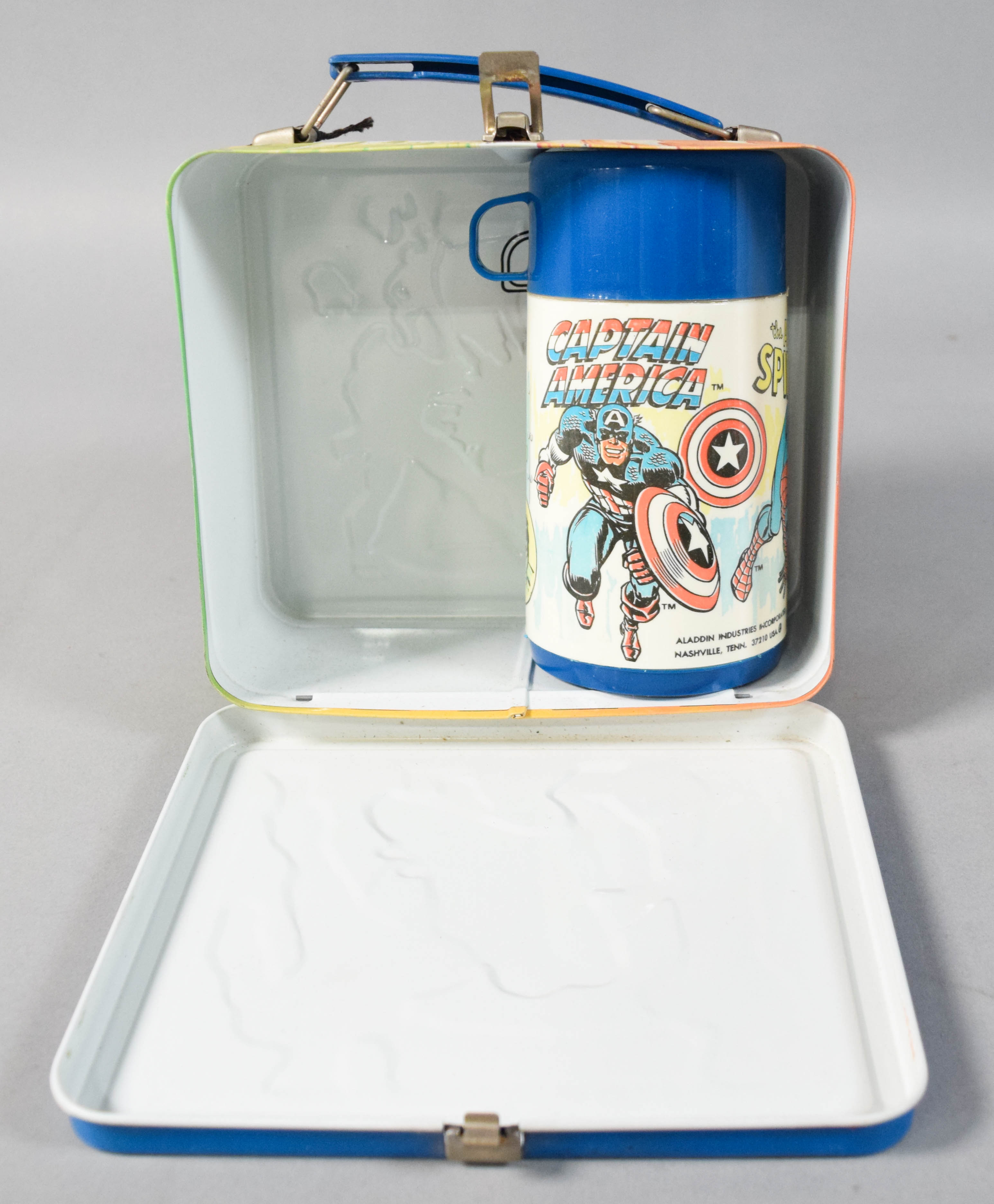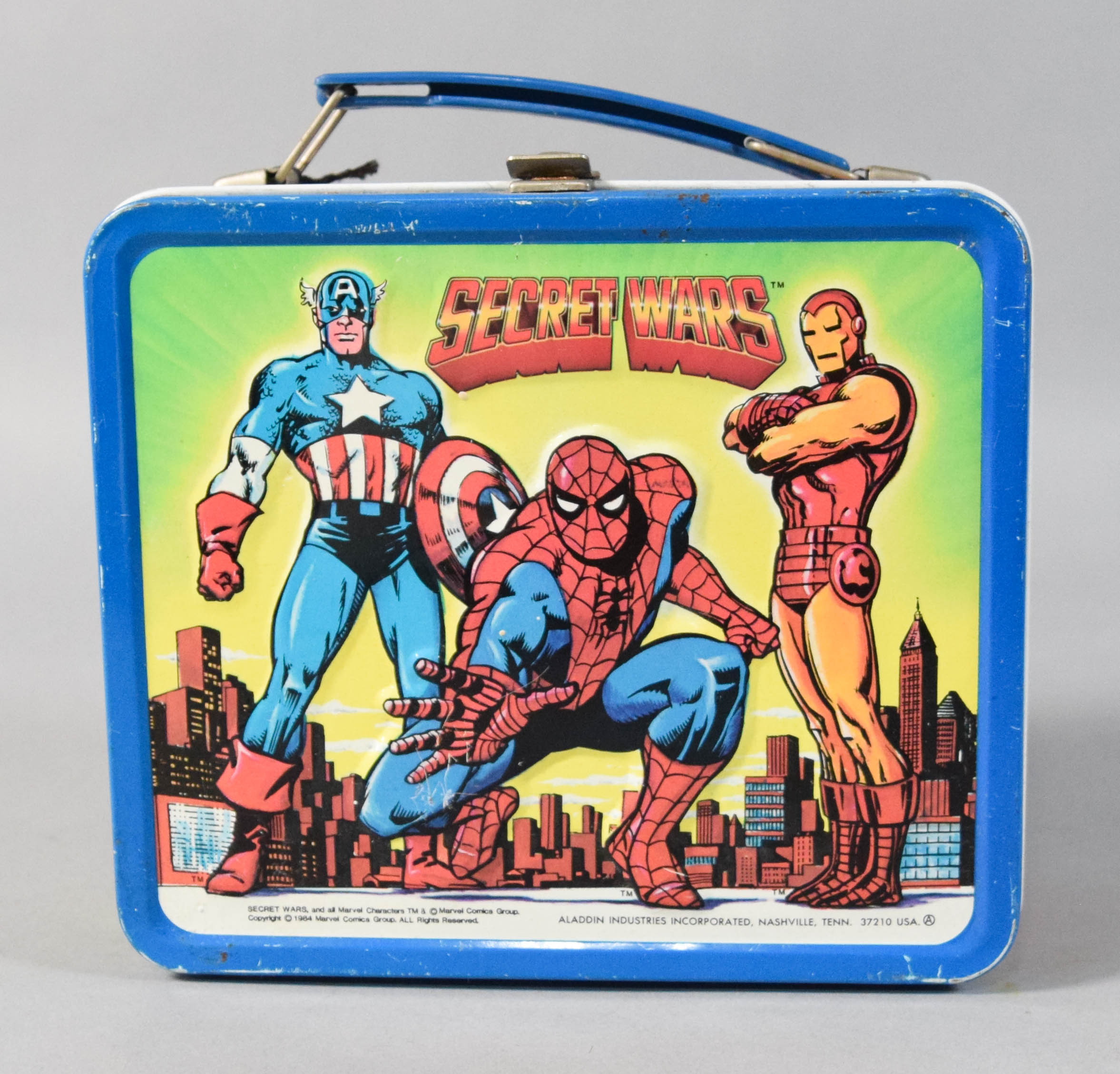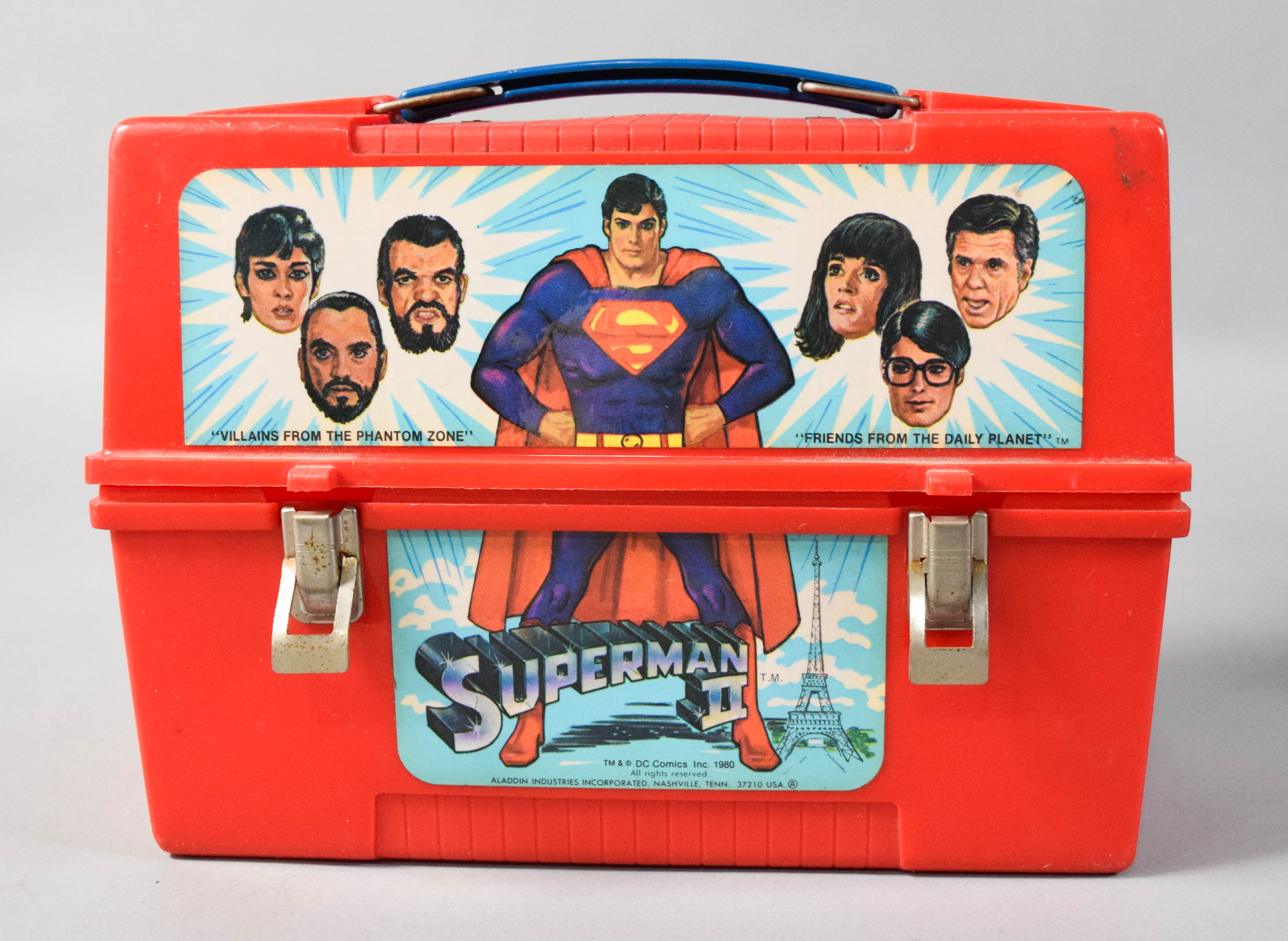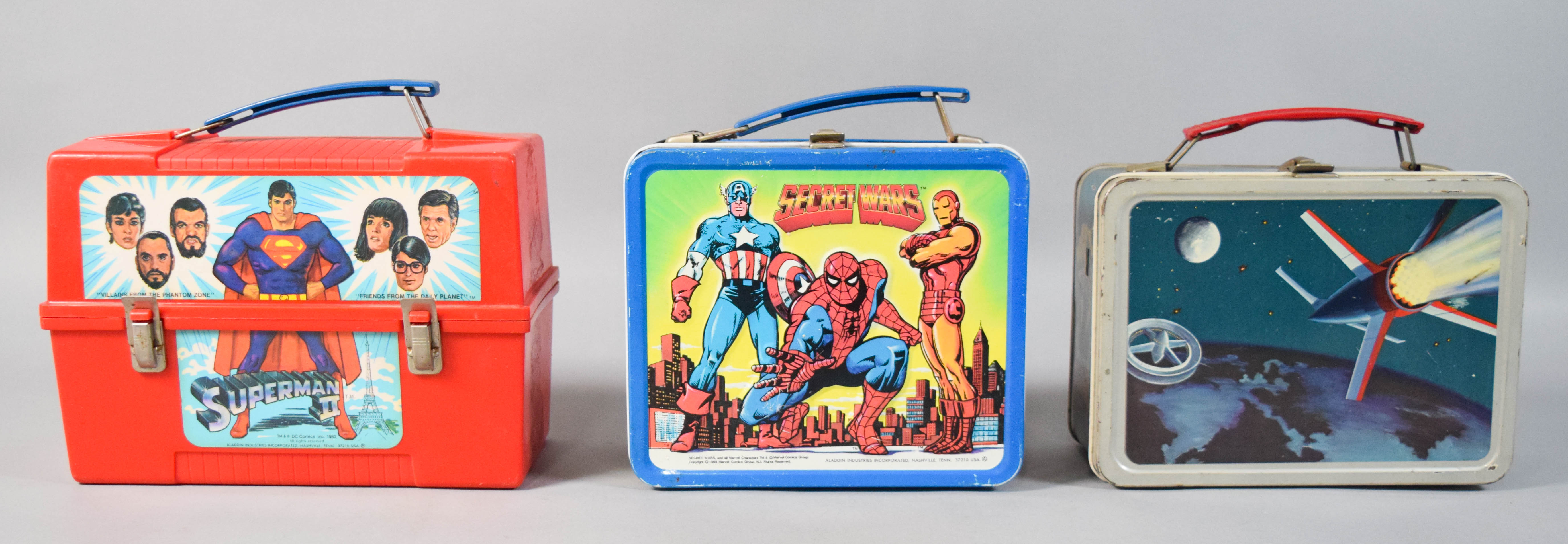 Three vintage character lunch boxes with matching internal thermoses. Includes a red plastic Superman II box manufactured by Aladdin Industries in 1980; a blue-rimmed metal Marvel Super Heroes Secret Wars box manufactured by Aladdin in 1984; and a metal space-themed lunch box with illegible manufacturer marks. Largest box 6.5" H x 8.75" W.
