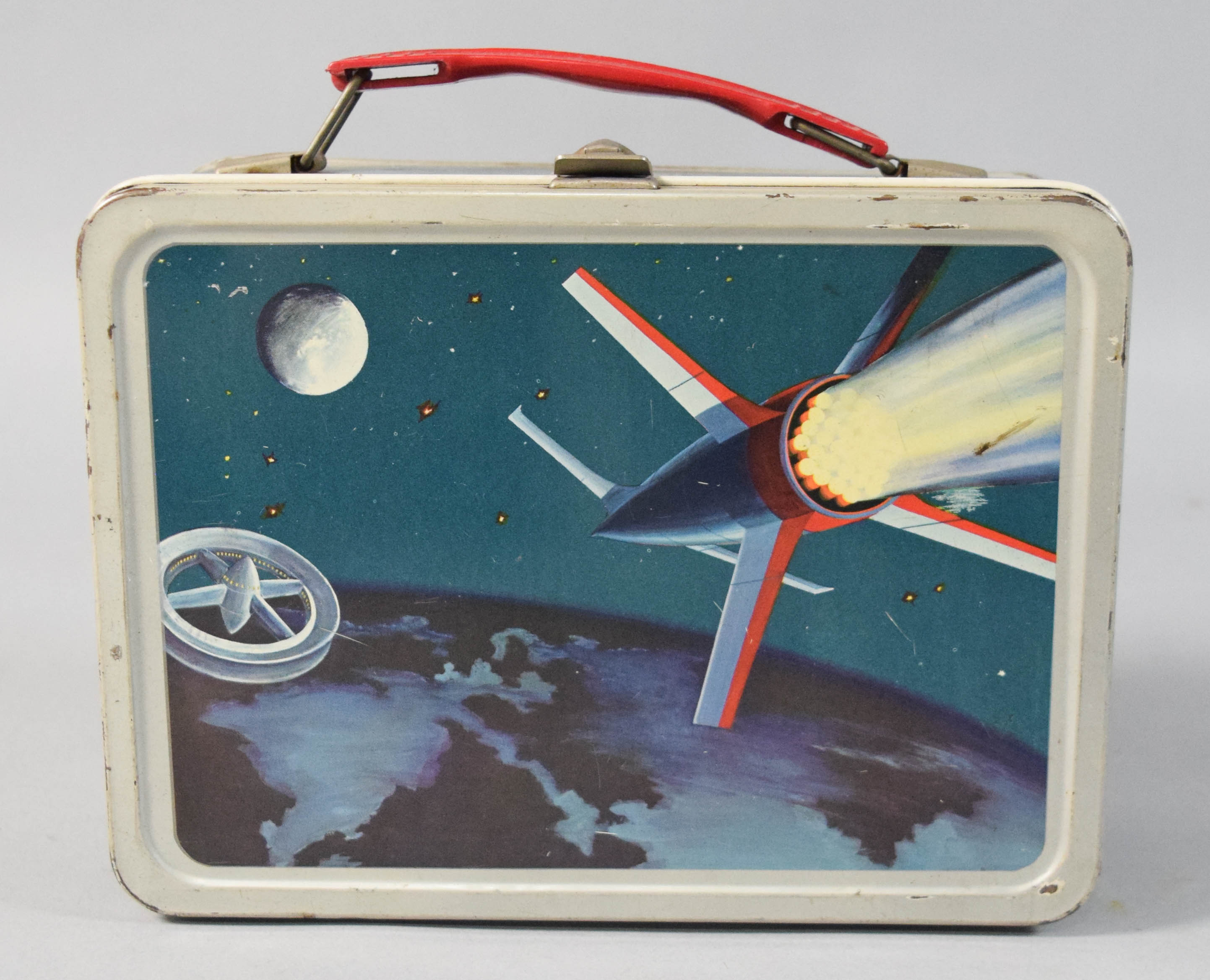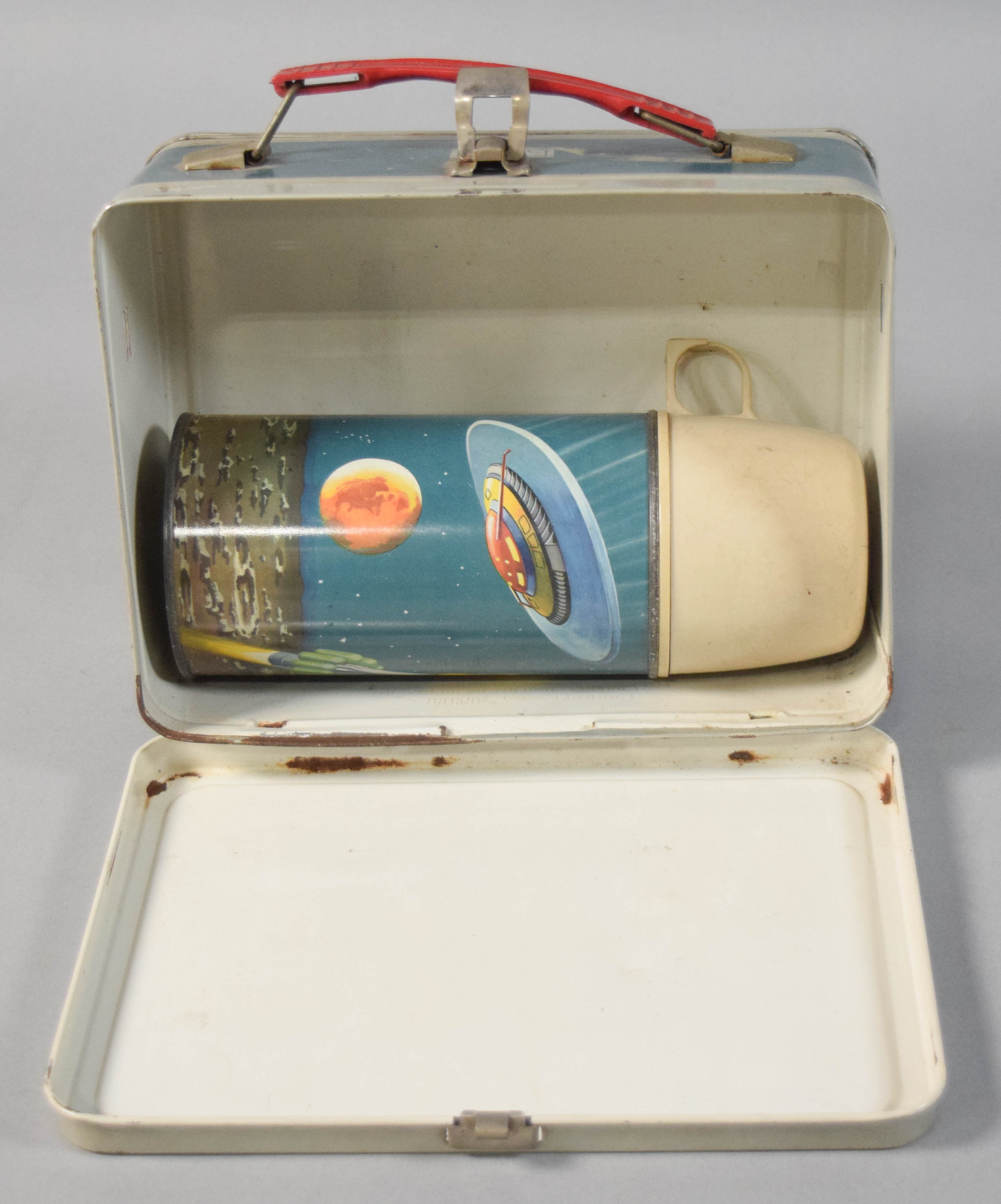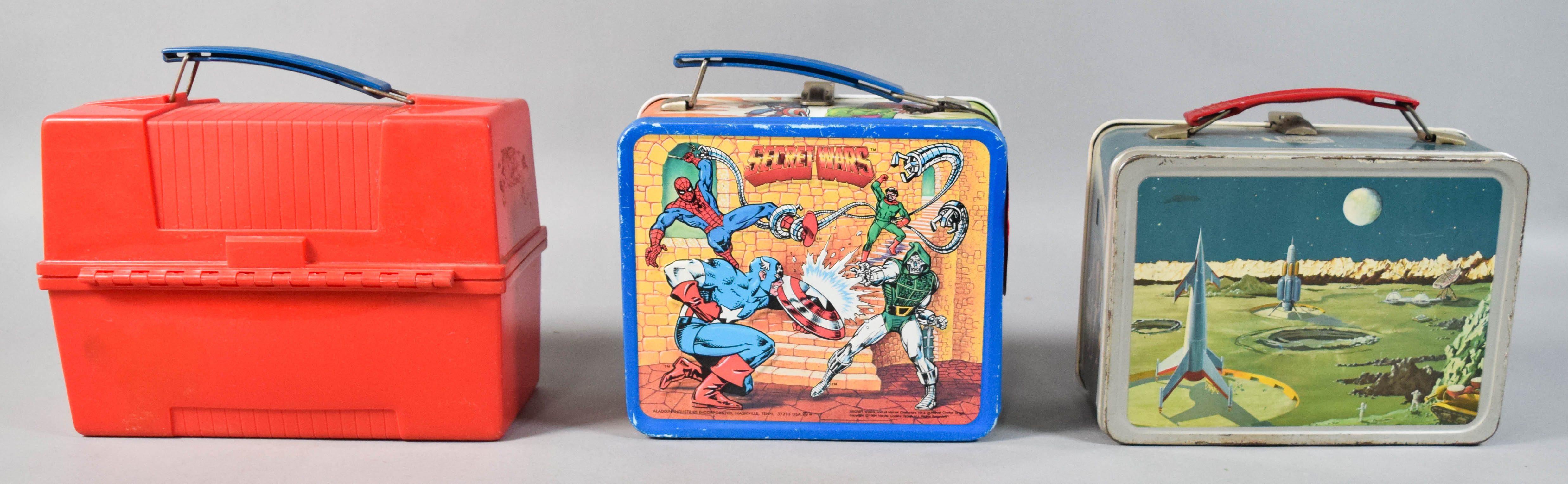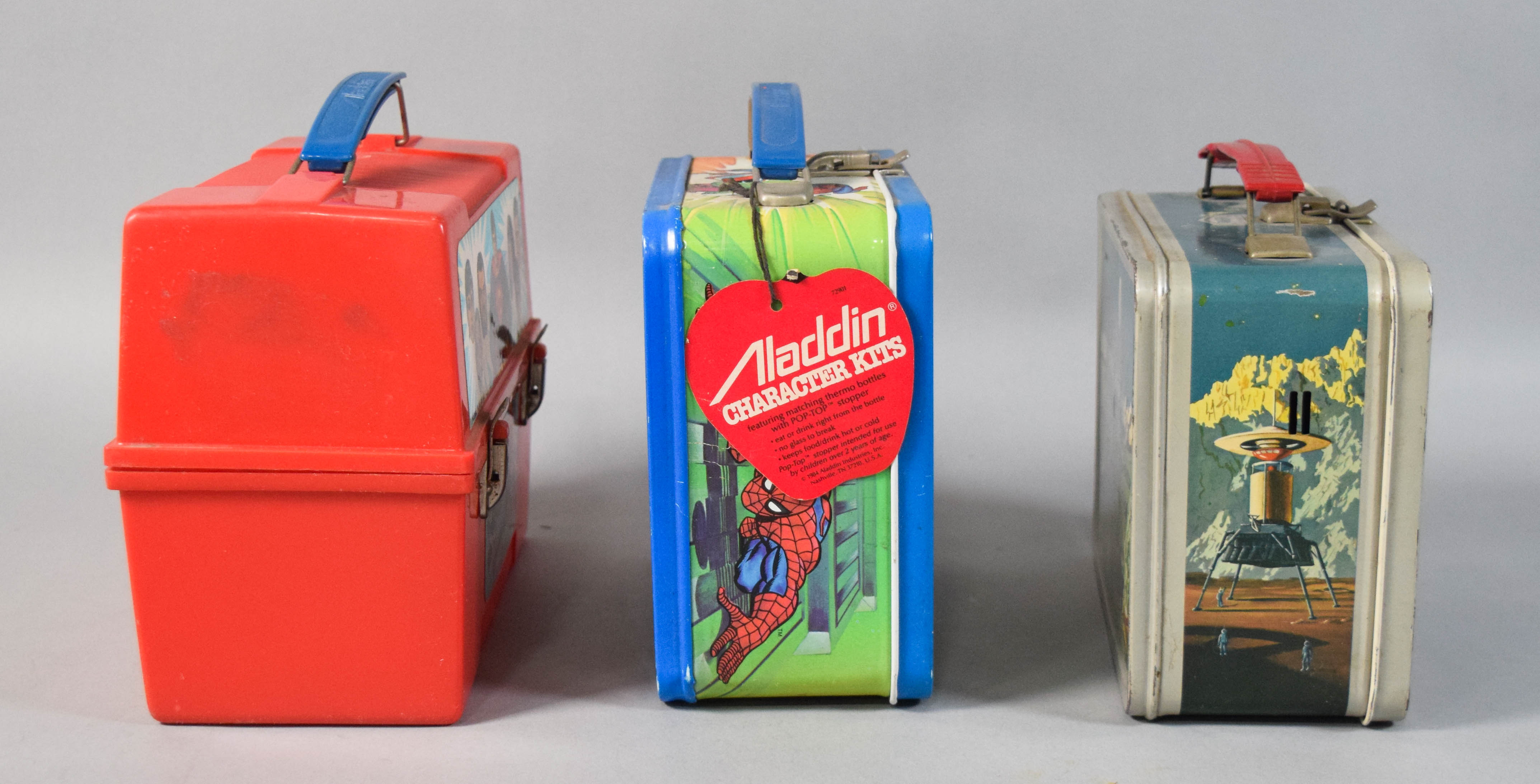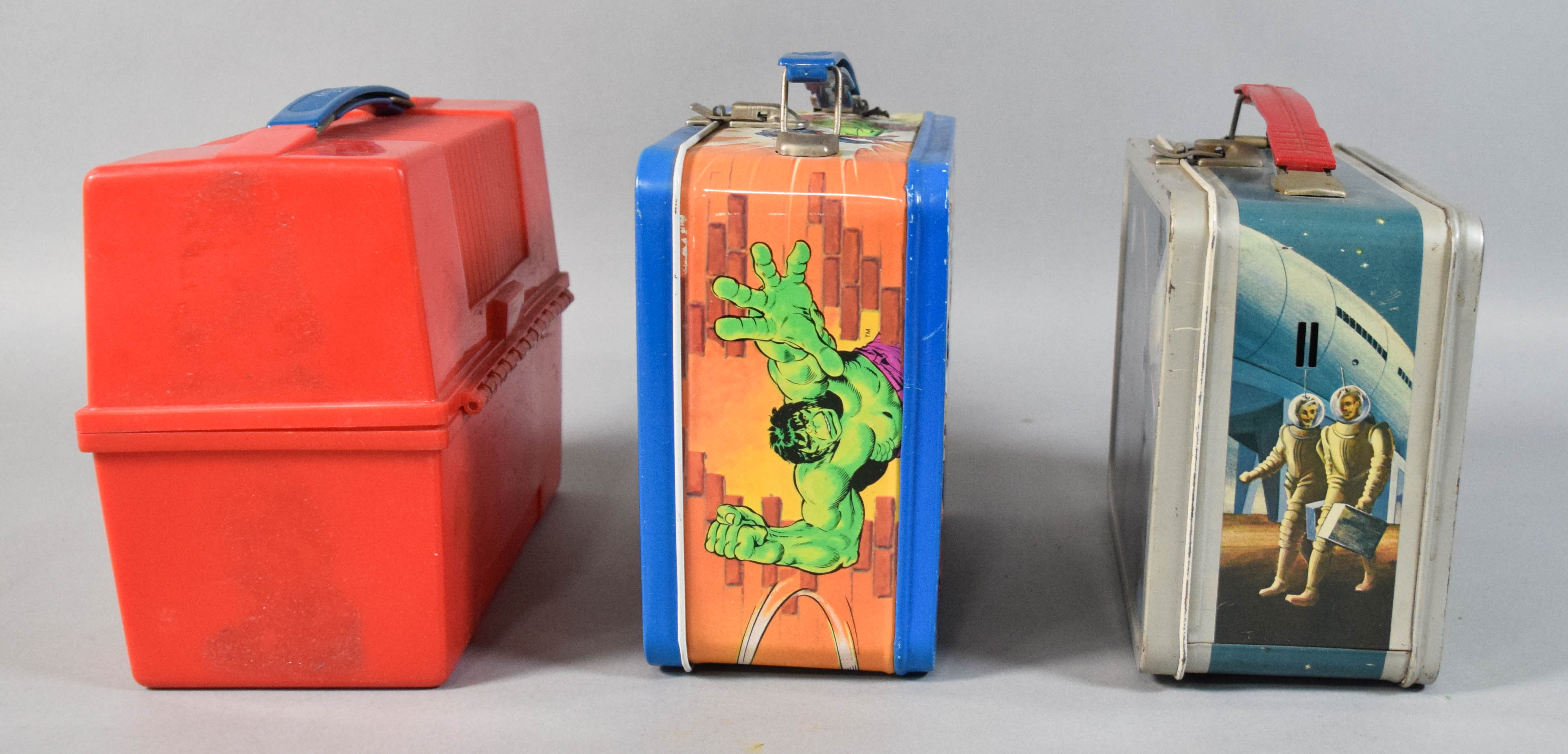 The items are in good to fair condition. The metal lunch boxes show signs of age including surface oxidation, minor dents, and paint loss concentrated along the edges and latches. The plastic box exhibits minor surface wear and grime.