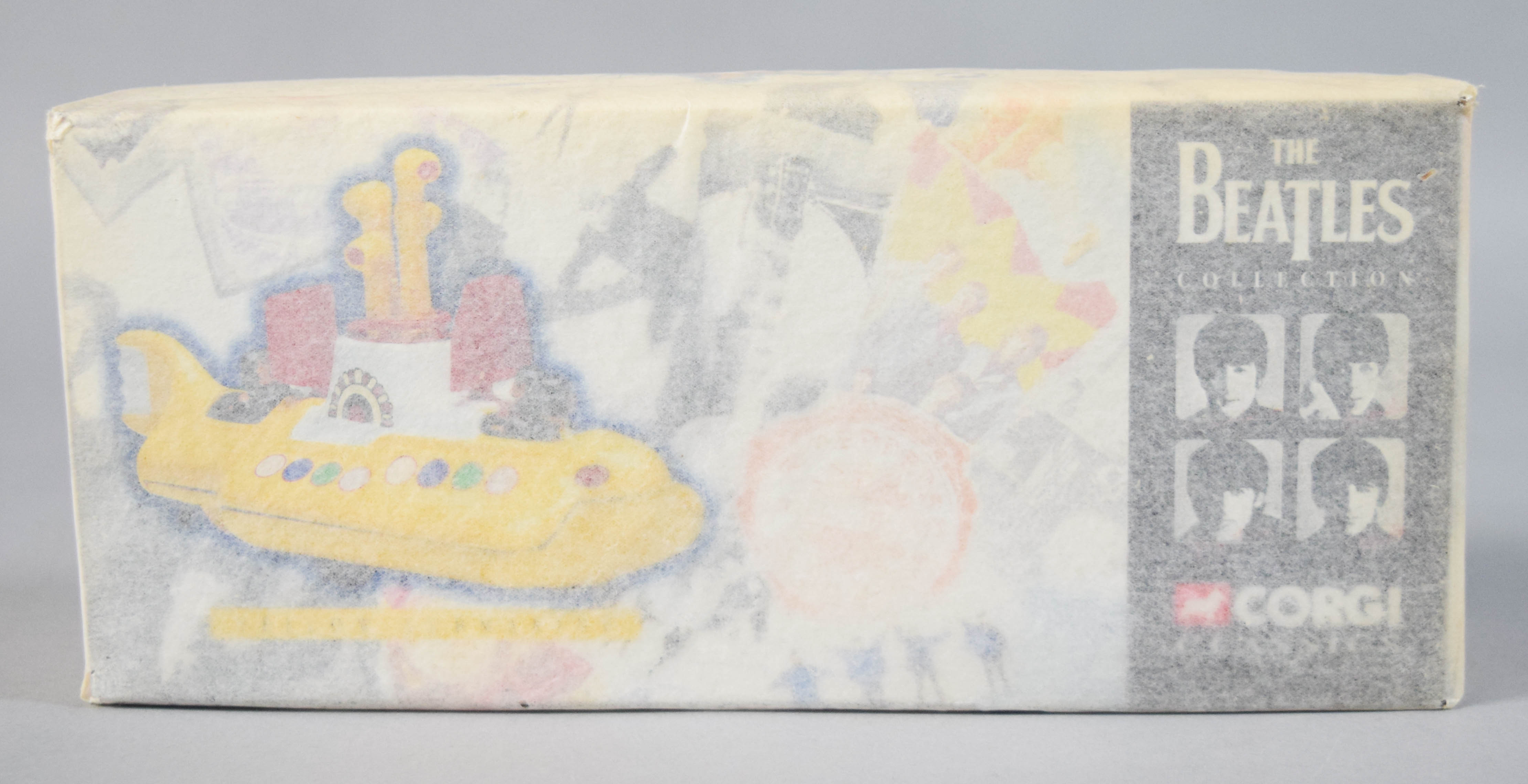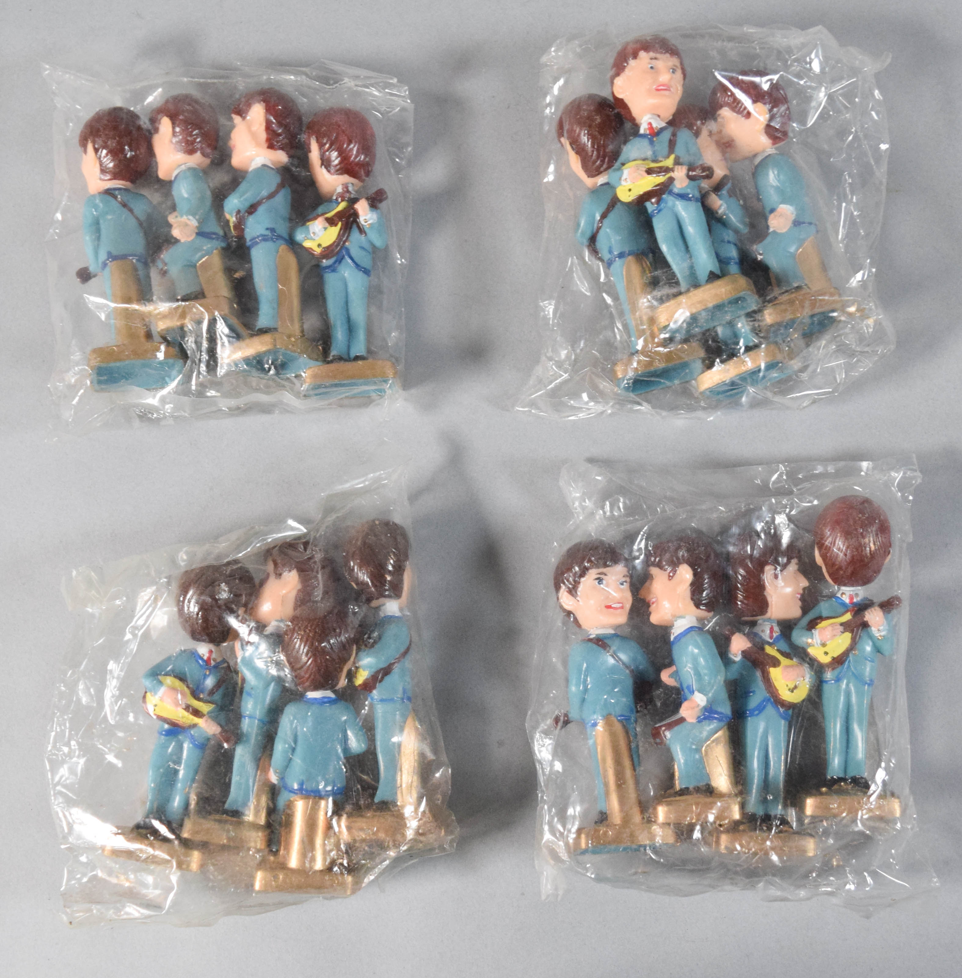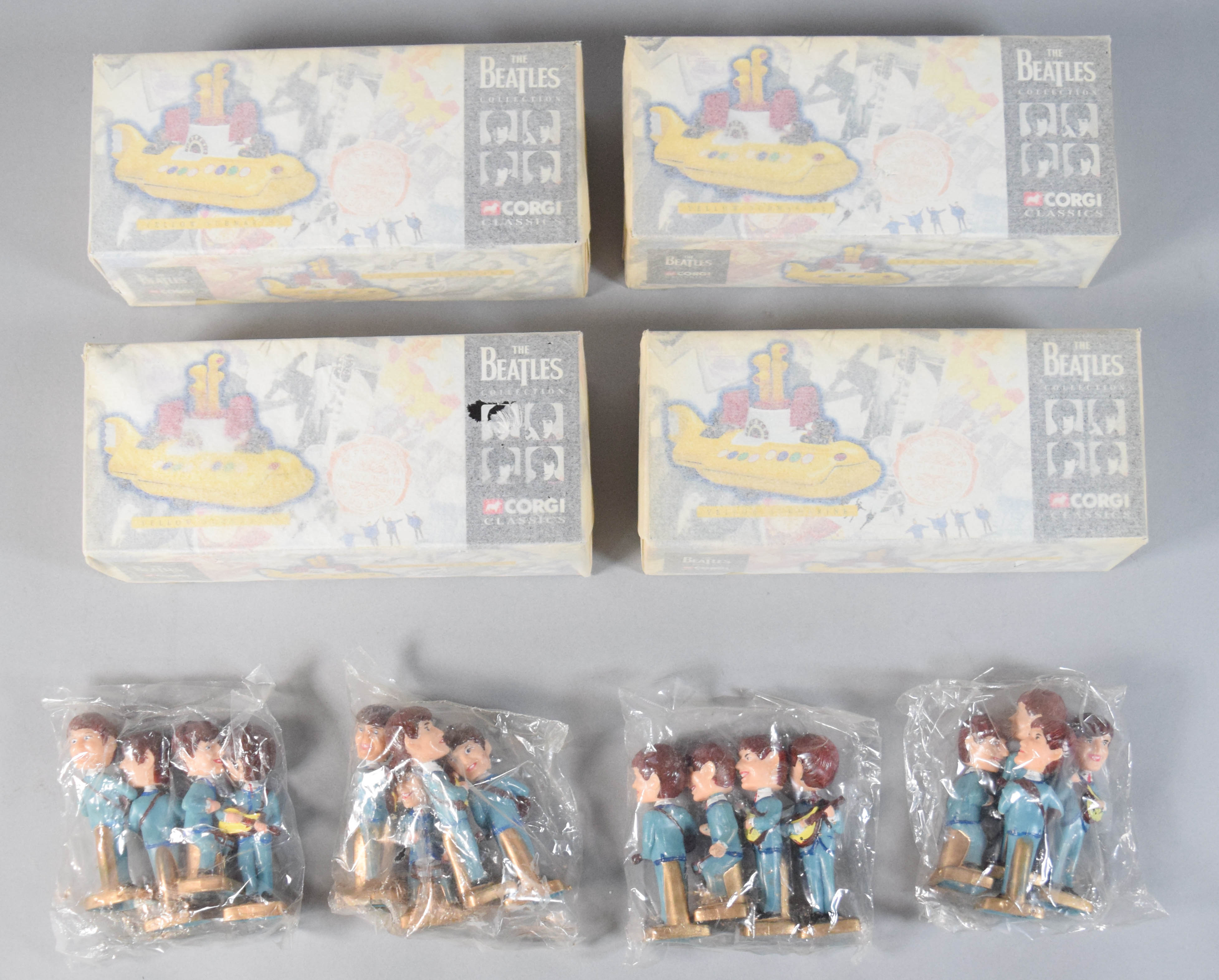 Group of eight Beatles-themed collectibles produced by Corgi Classics as part of The Beatles Collection. The assortment includes four boxed items and four sets of plastic figurines inspired by the Yellow Submarine animated film. The figurines depict the four band members in light blue uniforms with instruments, with each set of four figures sealed in a clear plastic bag. Each box 4″ H x 9″ W x 3″ D.