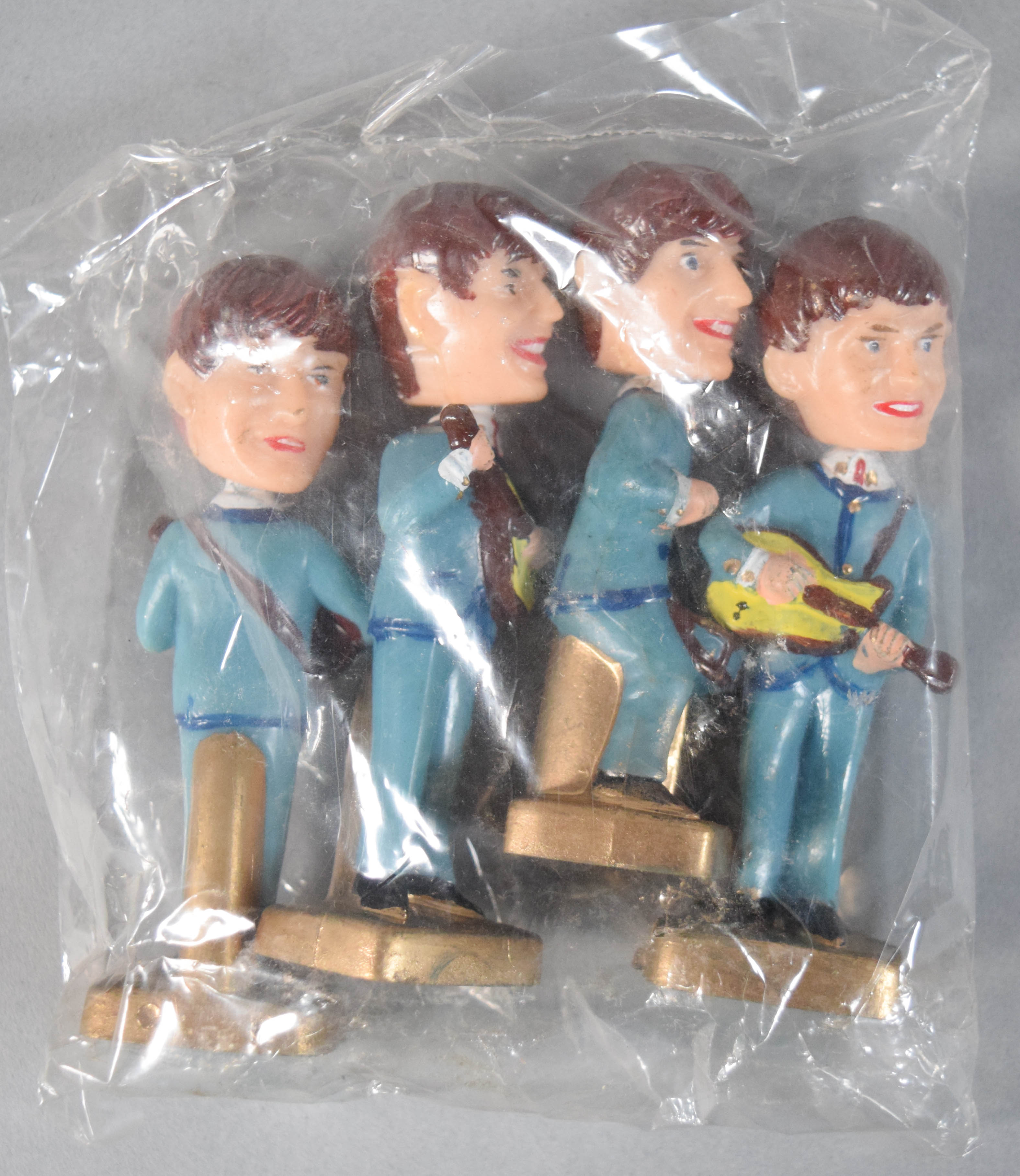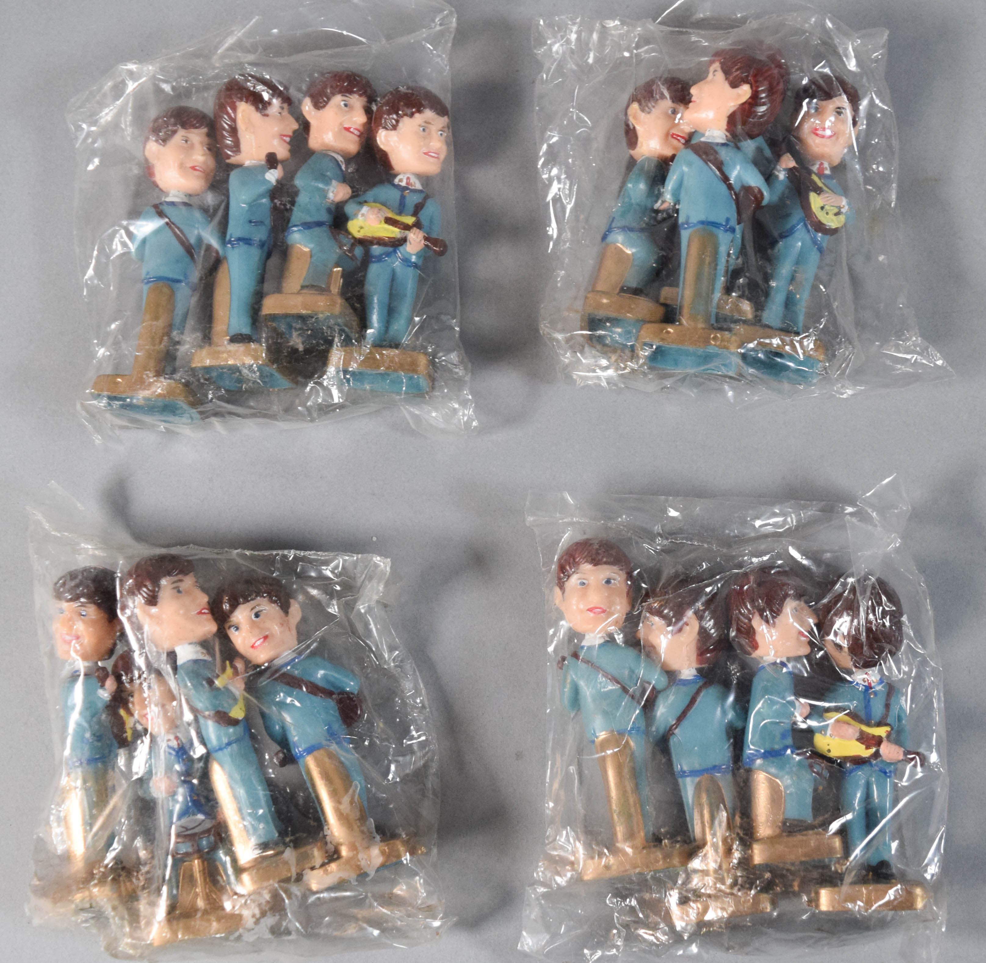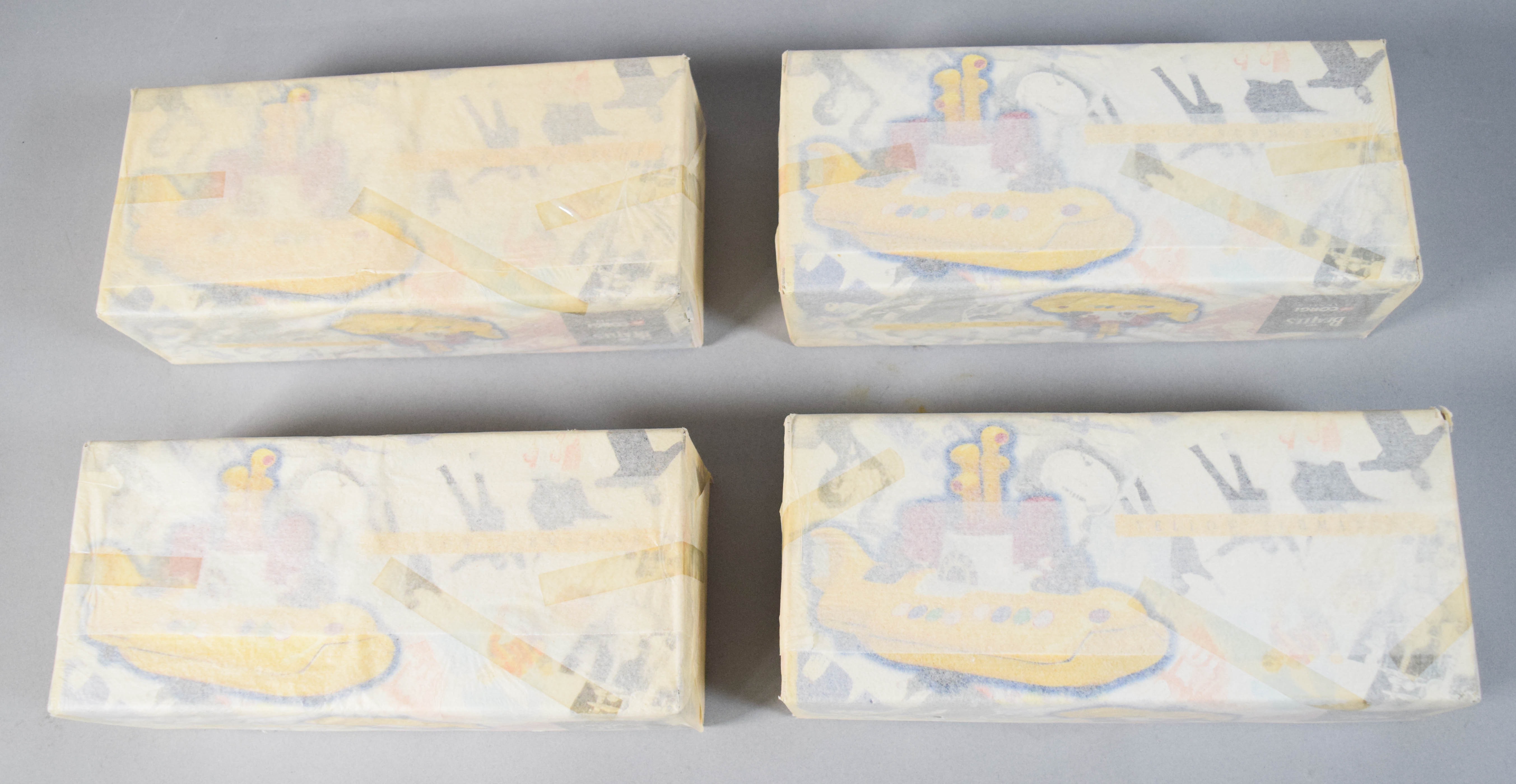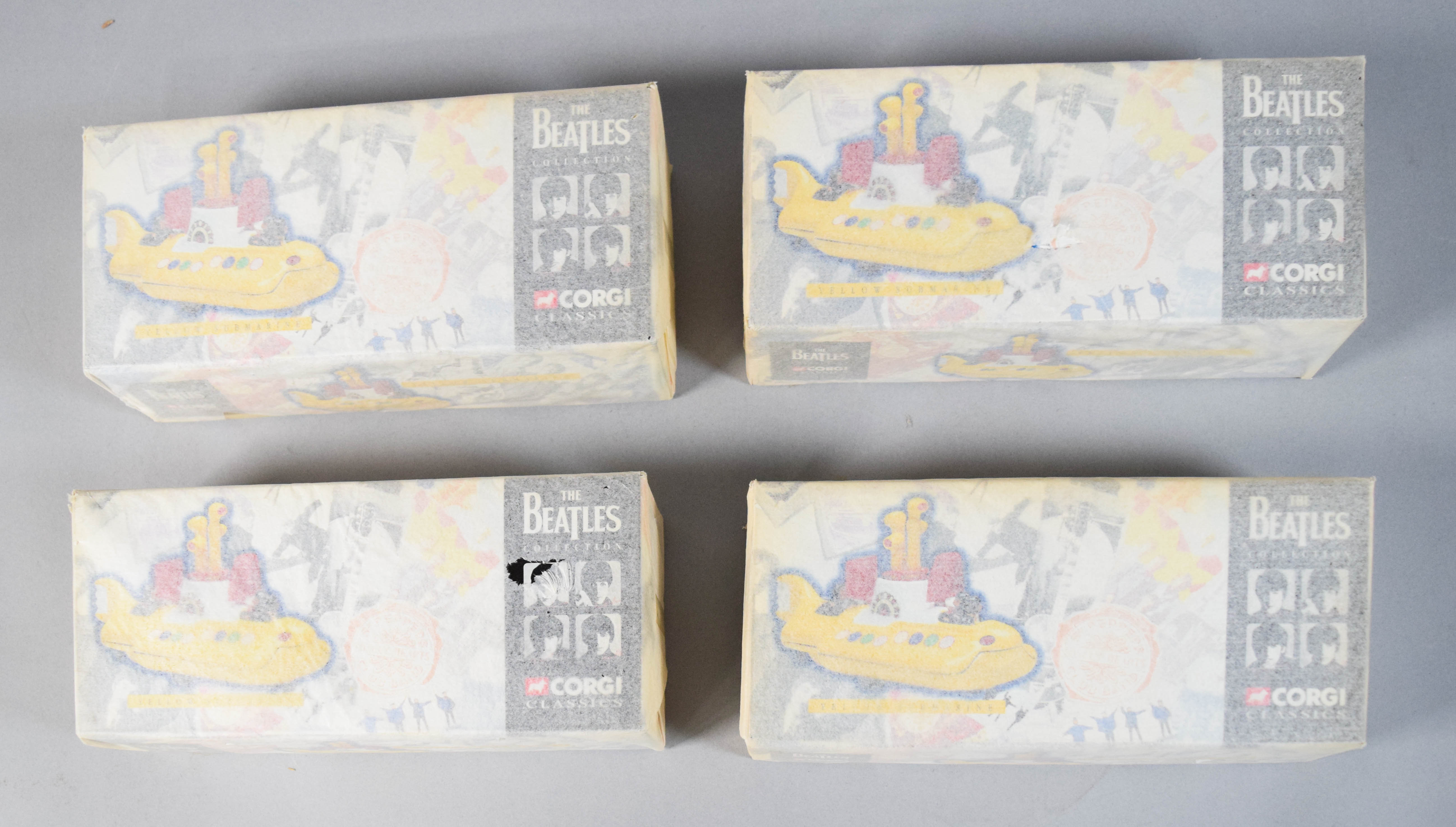 Group of eight Beatles-themed collectibles produced by Corgi Classics as part of The Beatles Collection. The assortment includes four boxed items and four sets of plastic figurines inspired by the Yellow Submarine animated film. The figurines depict the four band members in light blue uniforms with instruments, with each set of four figures sealed in a clear plastic bag. Each box 4″ H x 9″ W x 3″ D.
