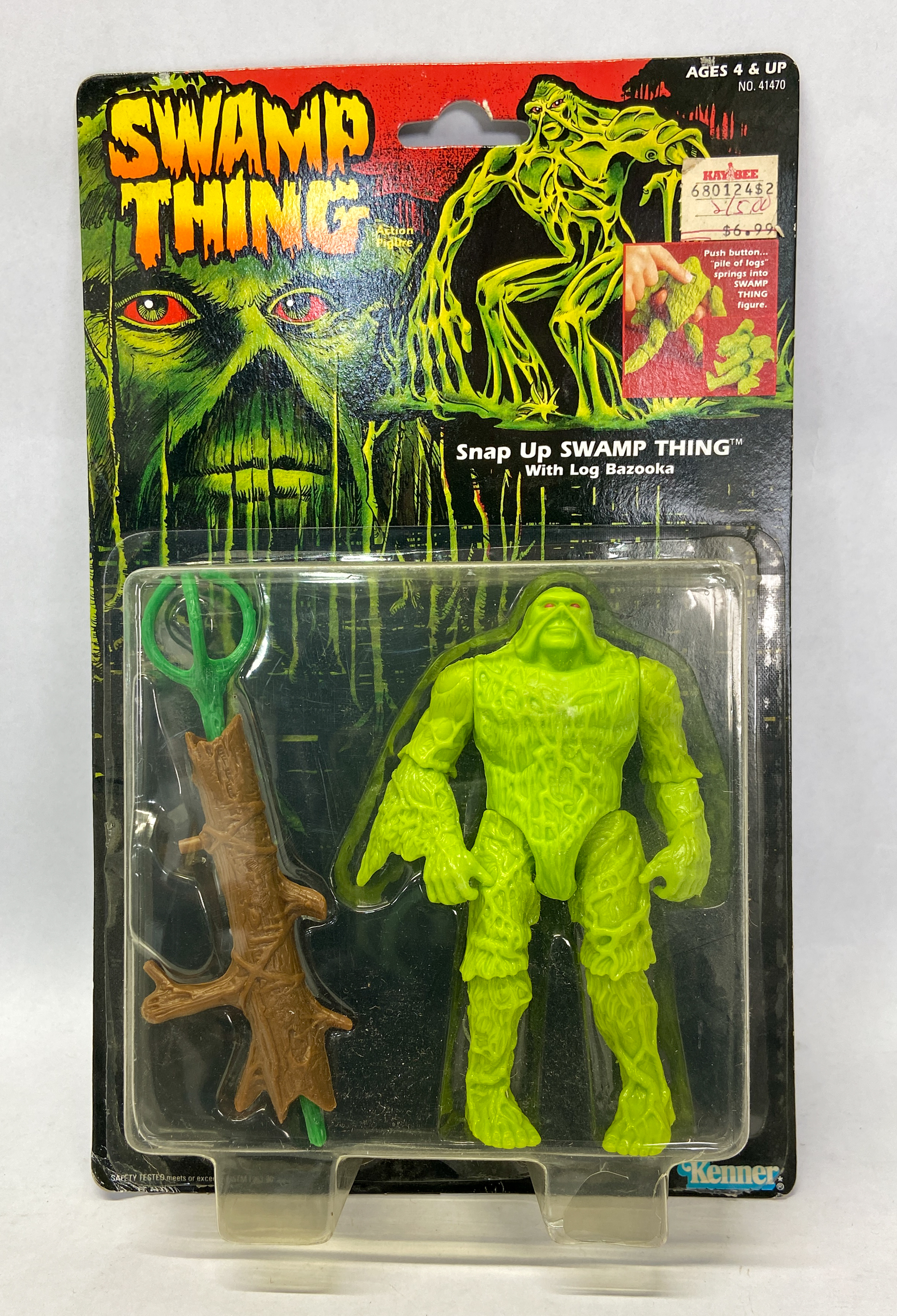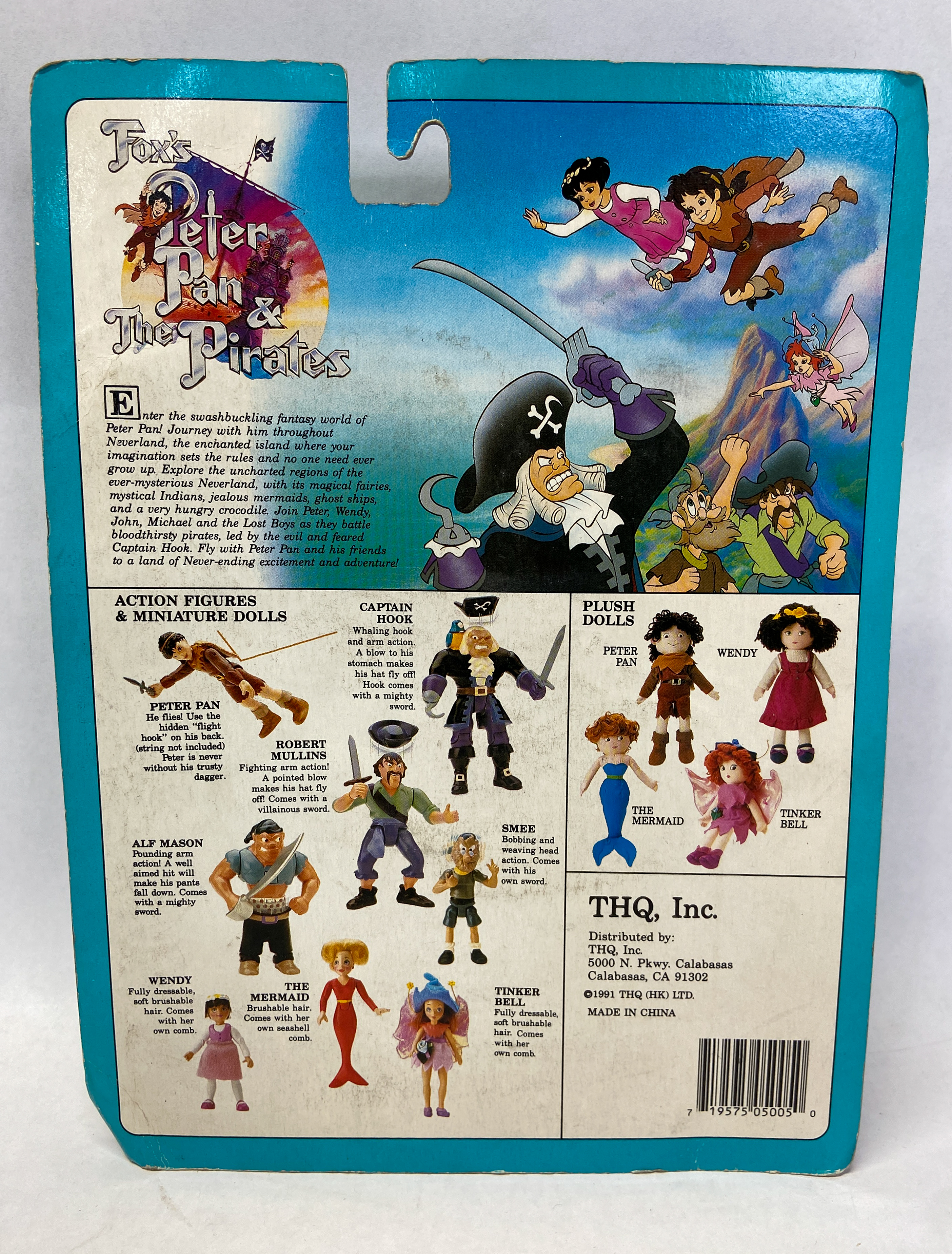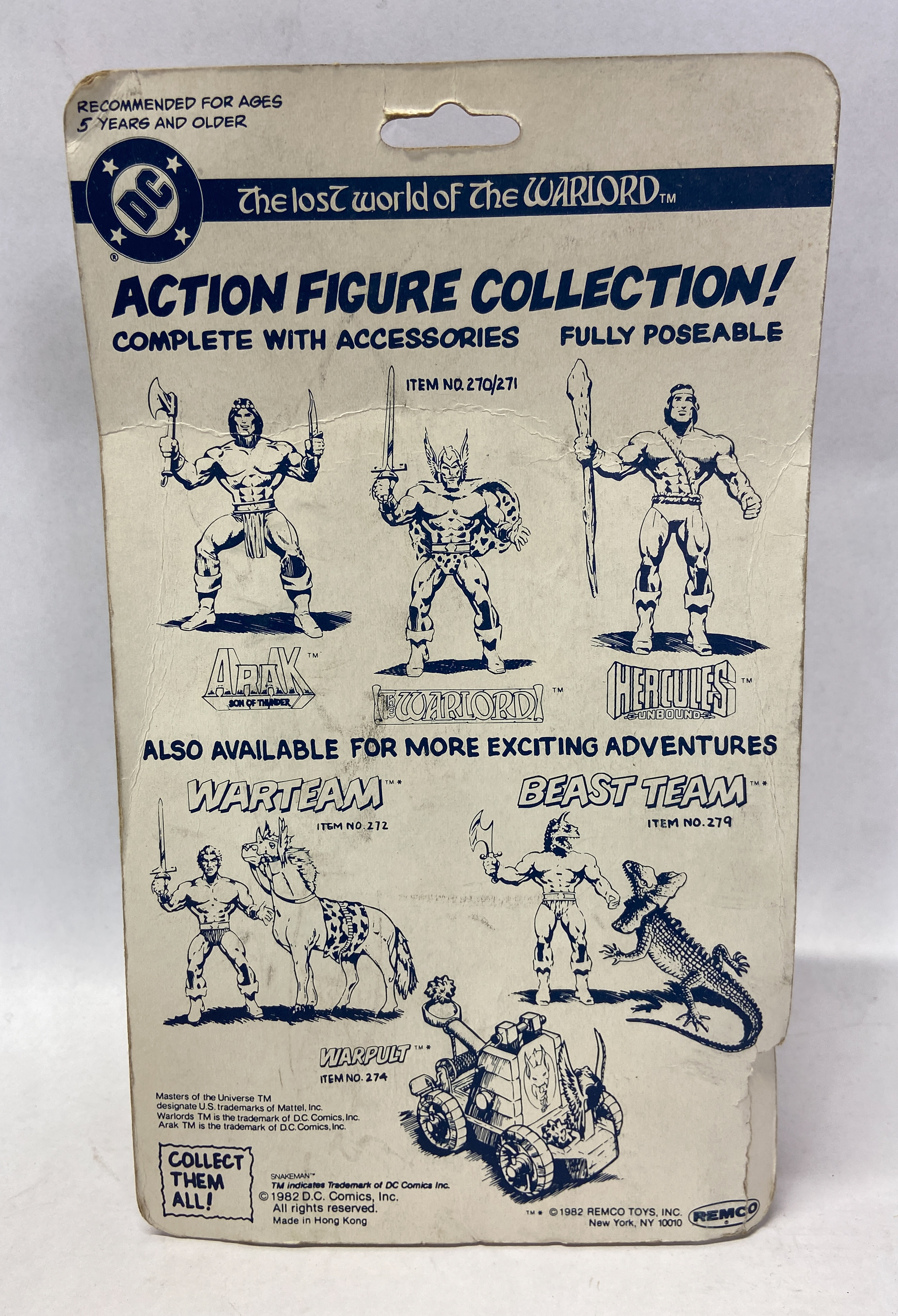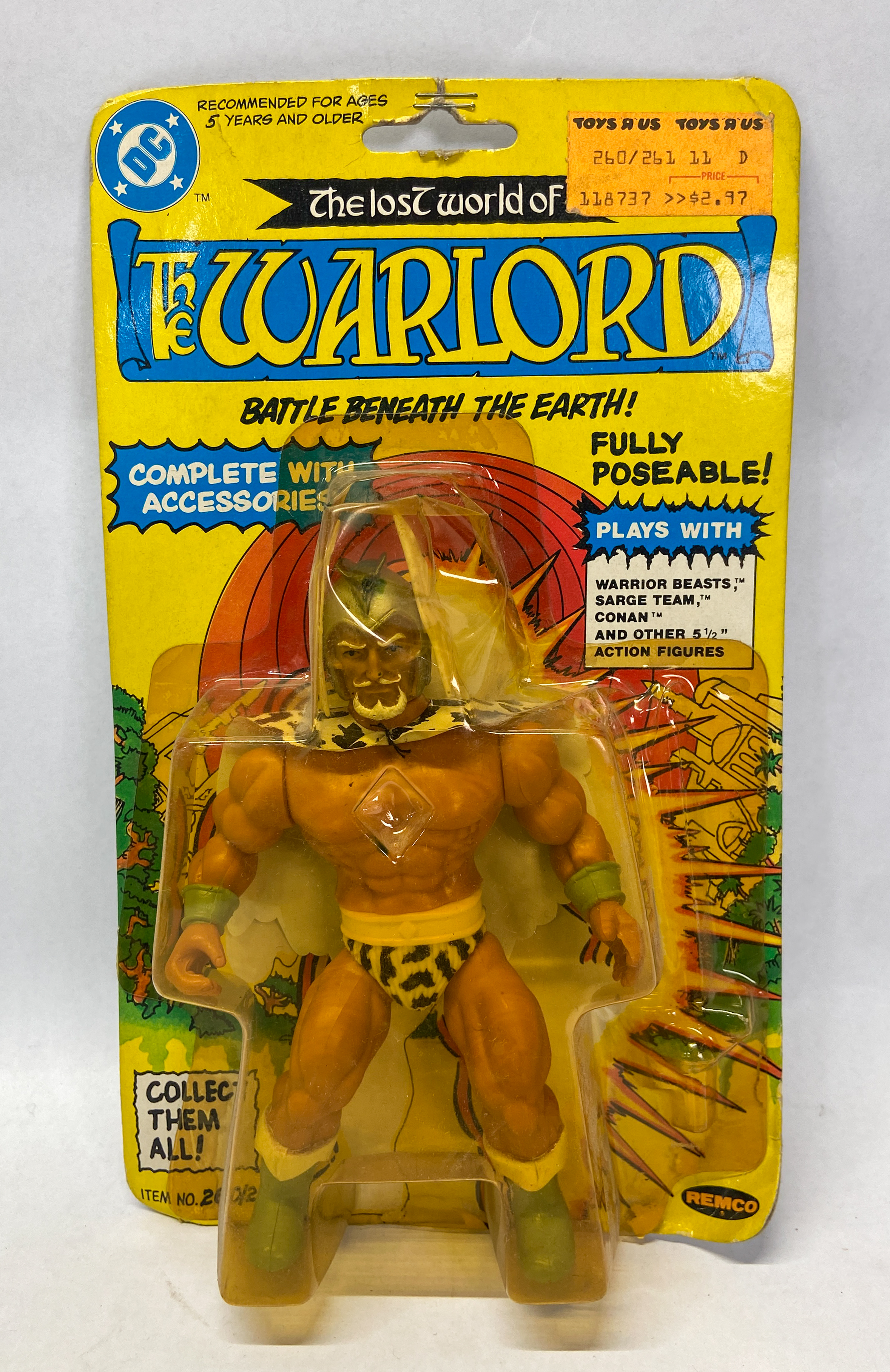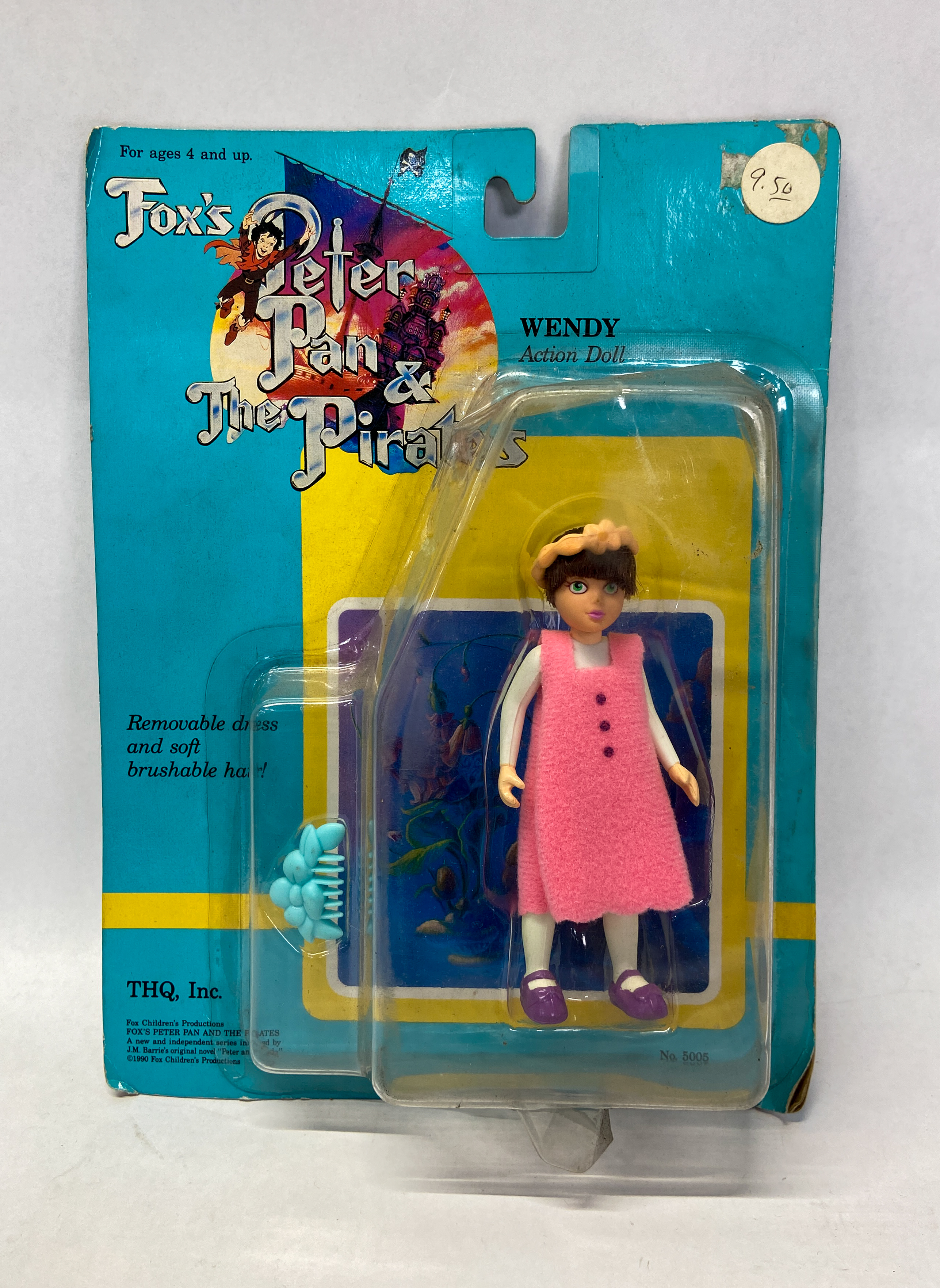 Collection of eight vintage action figures. Assortment includes a 1991 THQ Fox’s Peter Pan & The Pirates Wendy action doll; a 1991 Kenner Robin Hood Prince of Thieves Friar Tuck with Battle Staff; a 1982 Tristar International MASH Hawkeye 3 3/4-inch figure; a 1990 Remco U.S. Forces Safety Zone figure; a 1990 Hasbro The Pirates of Dark Water Bloth figure; a 1990 Kenner Swamp Thing Snap Up Swamp Thing with Log Bazooka; a 1982 Remco/DC Comics The Lost World of The Warlord figure; and a 1982 Remco The Warrior Beasts Guana figure. The MASH Hawkeye bubble is unsealed from the cardback. Largest item 10.5″ H x 8.5″ W x 2″ D.