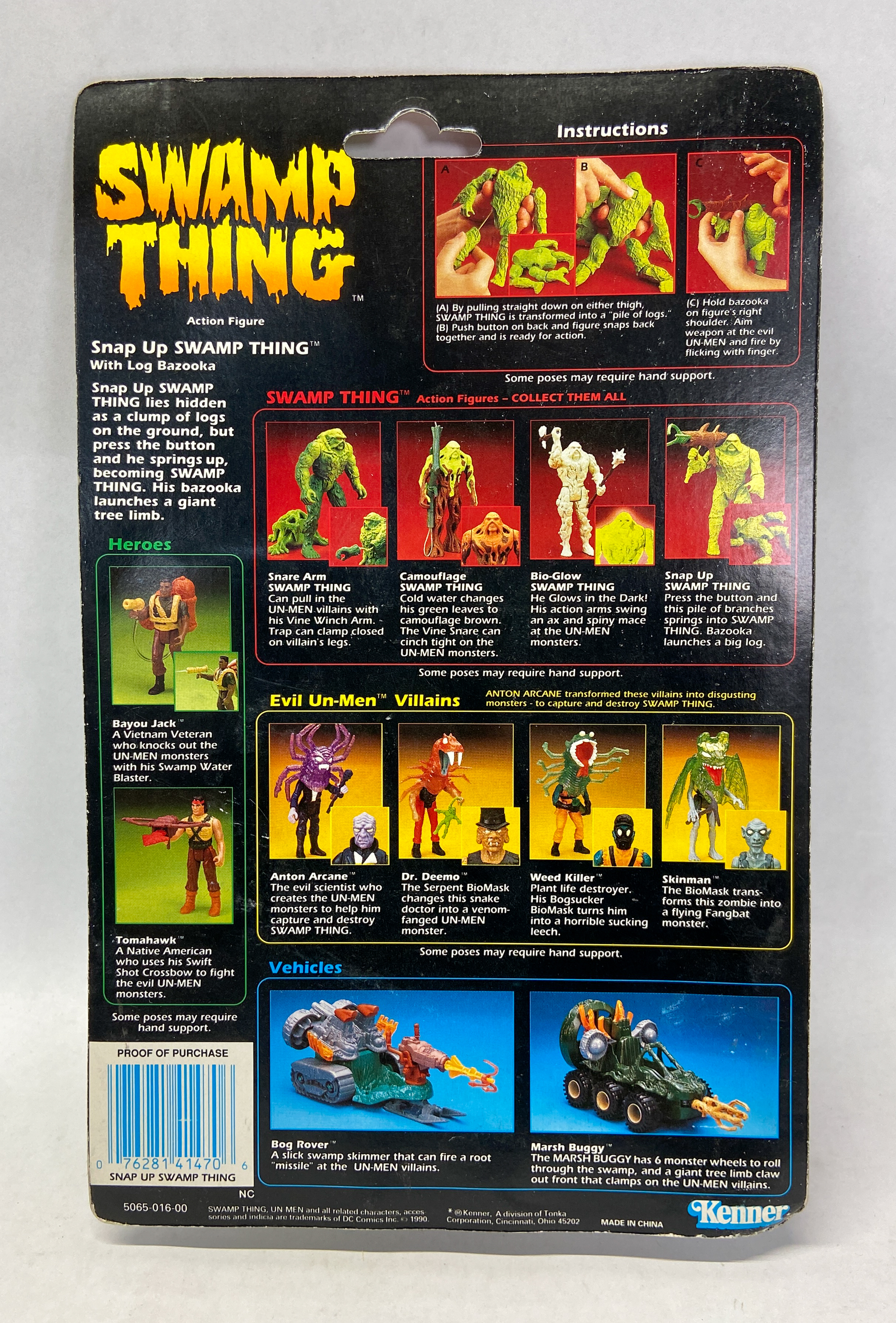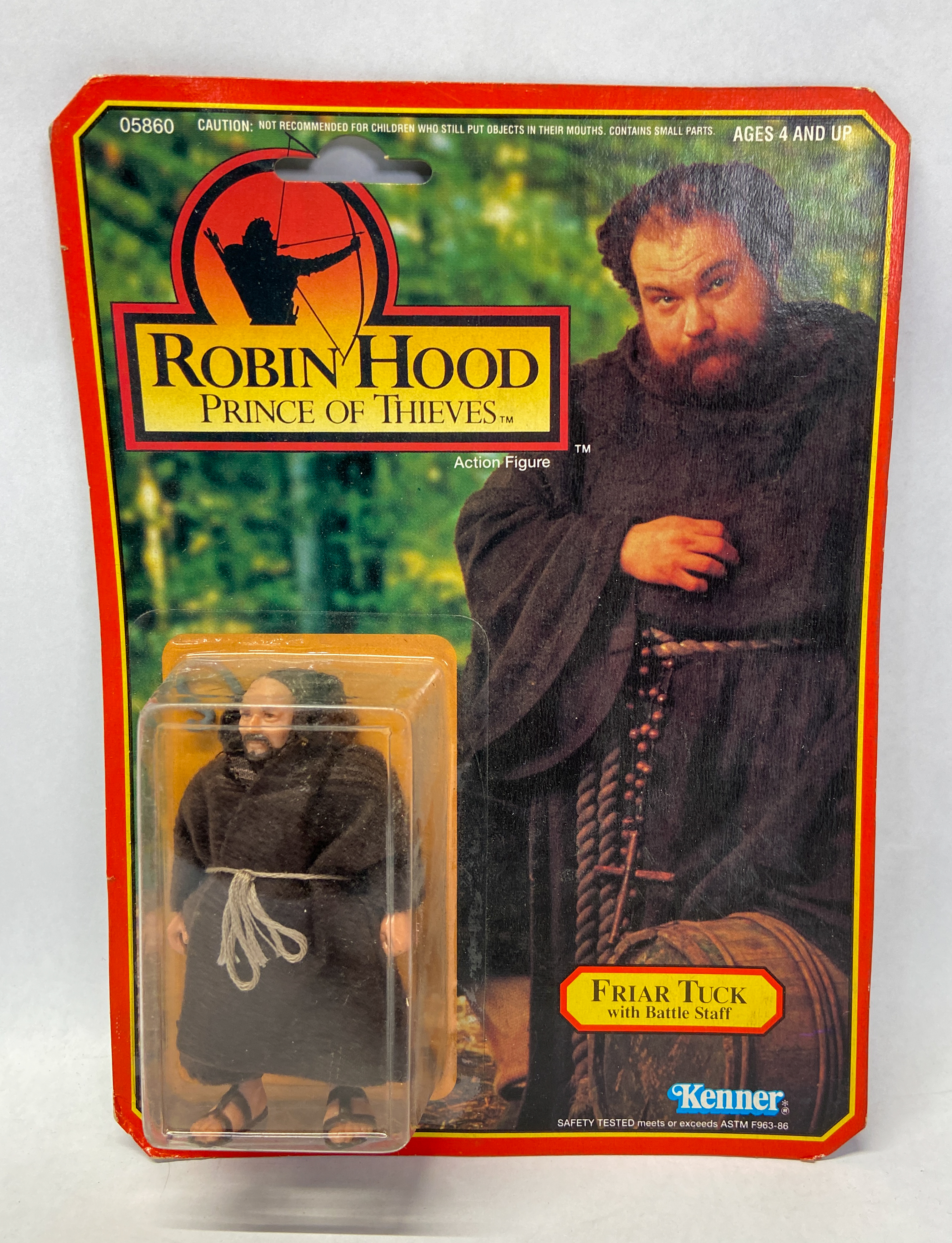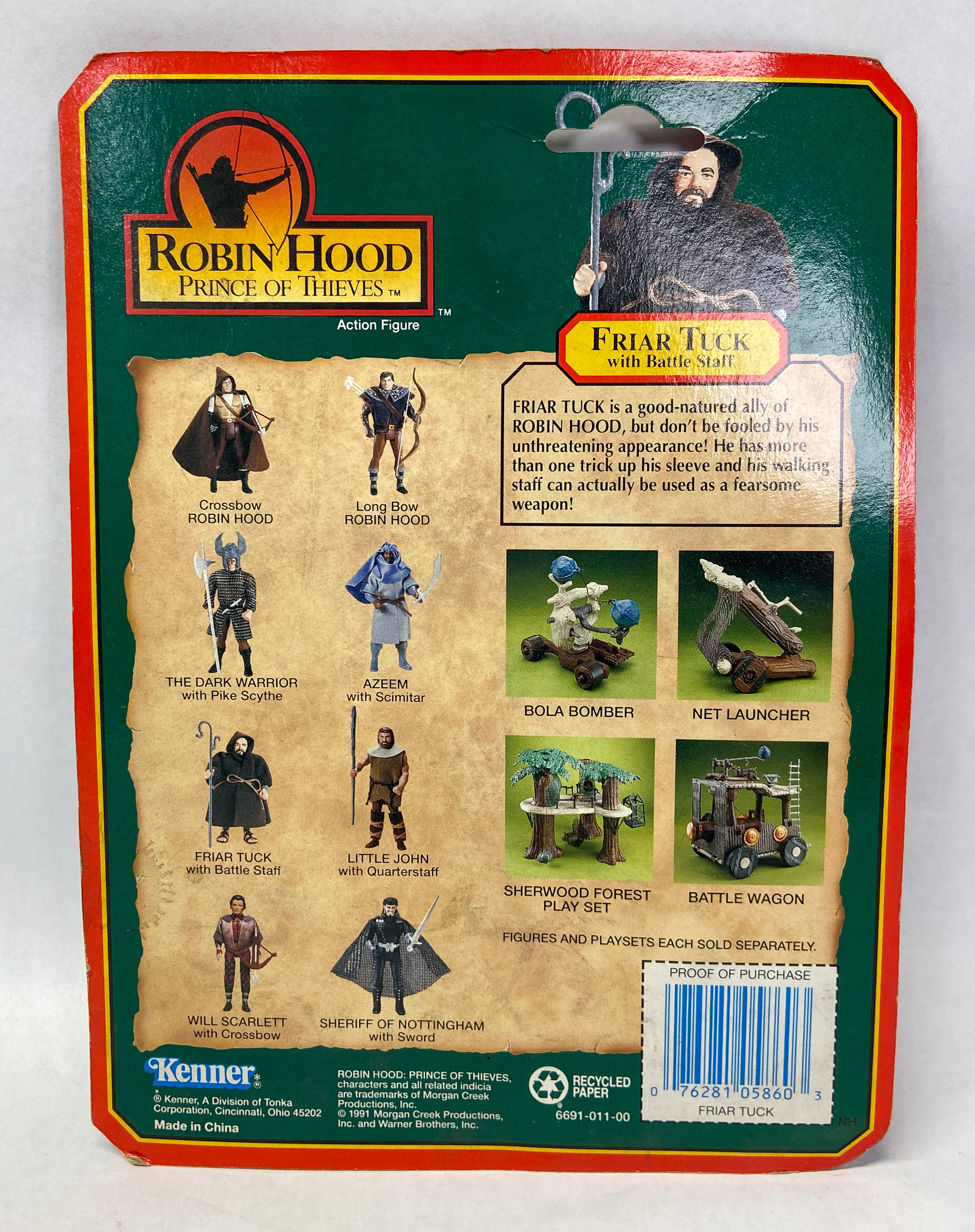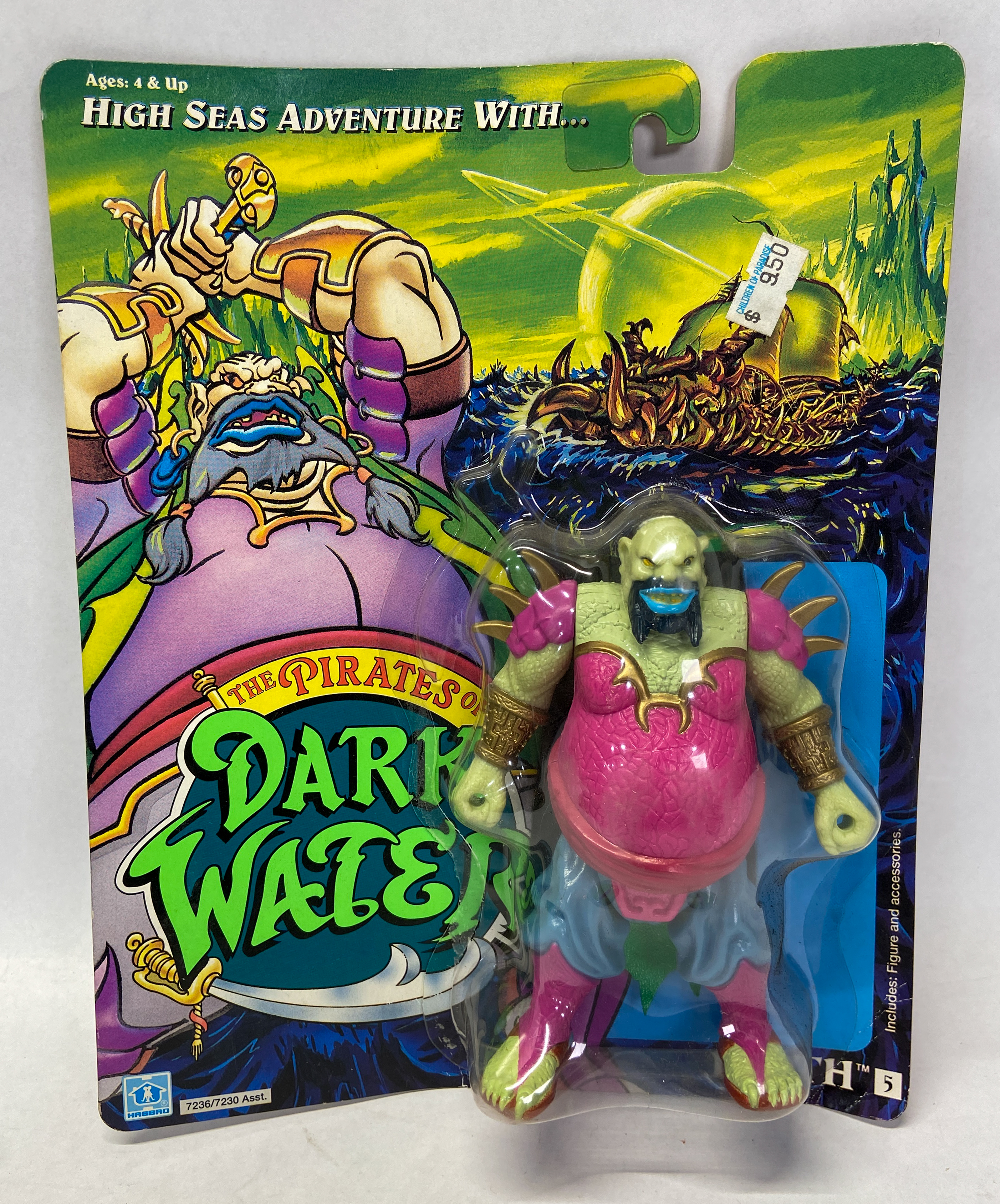 Collection of eight vintage action figures. Assortment includes a 1991 THQ Fox’s Peter Pan & The Pirates Wendy action doll; a 1991 Kenner Robin Hood Prince of Thieves Friar Tuck with Battle Staff; a 1982 Tristar International MASH Hawkeye 3 3/4-inch figure; a 1990 Remco U.S. Forces Safety Zone figure; a 1990 Hasbro The Pirates of Dark Water Bloth figure; a 1990 Kenner Swamp Thing Snap Up Swamp Thing with Log Bazooka; a 1982 Remco/DC Comics The Lost World of The Warlord figure; and a 1982 Remco The Warrior Beasts Guana figure. The MASH Hawkeye bubble is unsealed from the cardback. Largest item 10.5″ H x 8.5″ W x 2″ D.