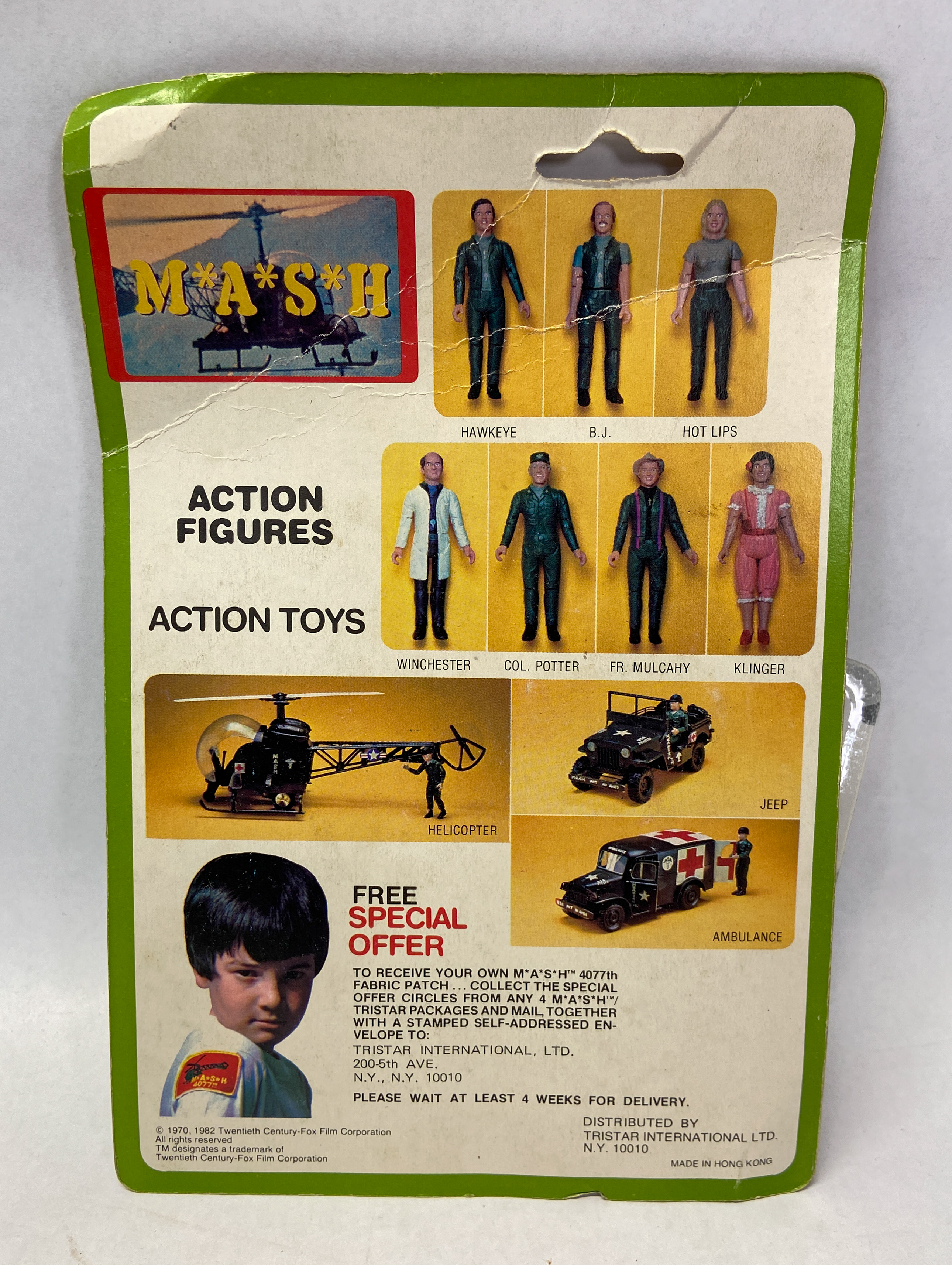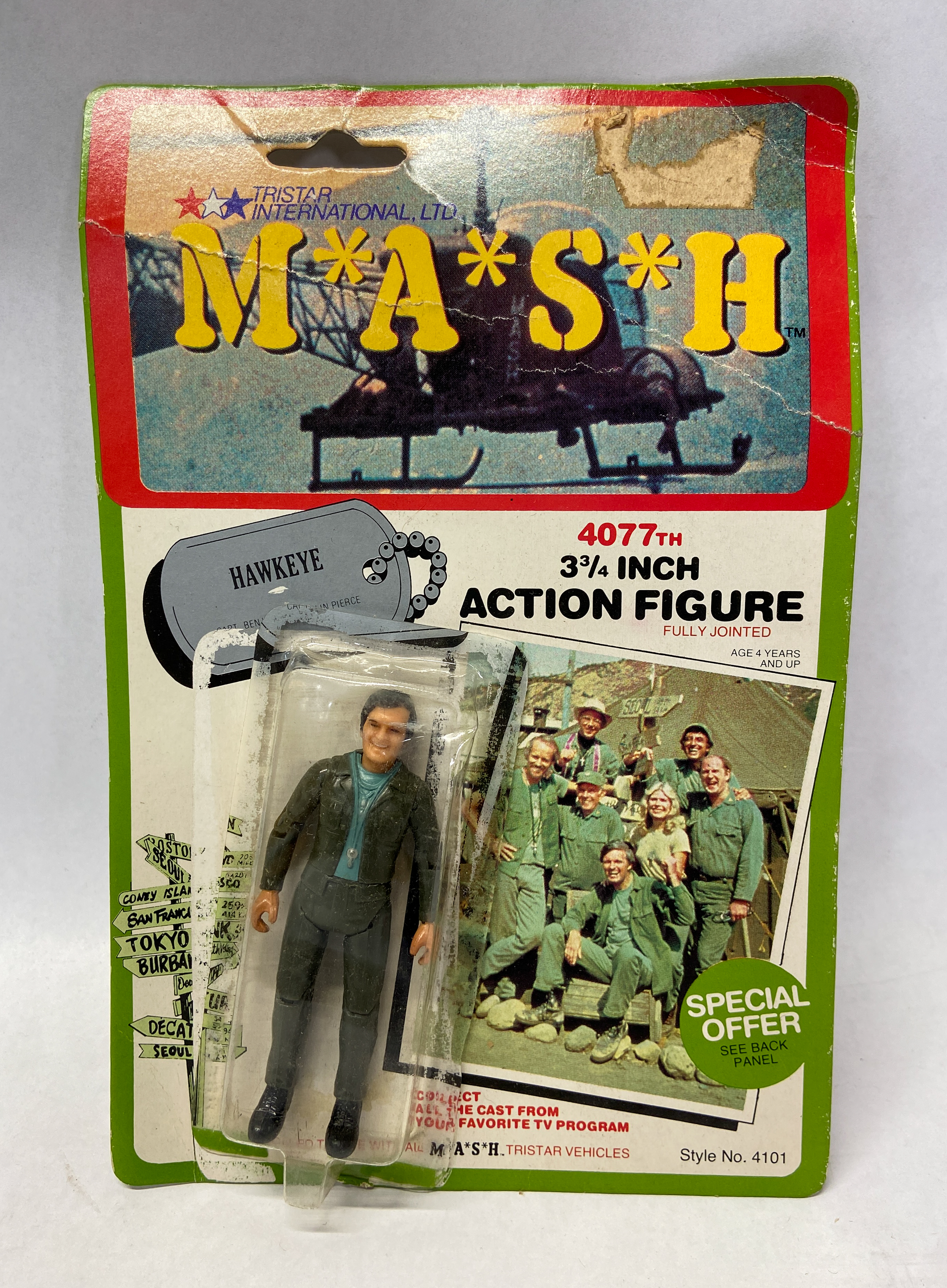 The packaging shows varying degrees of shelf wear consistent with age, including edge wear, corner softening, and creasing. Several cardbacks have price sticker remnants or surface paper loss, most notably a significant tear on the MASH card. The clear plastic blisters show typical yellowing, particularly on the Kenner and Remco items, along with surface scuffing and minor indentations.